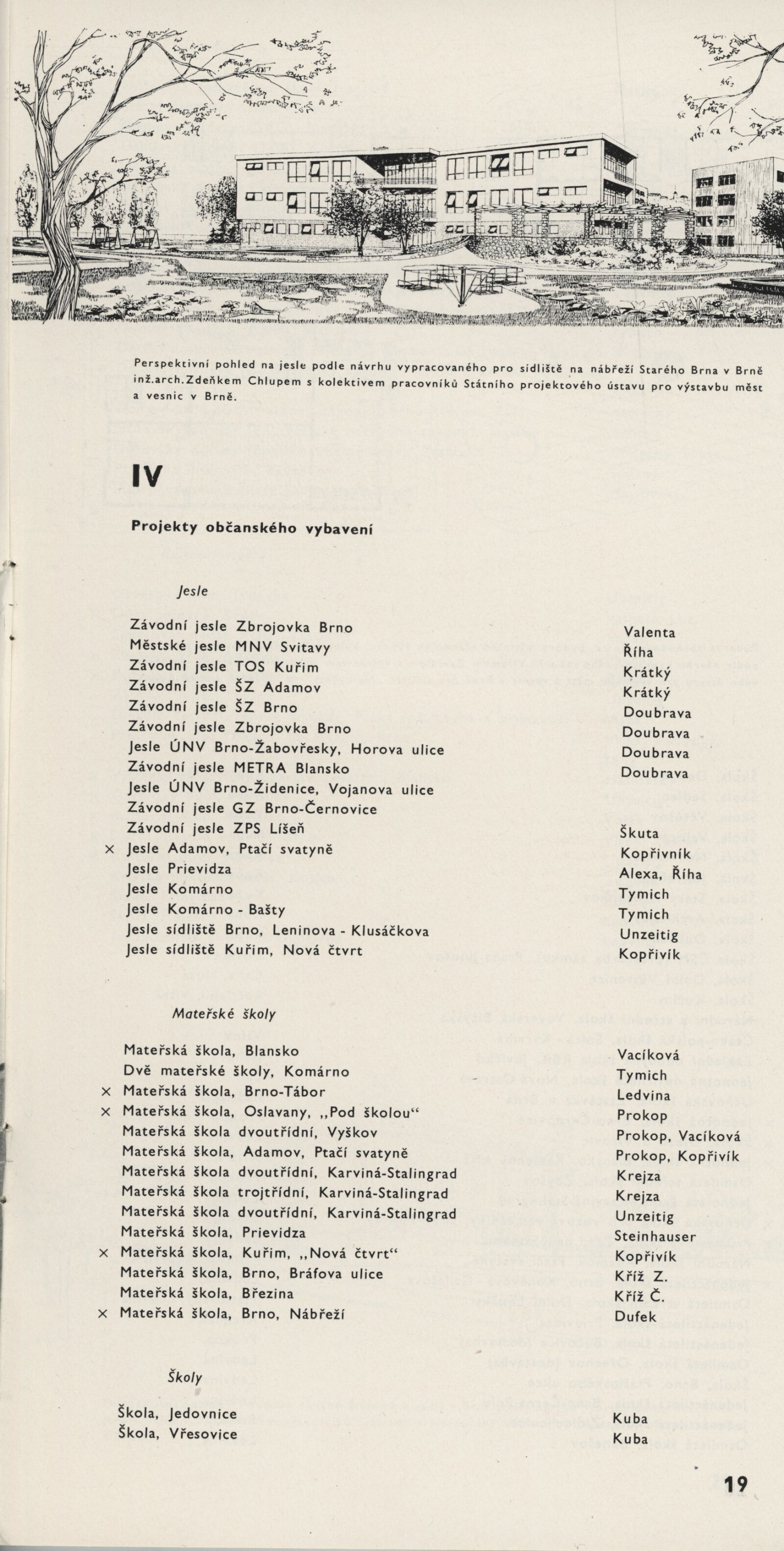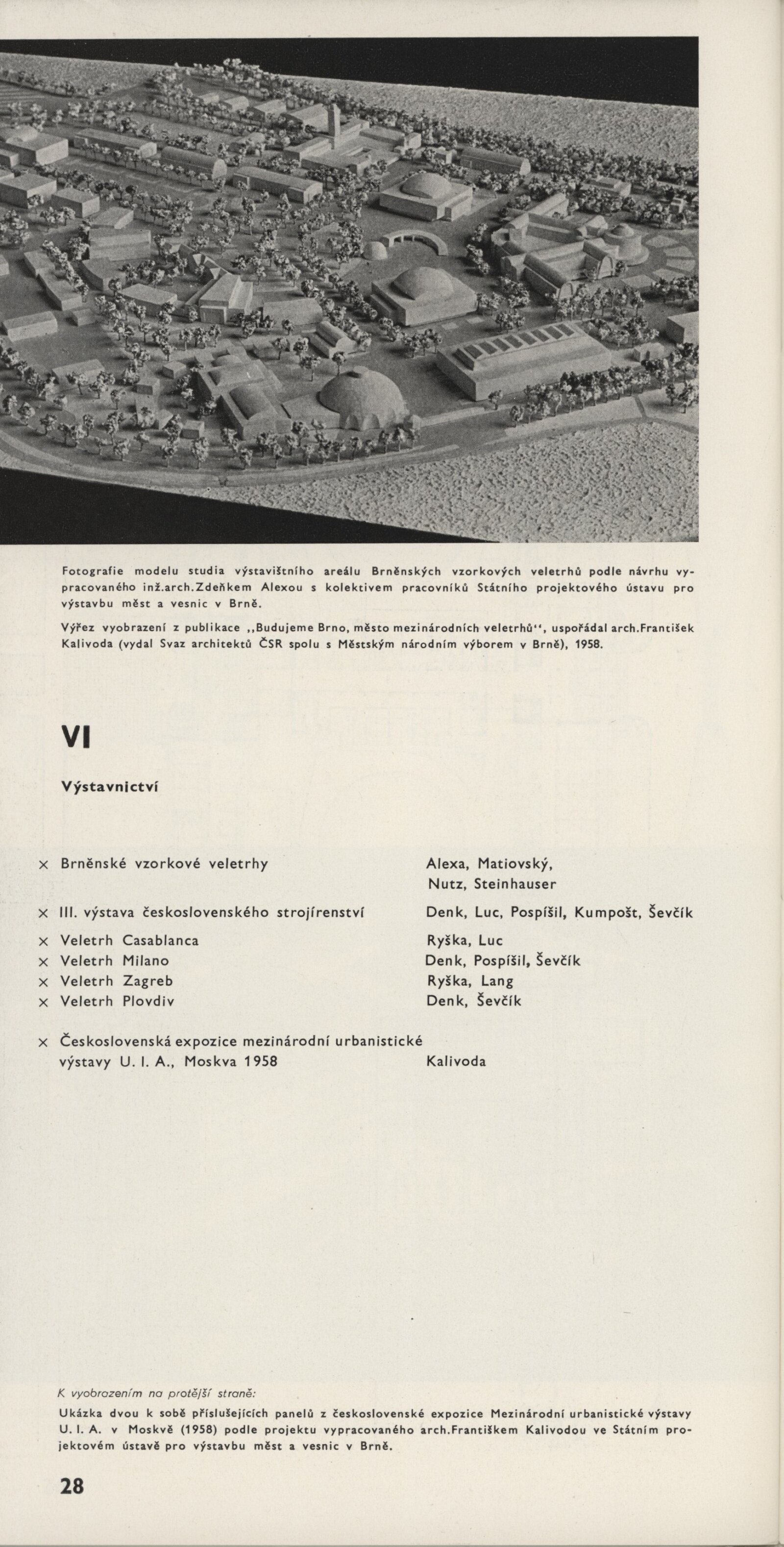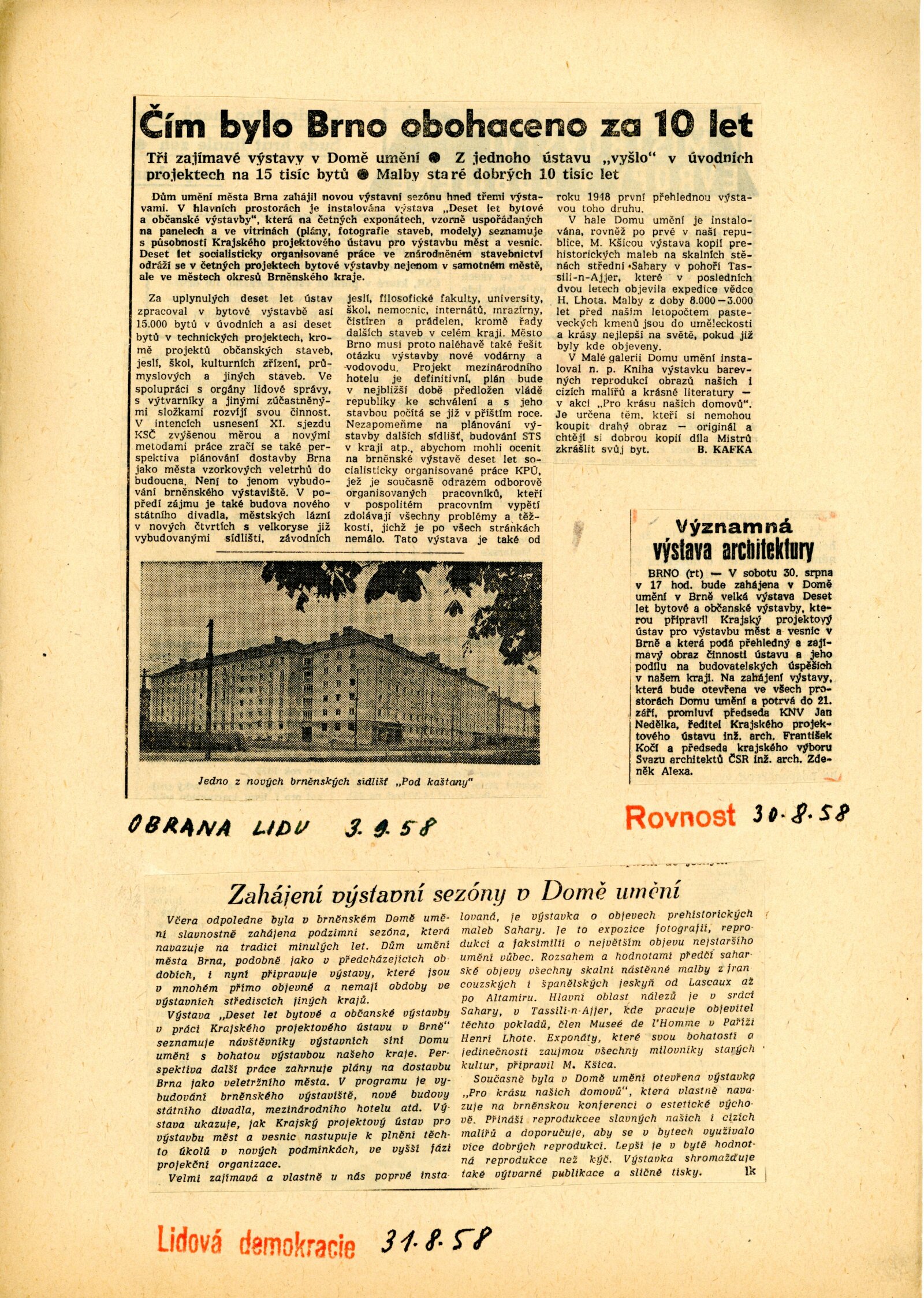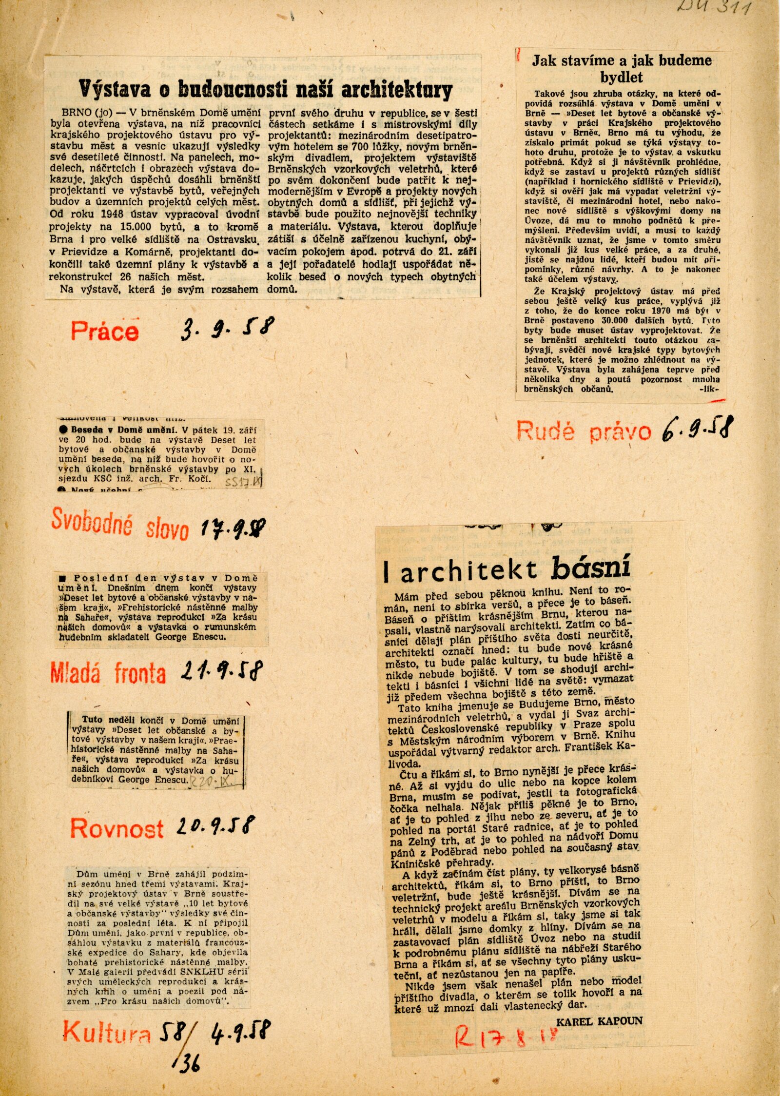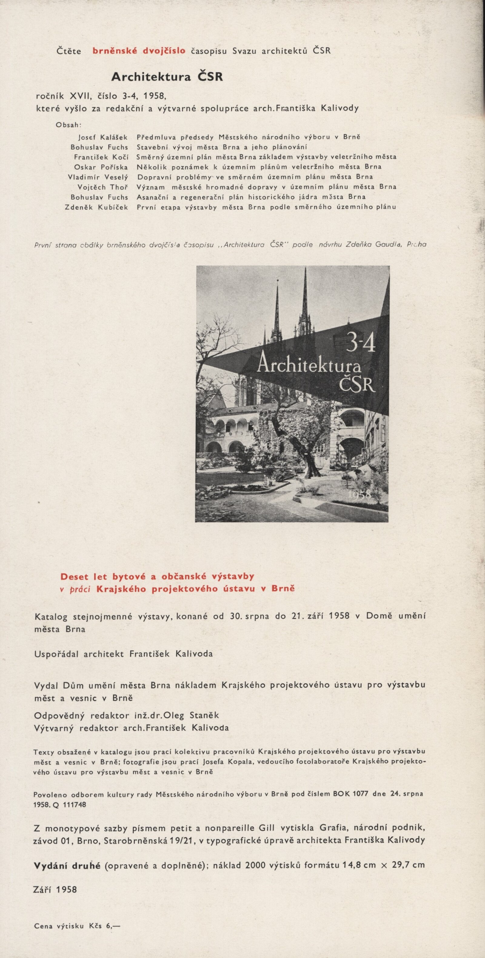Deset let bytové a občanské výstavby v práci Krajského projektového ústavu v Brně, Dům umění města Brna, 30. 8. – 21. 9. 1958 / Text: František Kočí. – Brno: Krajský projektový ústav pro výstavbu měst a vesnic, 1958. – 2 vyd. s tímtéž textem, 2. vydání je doplněné, 30 s. a 31 s., obr., DU 311. – MZK