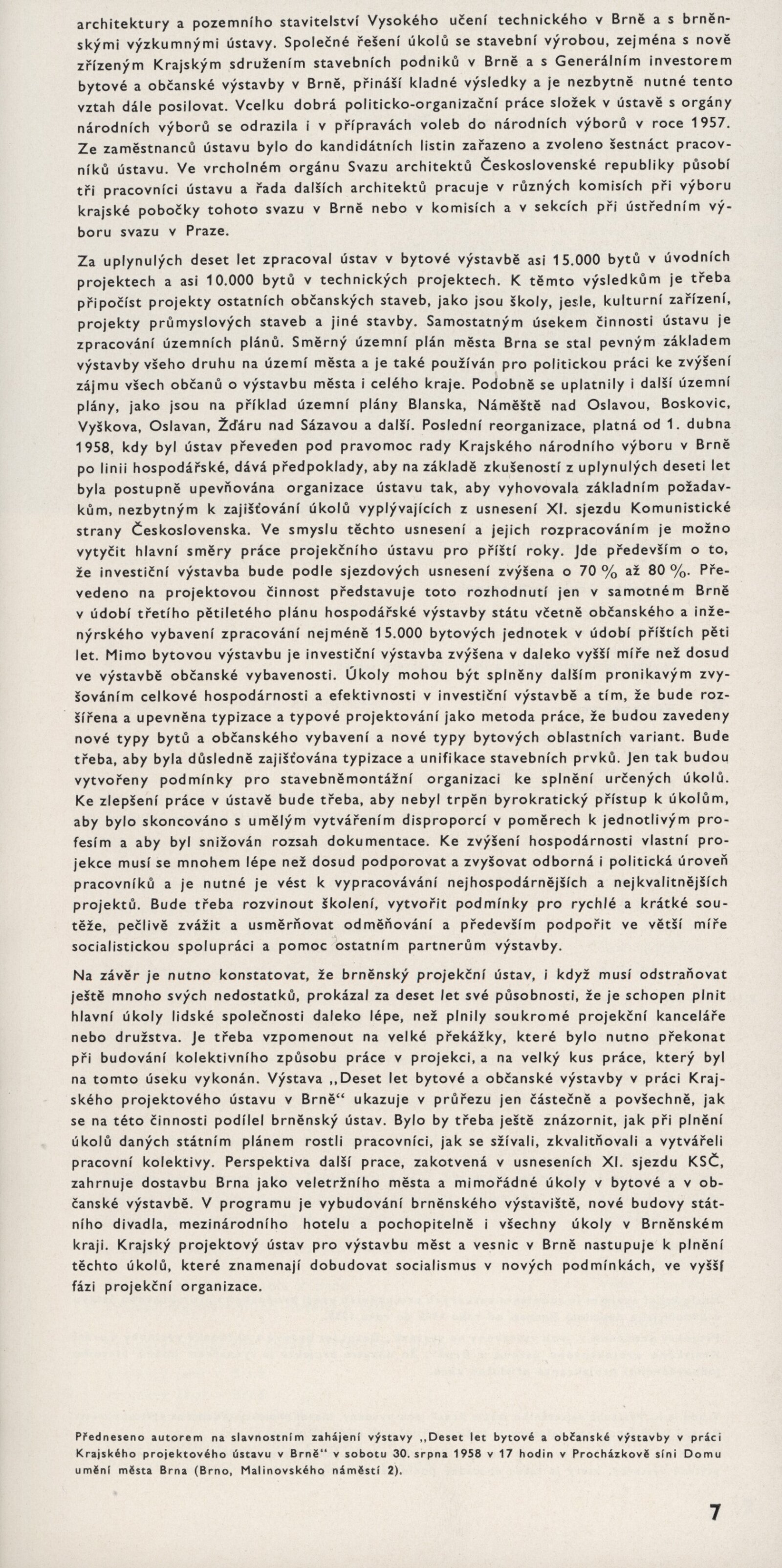 Výstavu zahájili Jan Nedělka, Ing. arch. František Kočí, Ing. arch. Zdeněk Alexa. Projektantem výstavy byl arch. Josef Luc. Proběhly tři doprovodné přednášky: 5. 9. 1958 – Ing. Arch. František Kočí, ing. arch. Zdeněk Chlup, ing. arch. Evžen Škaroda a ing. Dr. Oleg Staněk: V. mezinárodní kongres U. I. A. v Moskvě 1958, 12. 9. 1958 – Jaroslav Slíva a Ing. arch. Josef Balák: Výstavba v Brněnském kraji, 19. 9. 1958 – Ing. arch. František Kočí: Nové úkoly výstavby města Brna po XI. sjezdu KSČ.