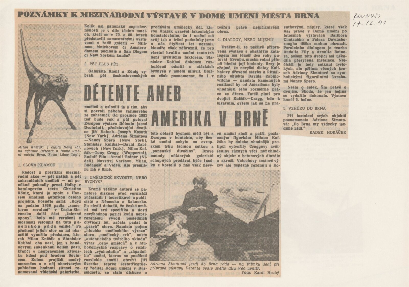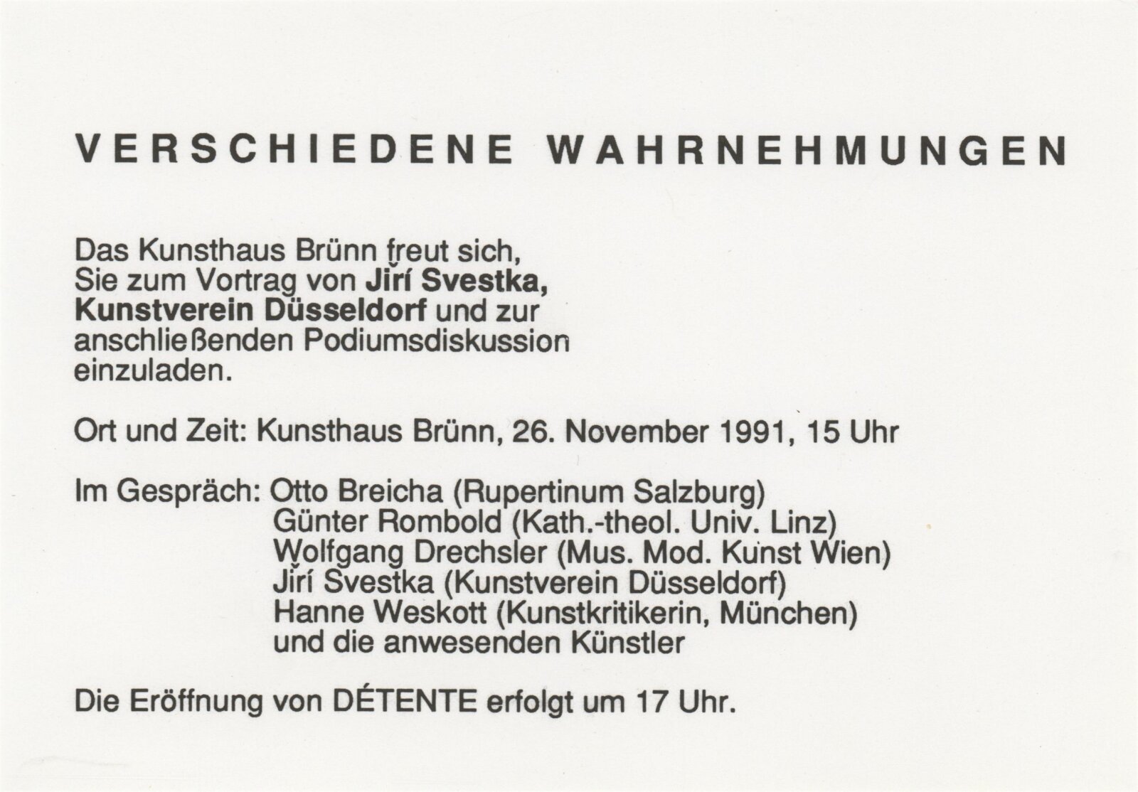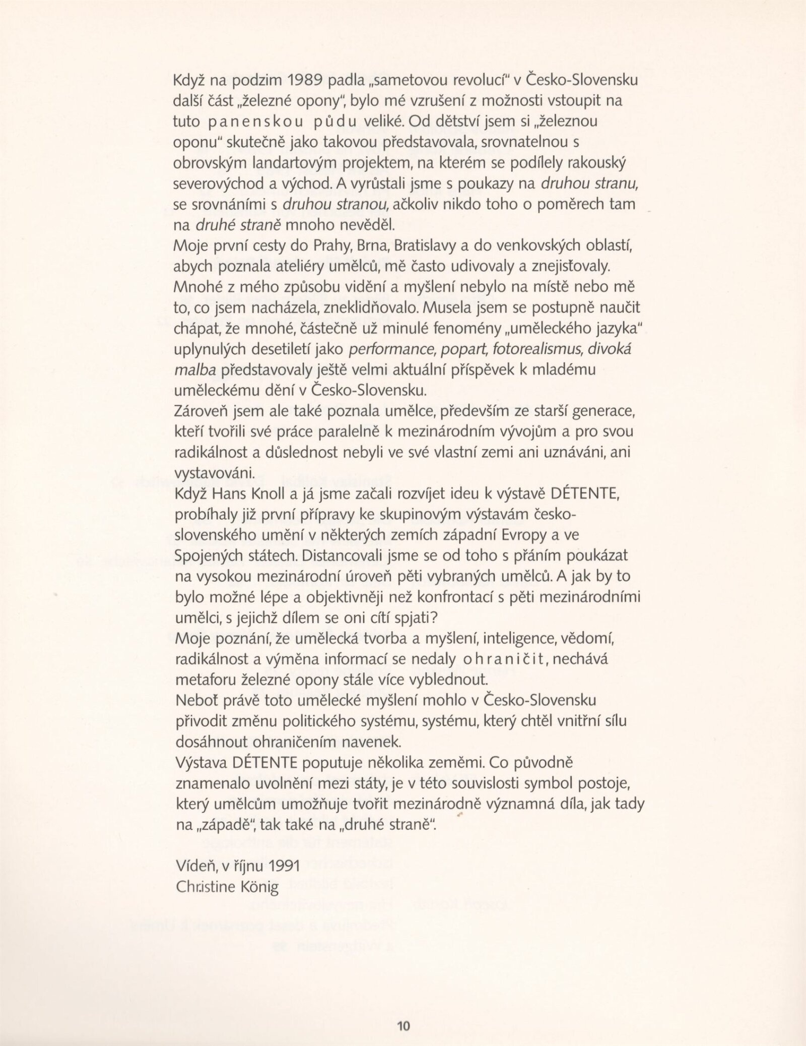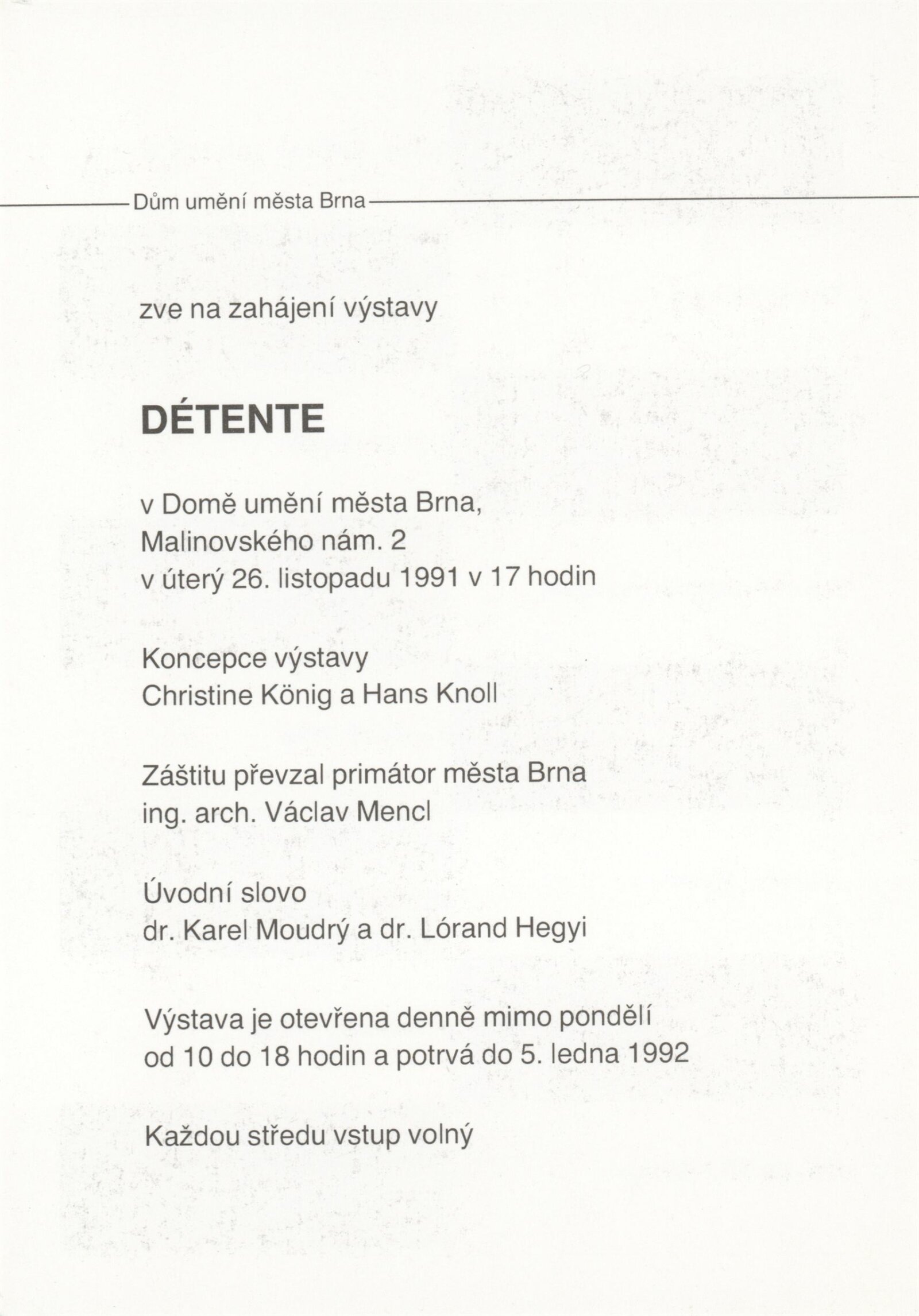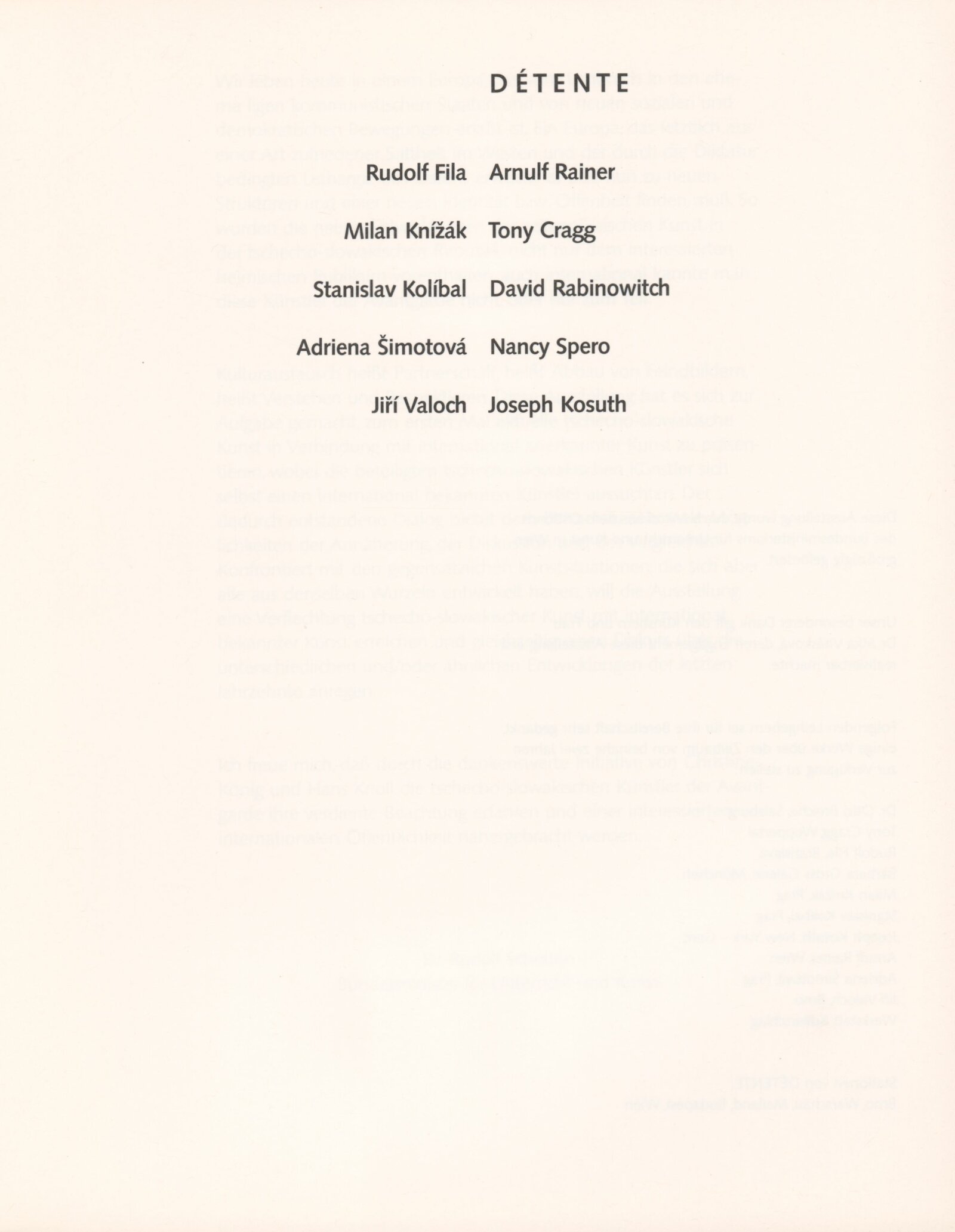Détente: Dům umění města Brna, 1. patro, 26. 11. 1991 – 5. 1. 1992 / Převzatý katalog. Putovní výstavy Détente / Text: Rudof Scholten, Christine König, Hans Knoll a další. – Wien: Ostfond des Bundesministeriums für Unterricht und Kunst, 1991. – 112 s., obr., životní data, výstavy vystavujících 10 autorů, DU 913