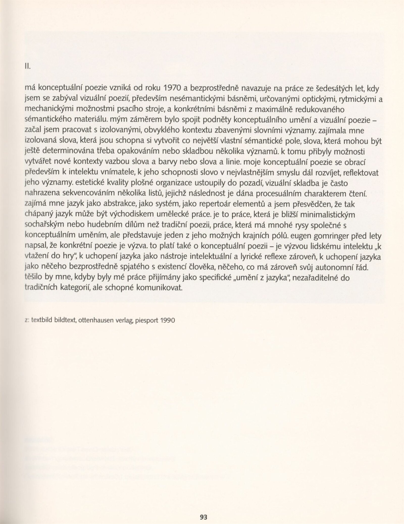 pozvánka na výstavu a přednášku Jiřího Švestky, katalog, tiskové zprávy, texty katalogu, báseň a text Igora Zhoře (Stanislav Kolíbal, Rudolf Fila, 1985), návrh instalace výstavy, podklady k realizaci výstavy, fotografie některých děl, seznam vystavených děl, pojistné seznamy děl autorů, provozní korespondence, celní záznamy, korespondence se zúčastněnými umělci, smlouvy, souhlas s převzetím záštity nad výstavou od primátora města Brna, koncepce a organizace připravovaného mezinárodního projektu, recenze v tisku, gallery guide (1992), digitalizovaný videozáznam z výstavy (VHS)