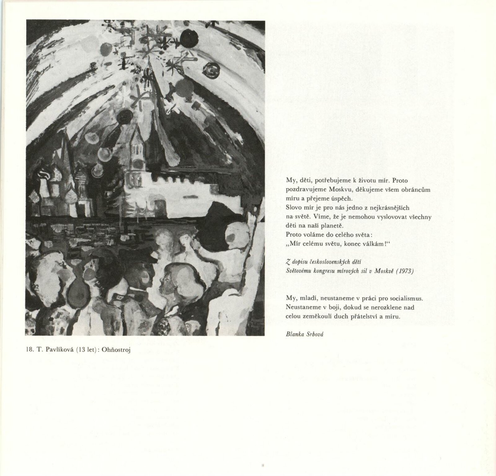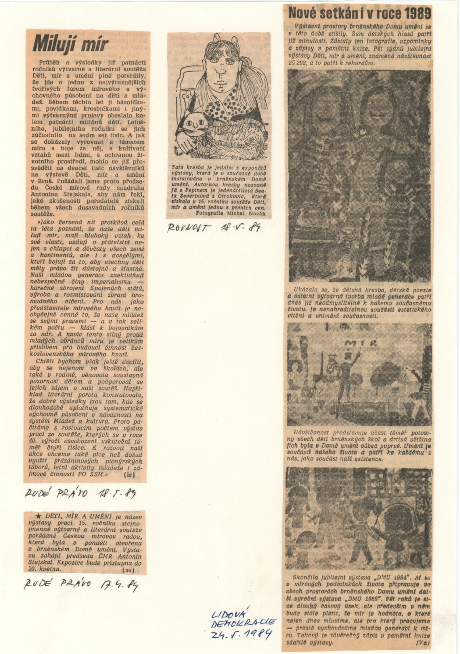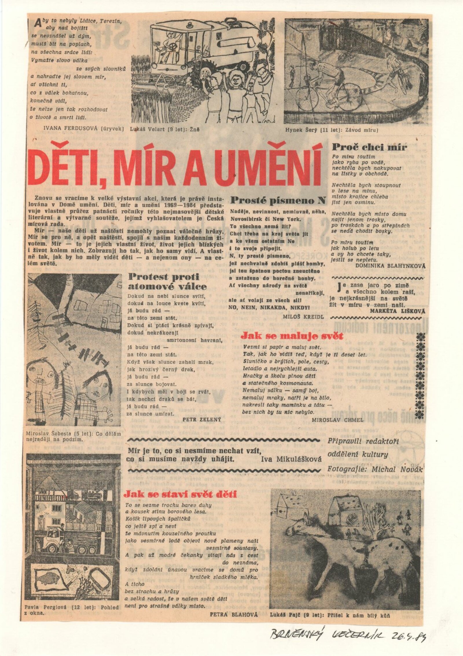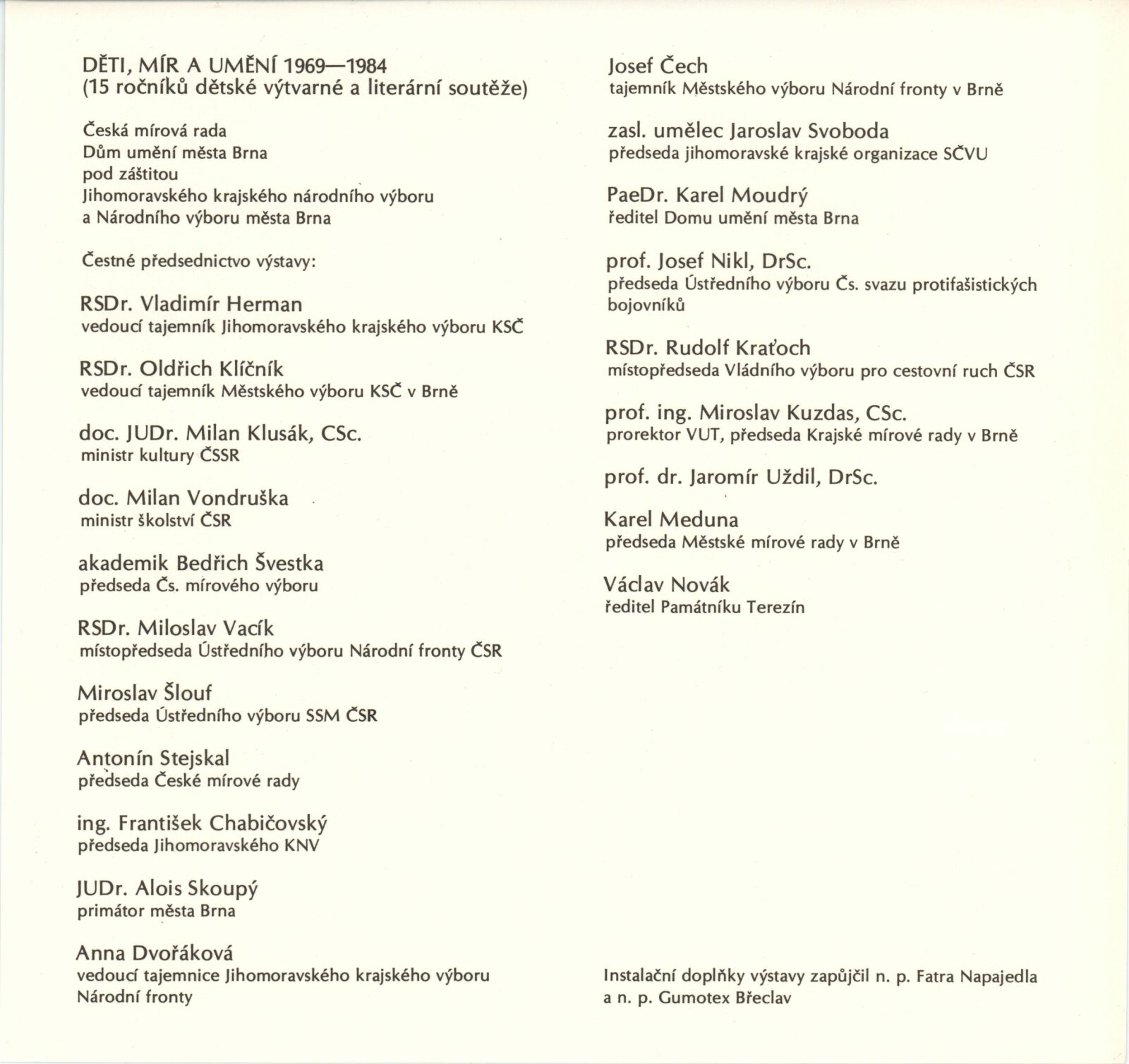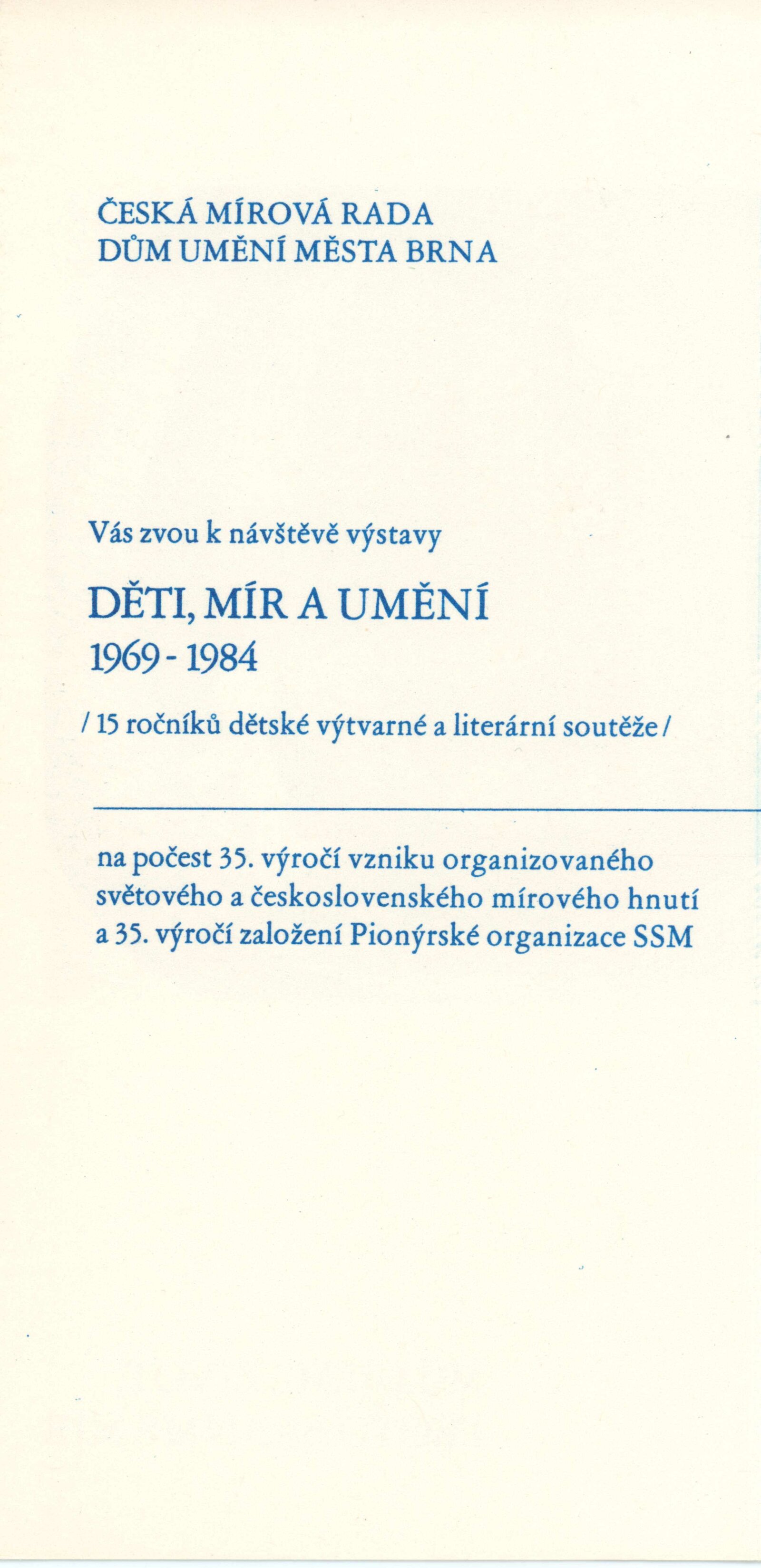 Děti, mír a umění. 1969–1984. 15 ročníků dětské výtvarné a literární soutěže: Dům umění města Brna, 1. patro, 16. 4. – 20. 5. 1984 / Text: Antonín Stejskal, výběr literárních textů dětí. – Brno: Česká mírová rada, 1984. – 32 s., obr., DU 783. – MZK; MG
