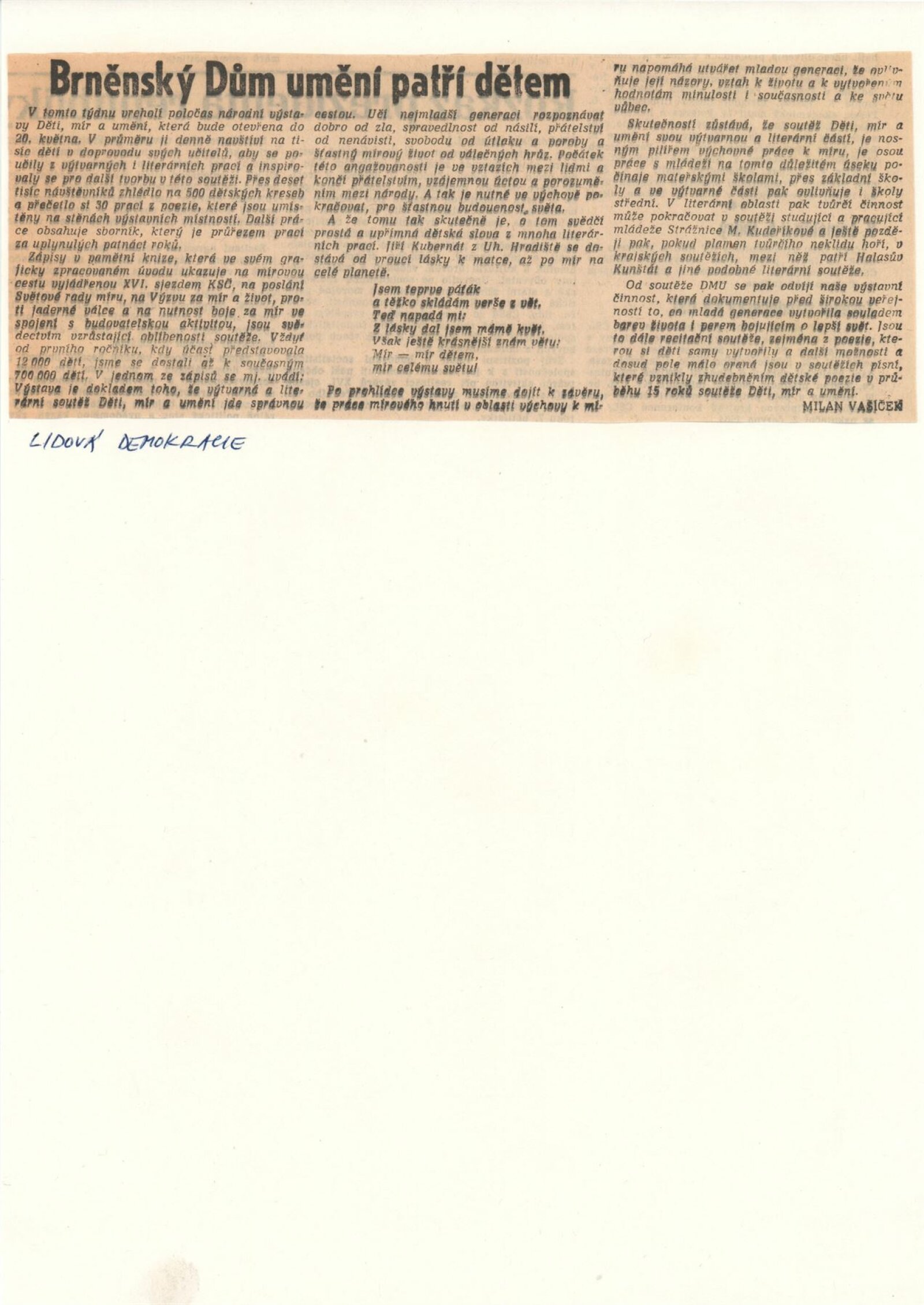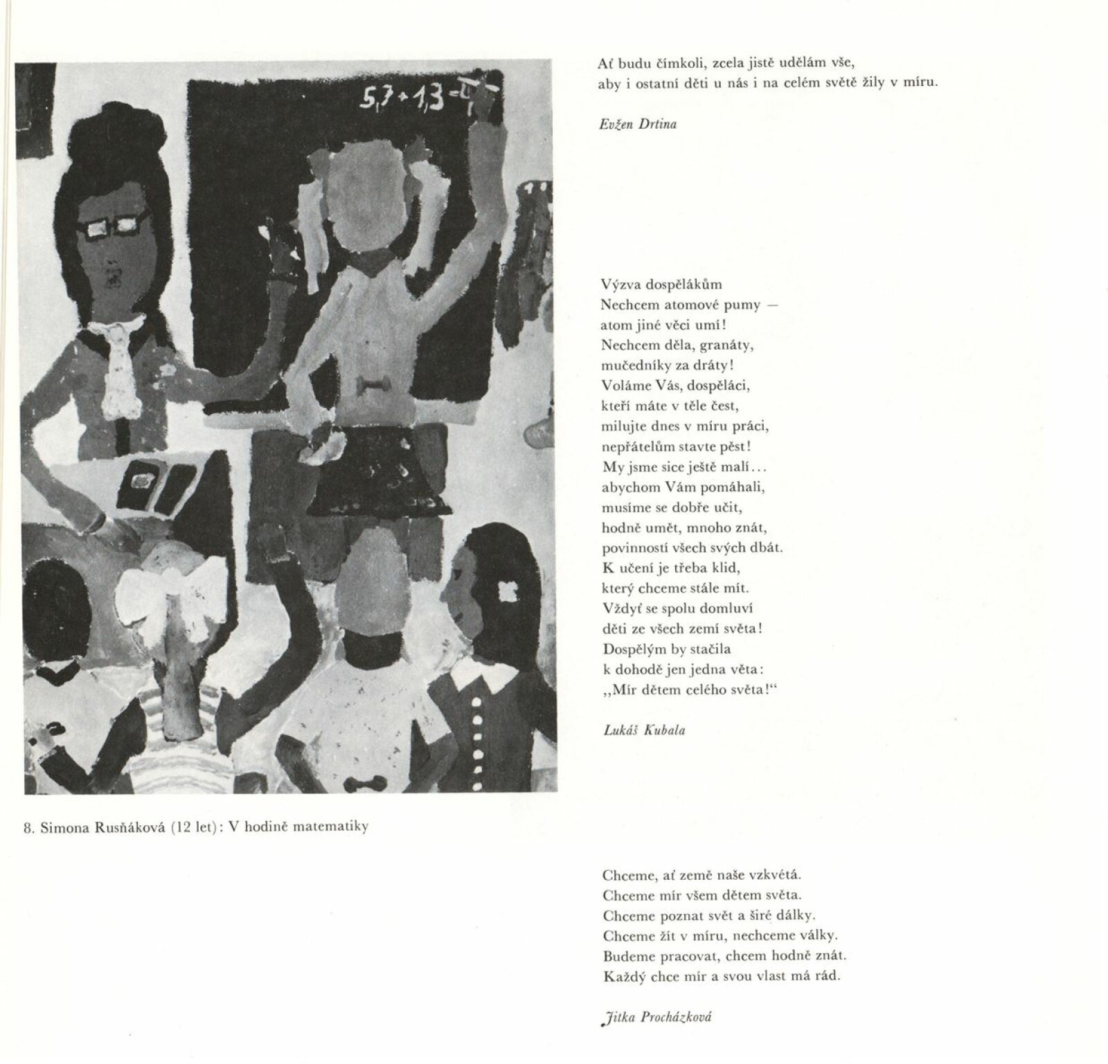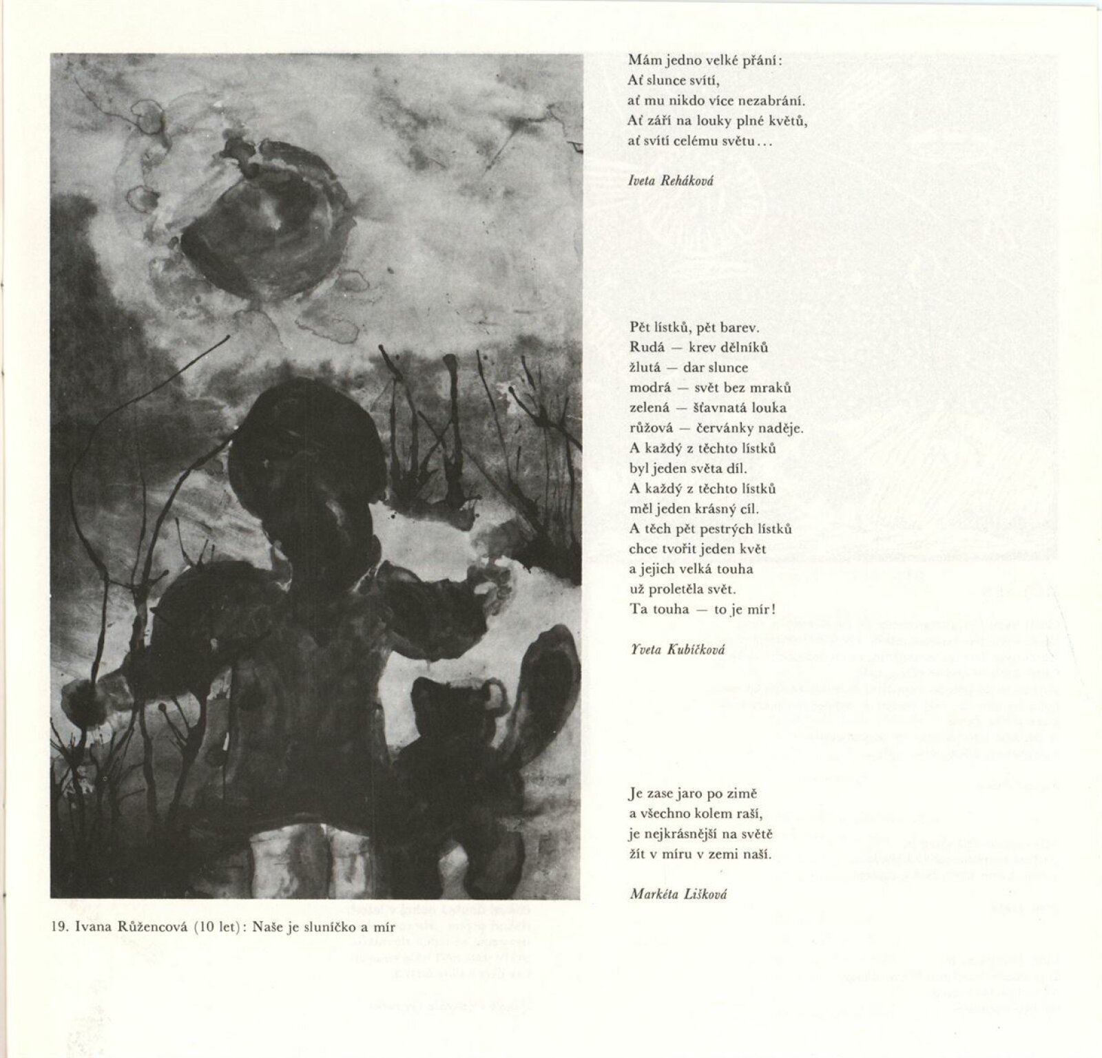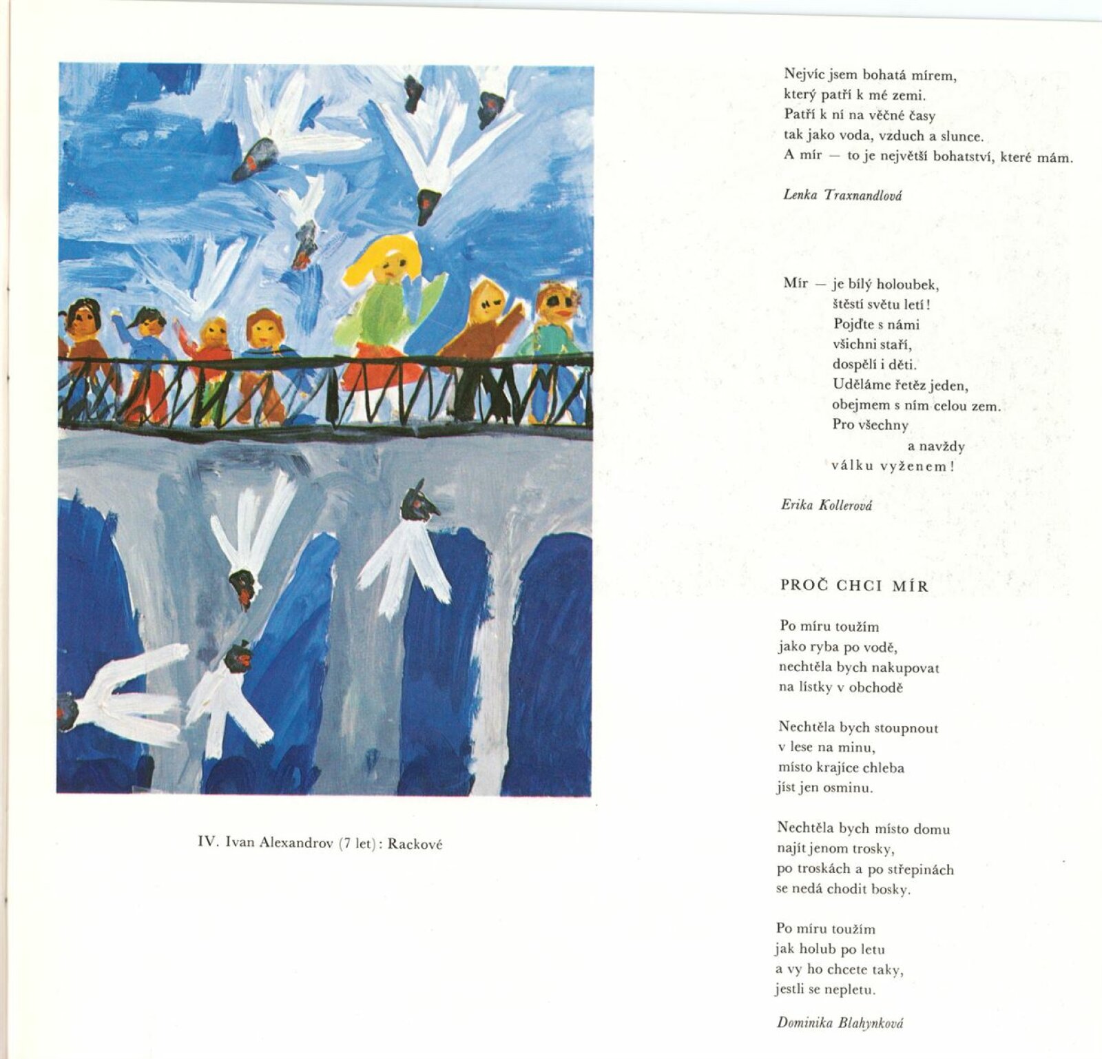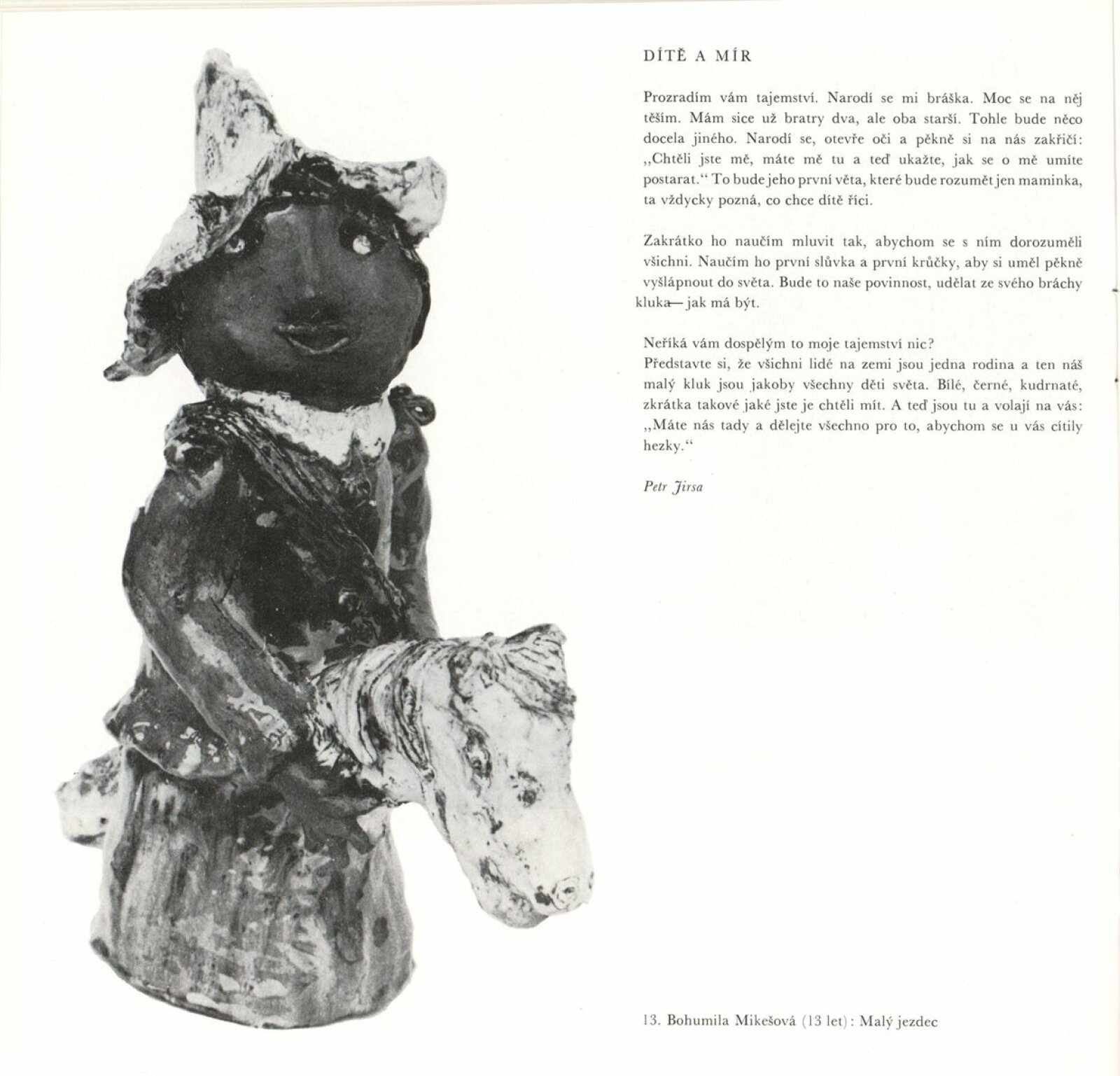 Děti, mír a umění. 1969–1984. 15 ročníků dětské výtvarné a literární soutěže: Dům umění města Brna, 1. patro, 16. 4. – 20. 5. 1984 / Text: Antonín Stejskal, výběr literárních textů dětí. – Brno: Česká mírová rada, 1984. – 32 s., obr., DU 783. – MZK; MG