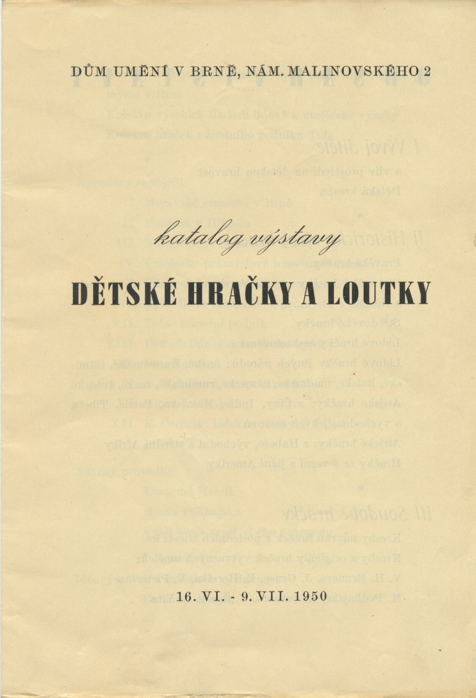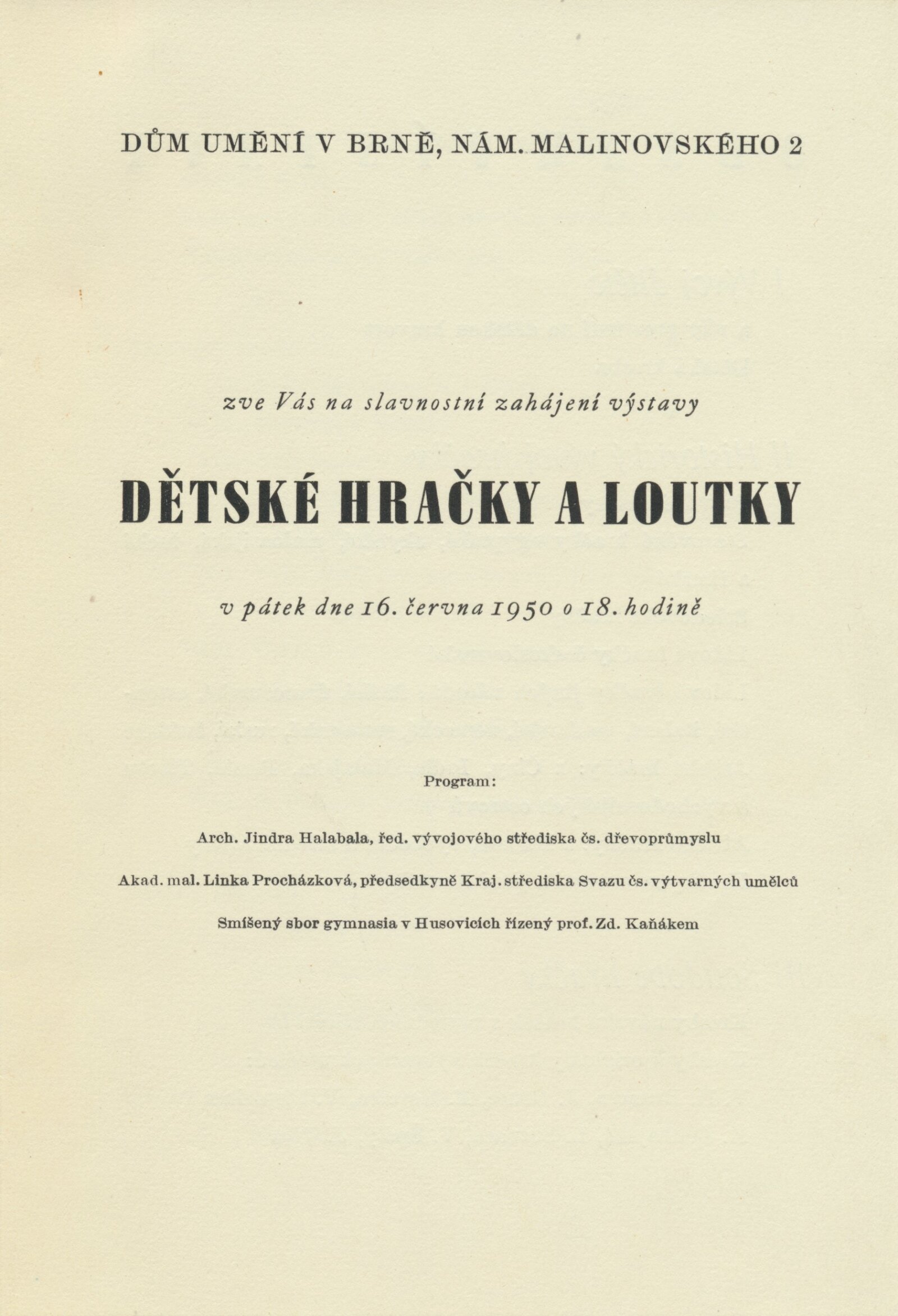 Dětské hračky a loutky: Dům umění v Brně, 16. 6. – 9. 7. 1950 / Brno: Dům umění, 1950. – 3 s., DU 137. – UPM