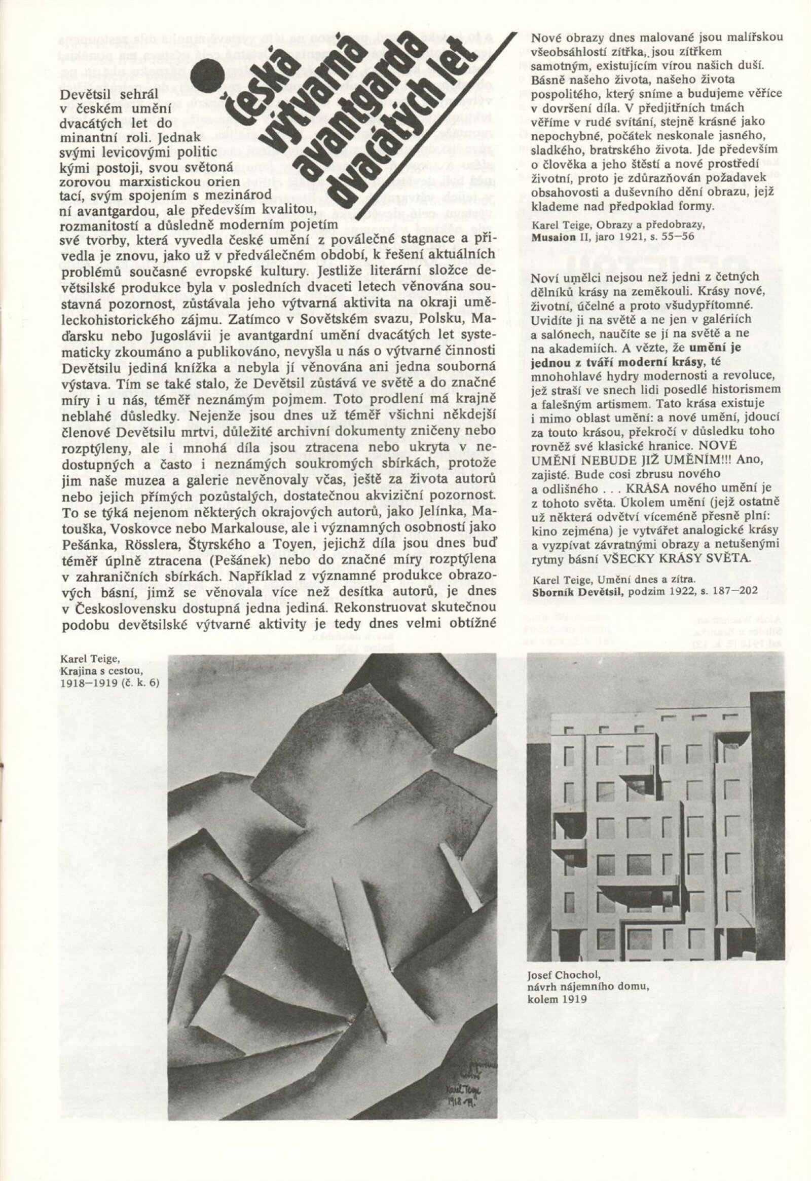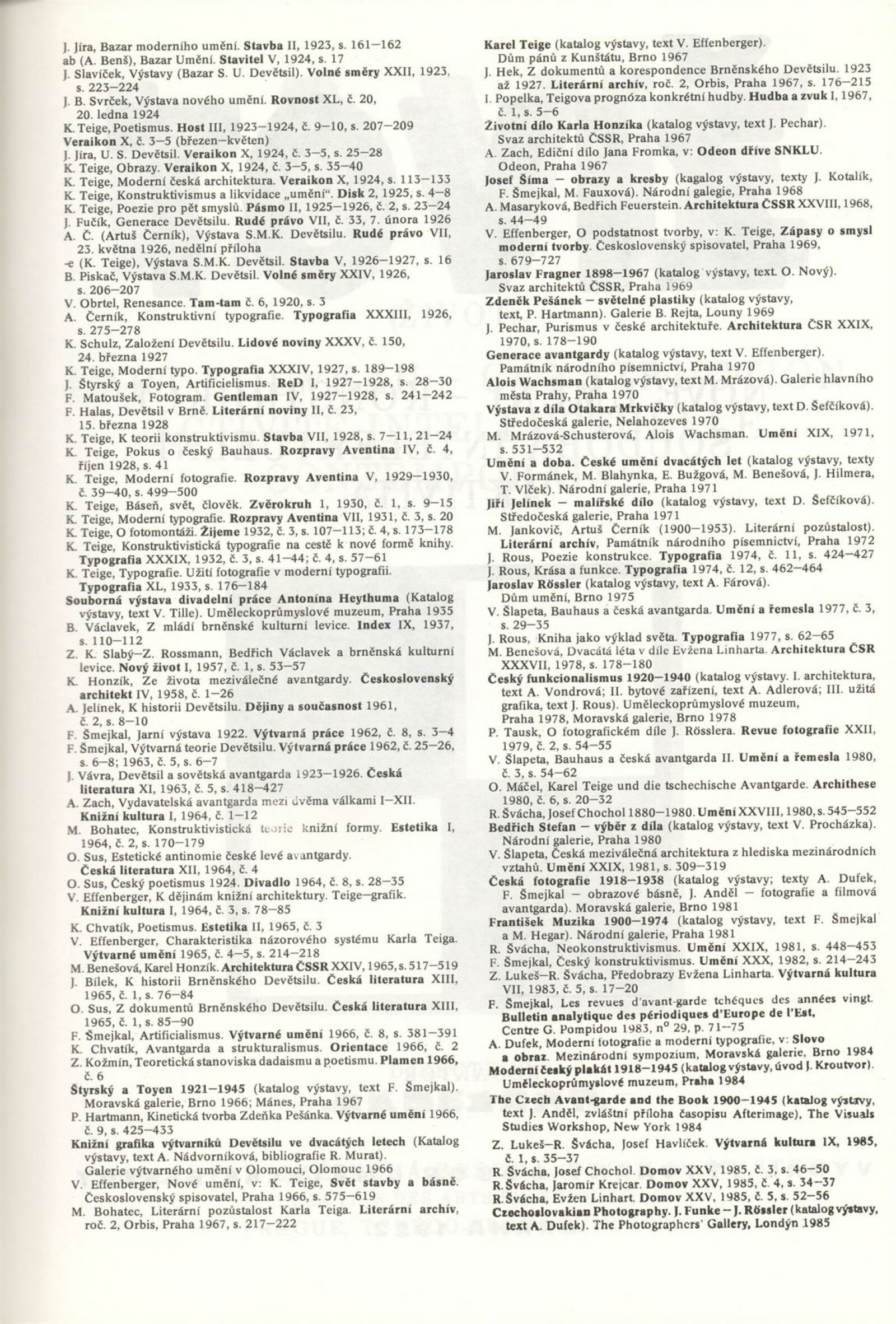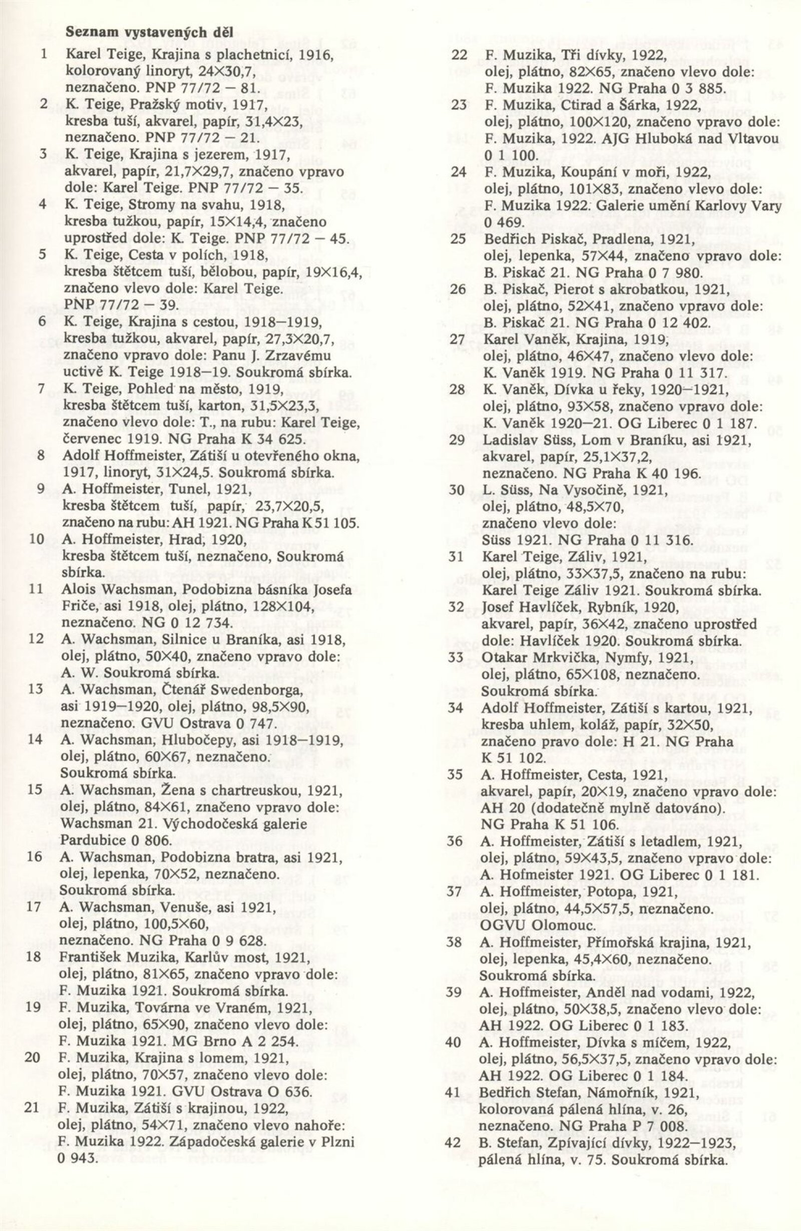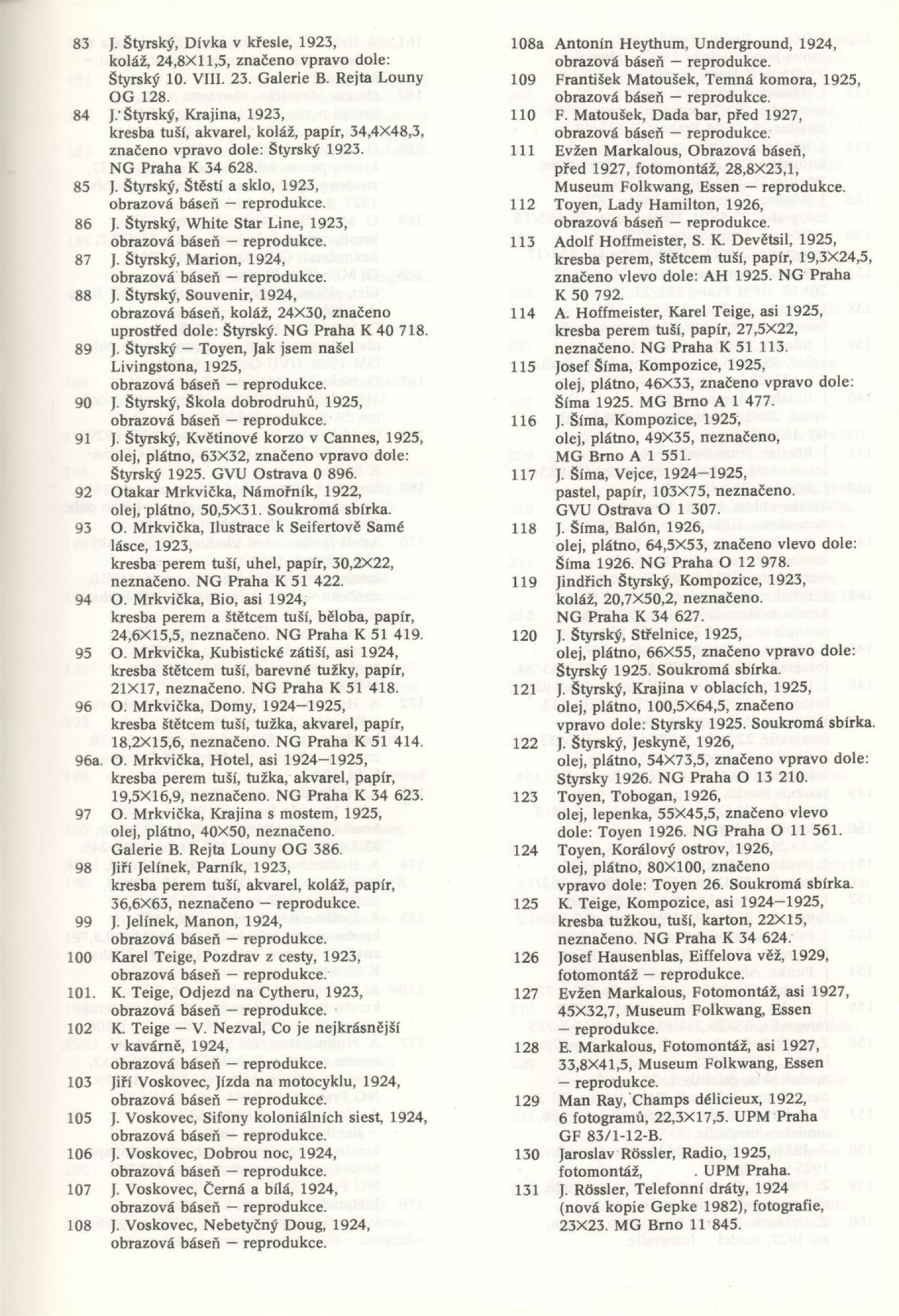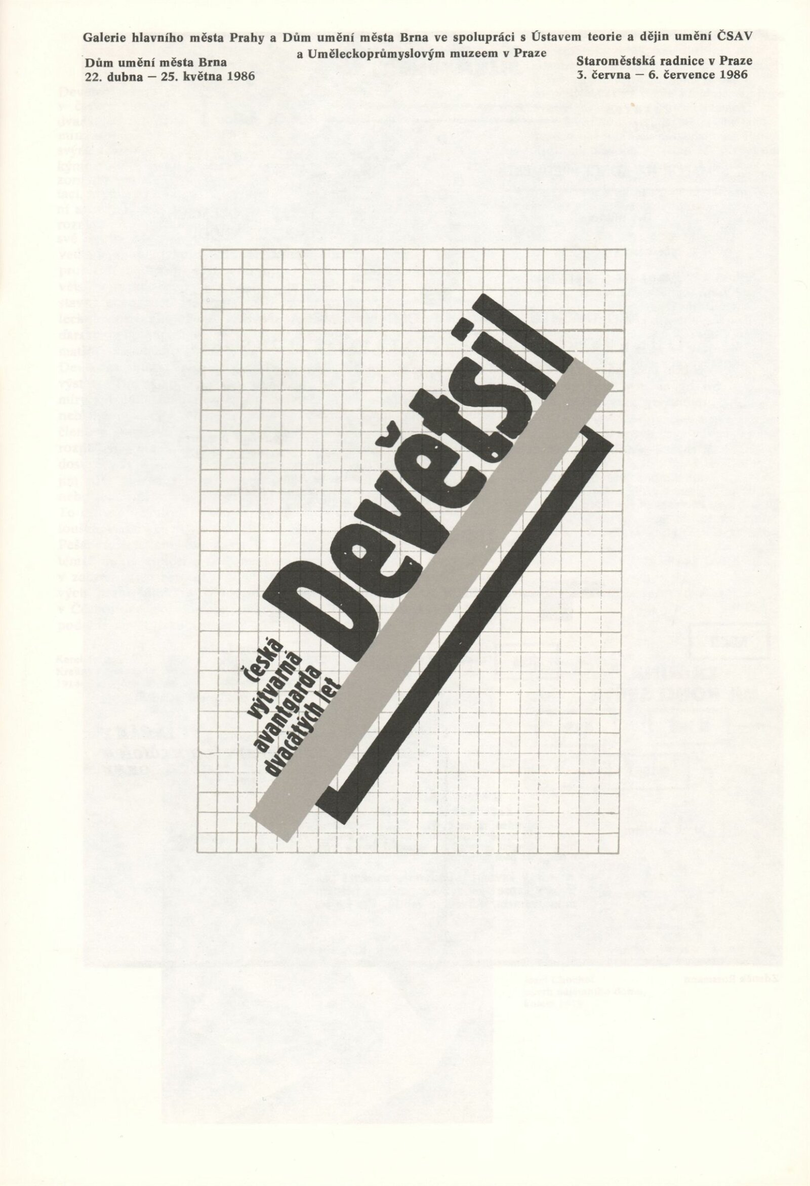 Devětsil. Česká výtvarná avantgarda dvacátých let: Dům umění města Brna, 22. 4. – 25. 5. 1986 / Texty: František Šmejkal, Rostislav Švácha, Jan Rous. – Praha: Galerie hlavního města Prahy, 1986. – [80] s., obr., překlad resumé [4] s., bibliografie, DU 821. – MG