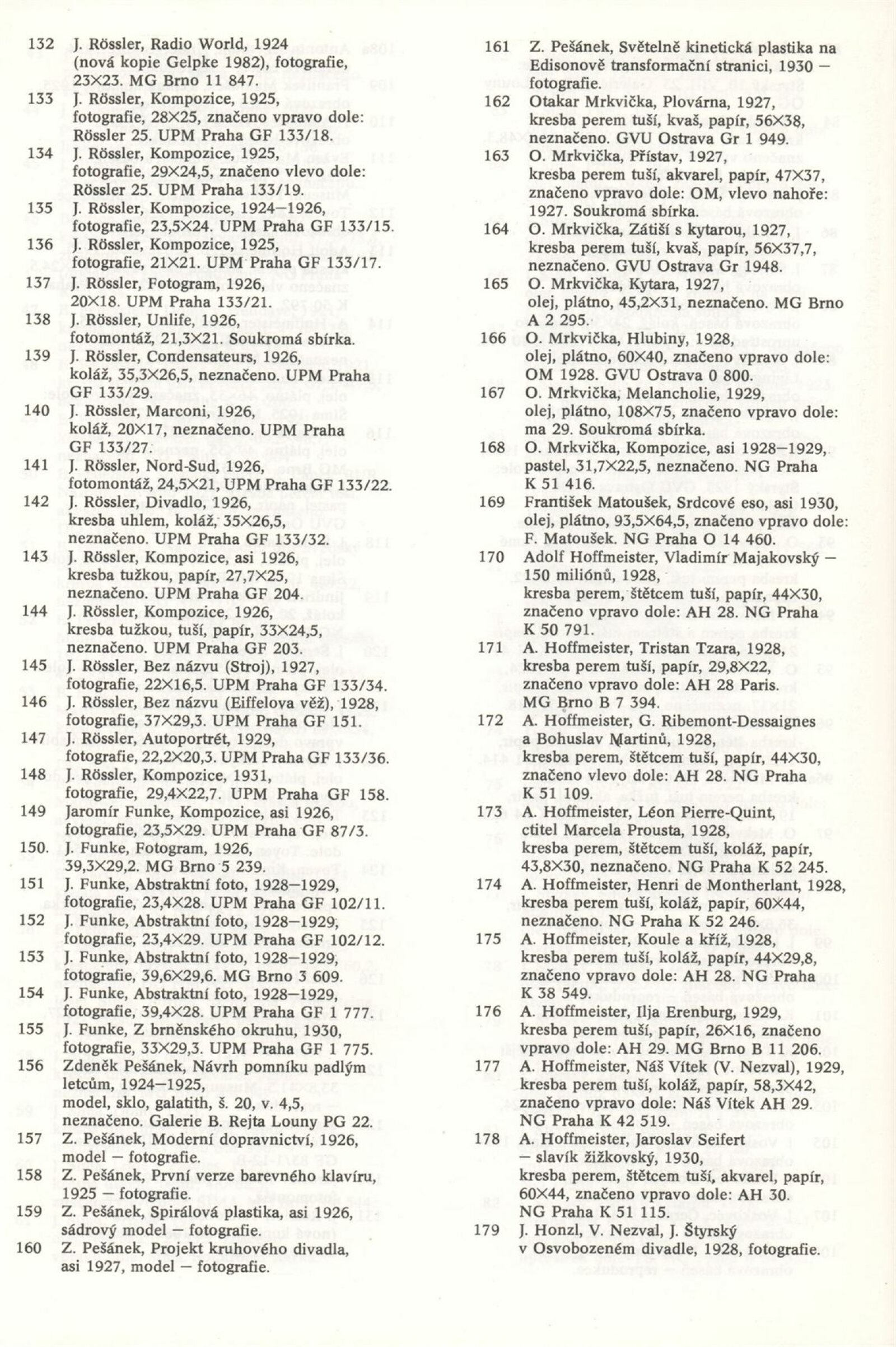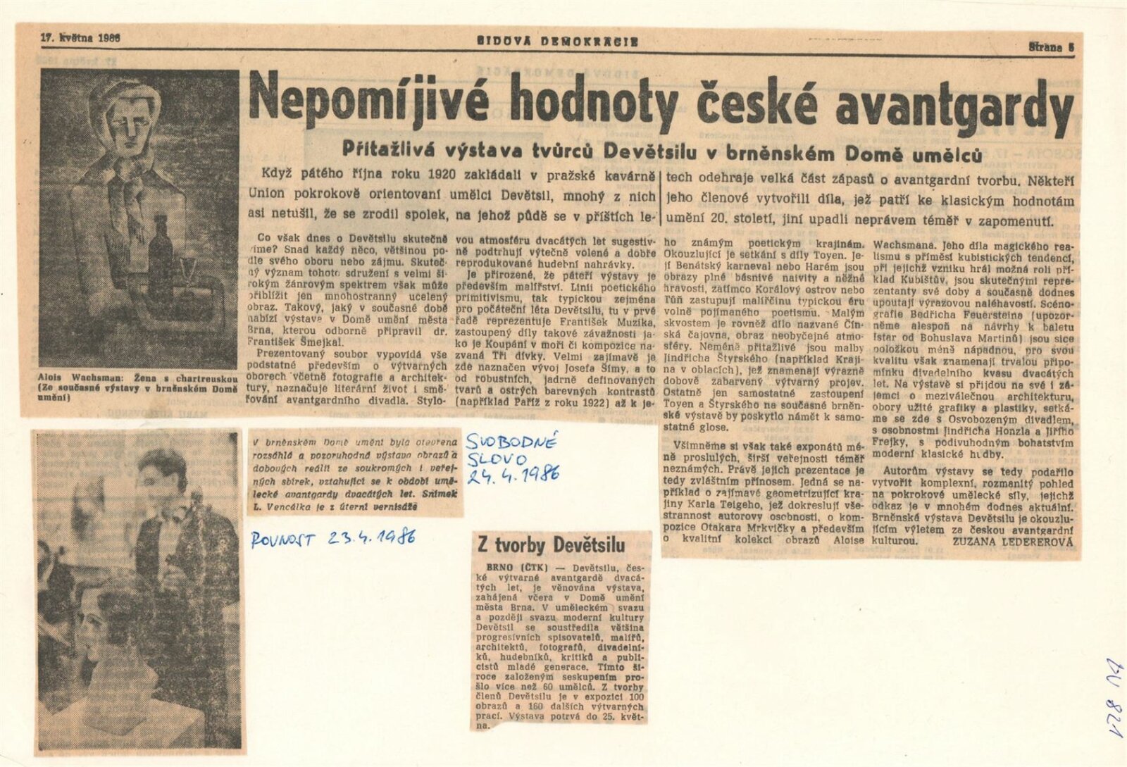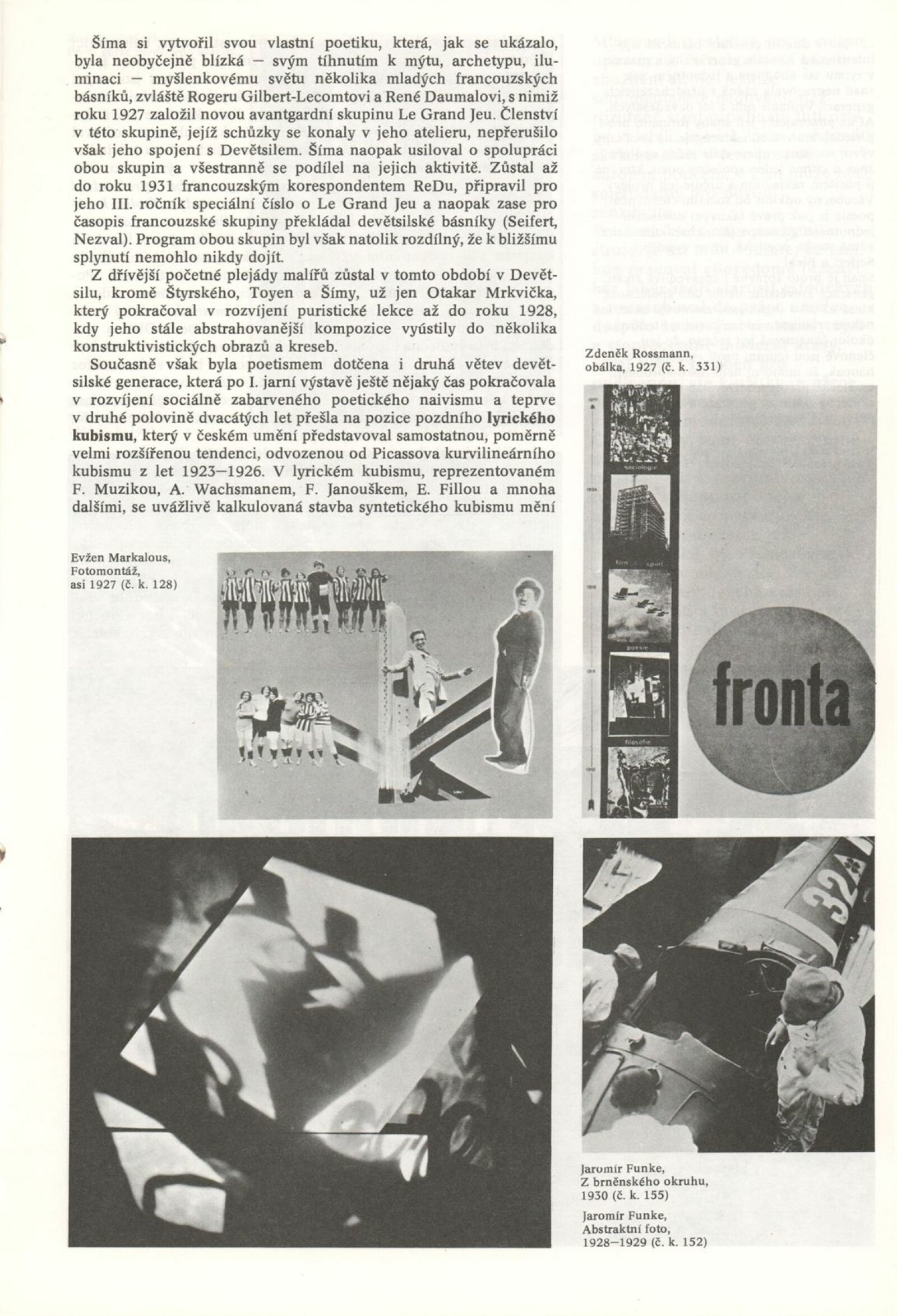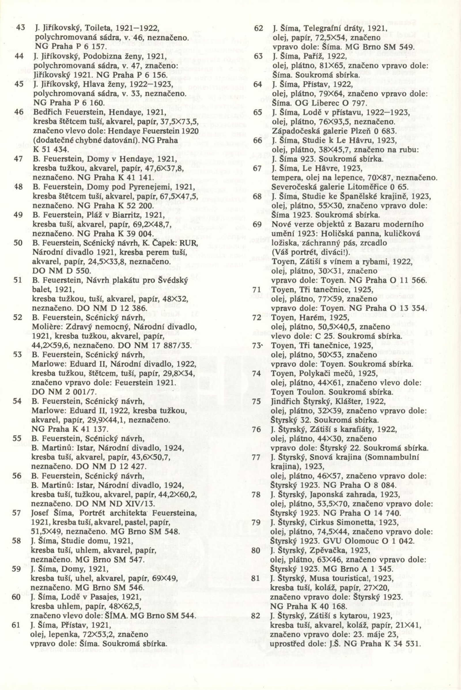 Devětsil. Česká výtvarná avantgarda dvacátých let: Dům umění města Brna, 22. 4. – 25. 5. 1986 / Texty: František Šmejkal, Rostislav Švácha, Jan Rous. – Praha: Galerie hlavního města Prahy, 1986. – [80] s., obr., překlad resumé [4] s., bibliografie, DU 821. – MG