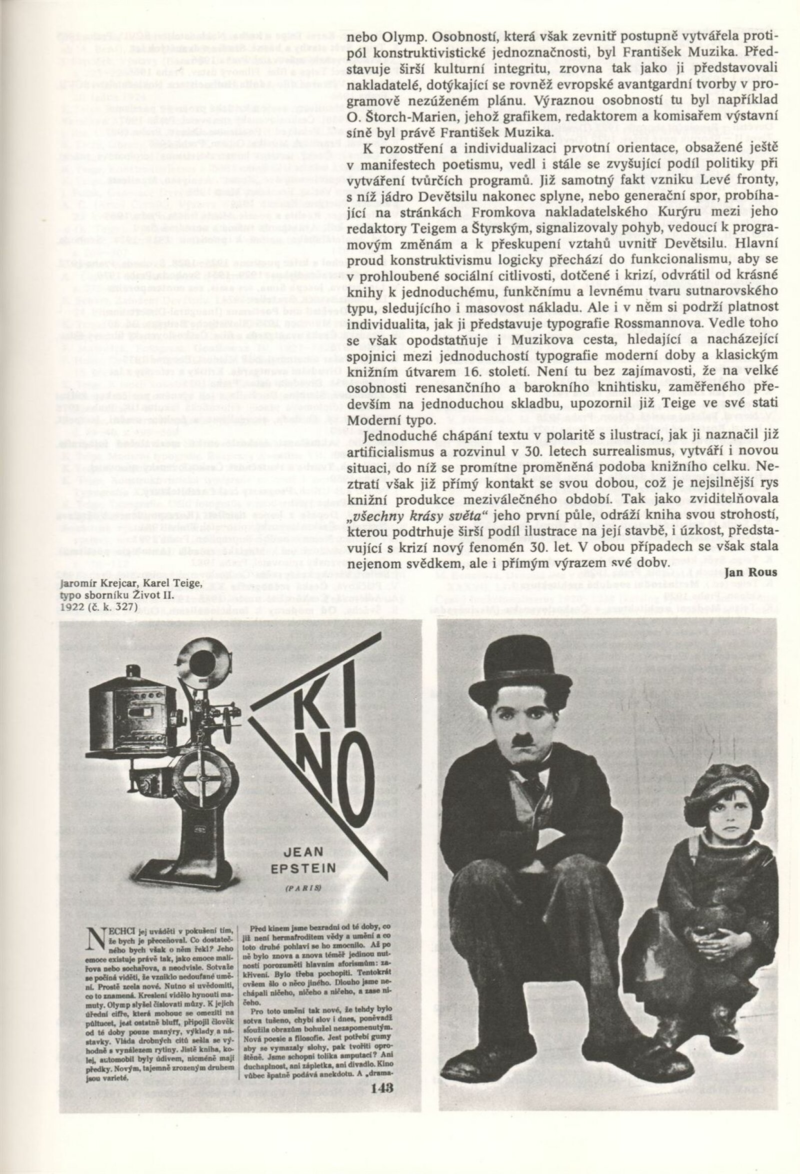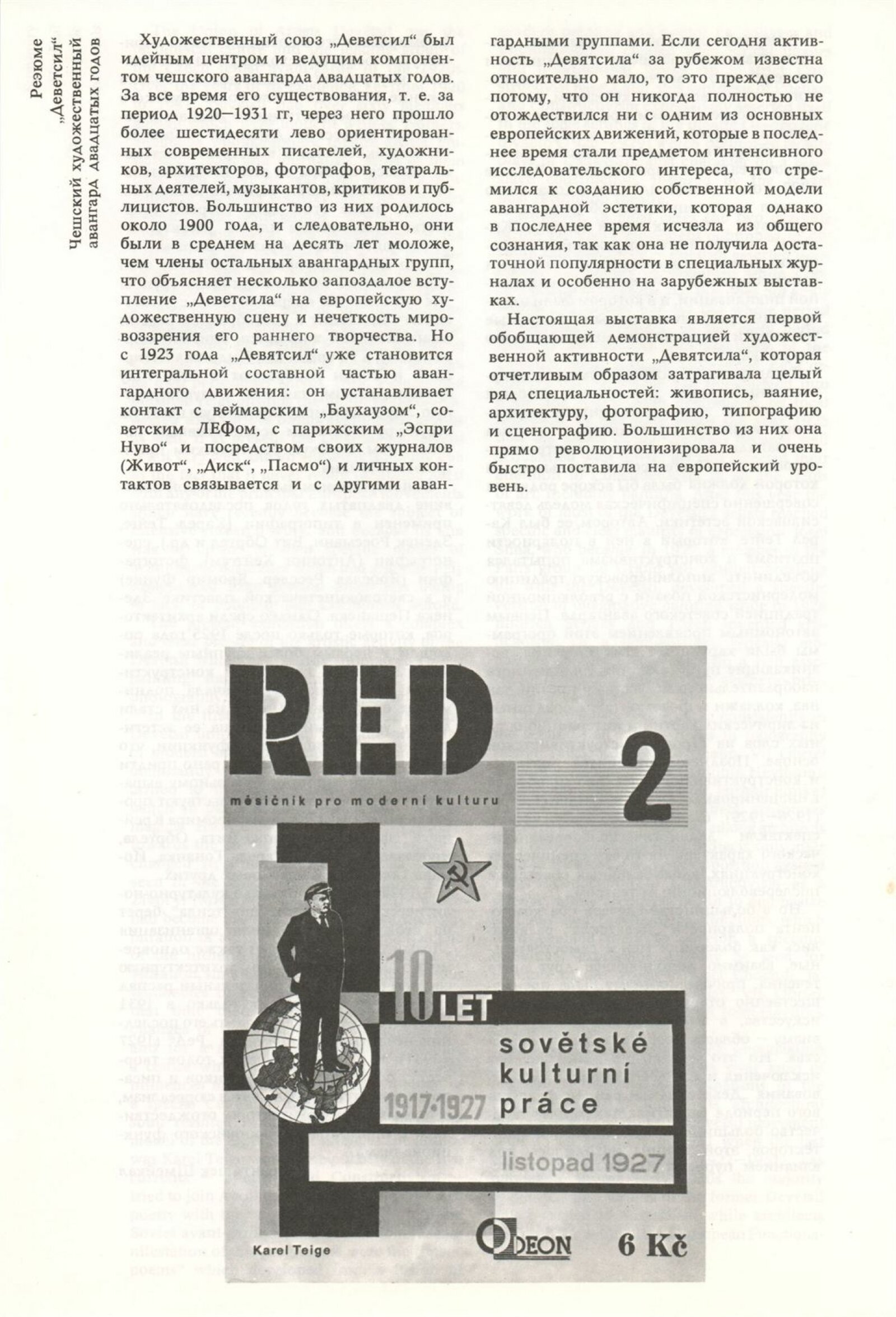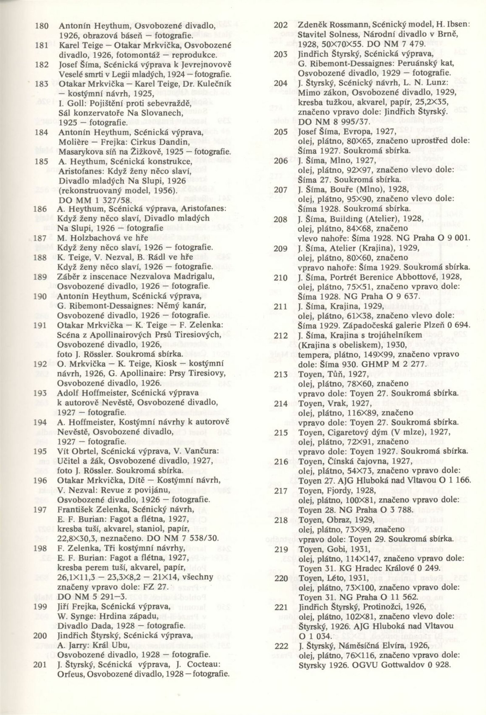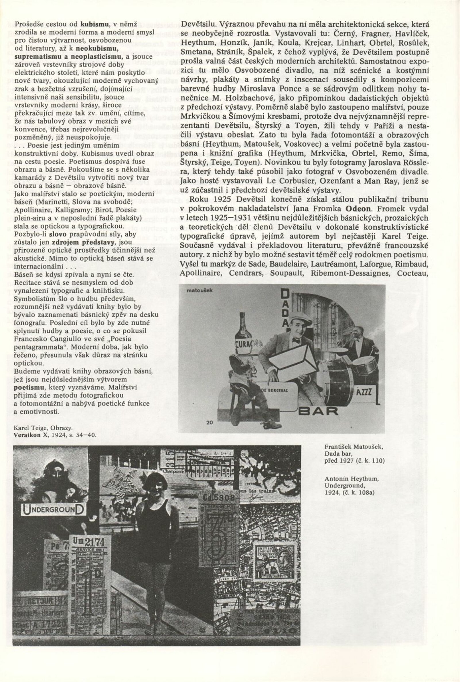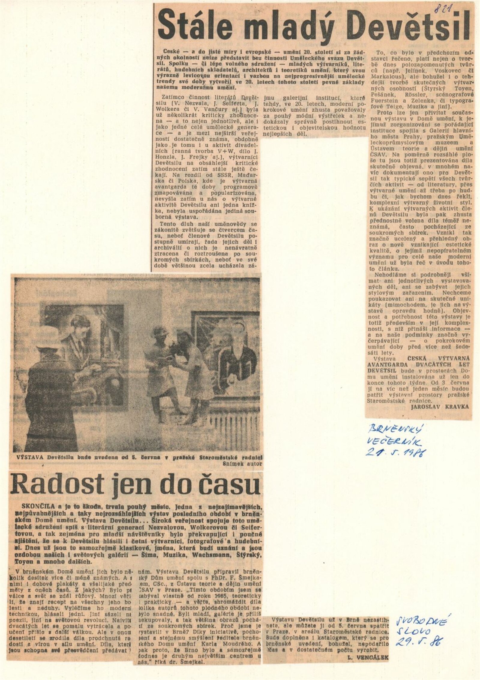 Devětsil. Česká výtvarná avantgarda dvacátých let: Dům umění města Brna, 22. 4. – 25. 5. 1986 / Texty: František Šmejkal, Rostislav Švácha, Jan Rous. – Praha: Galerie hlavního města Prahy, 1986. – [80] s., obr., překlad resumé [4] s., bibliografie, DU 821. – MG