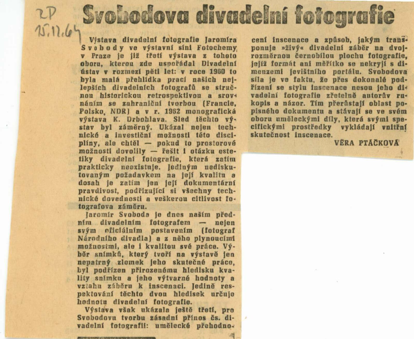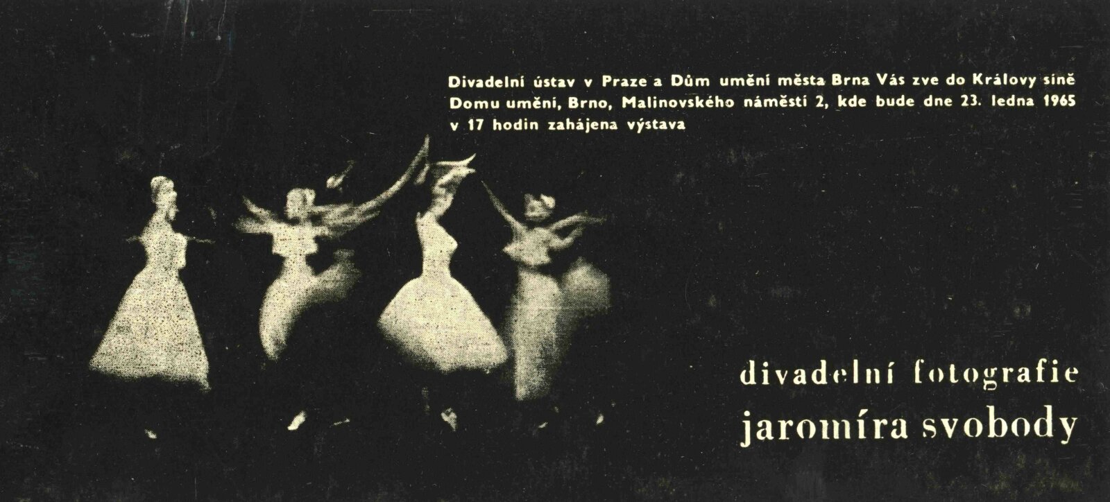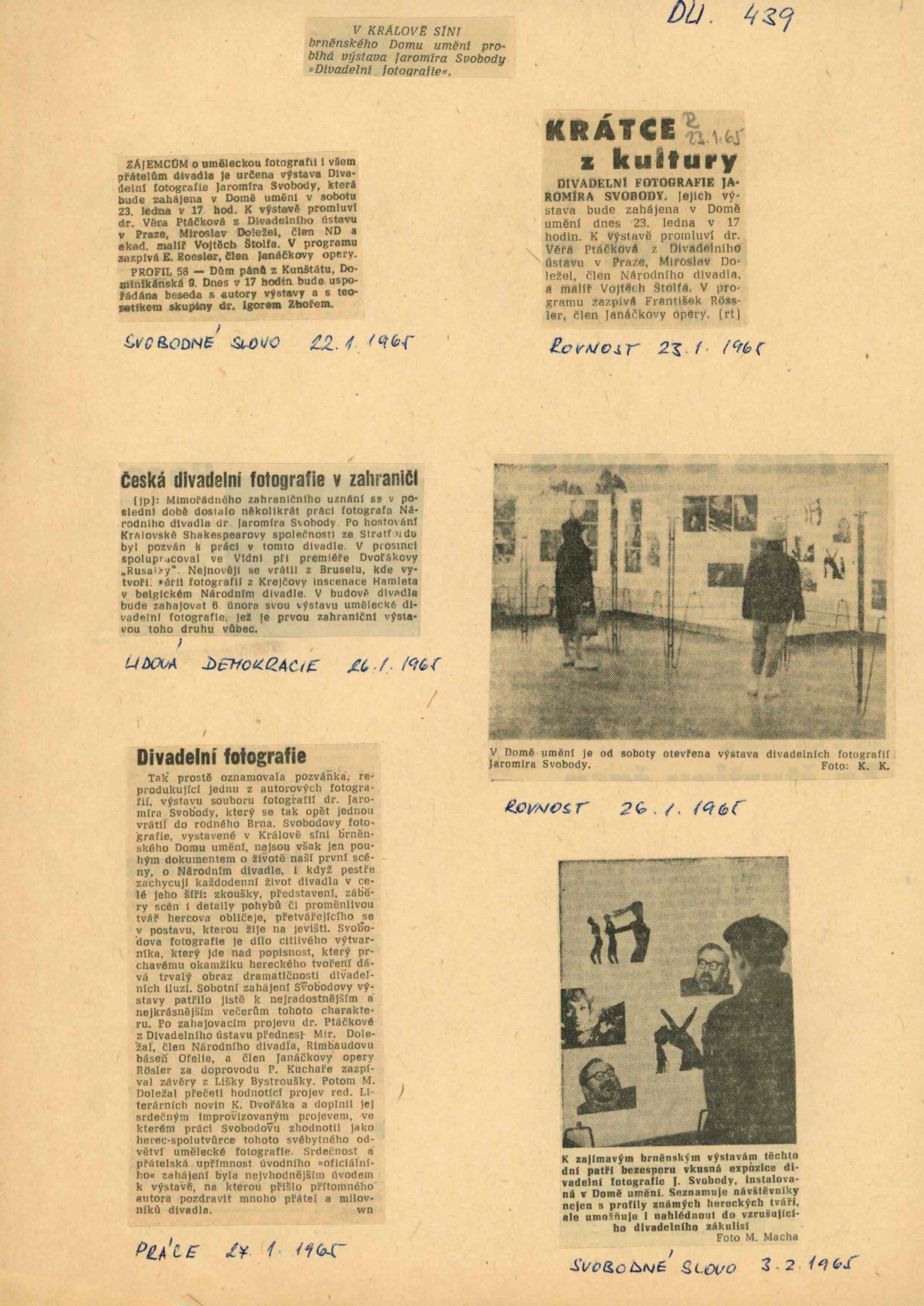 Výstava Divadelní fotografie Jaromíra Svobody: Dům umění města Brna, Galerie Jaroslava Krále, 23. 1. – 21. 2. 1965 / Texty: Karel Dvořák, Václav Kašlík, Otomar Krejčí, Josef Svoboda, Vladimír Jindra. – Praha: Divadelní ústav, 1965. – 16 s., obr., DU 439. – MZK; MG
