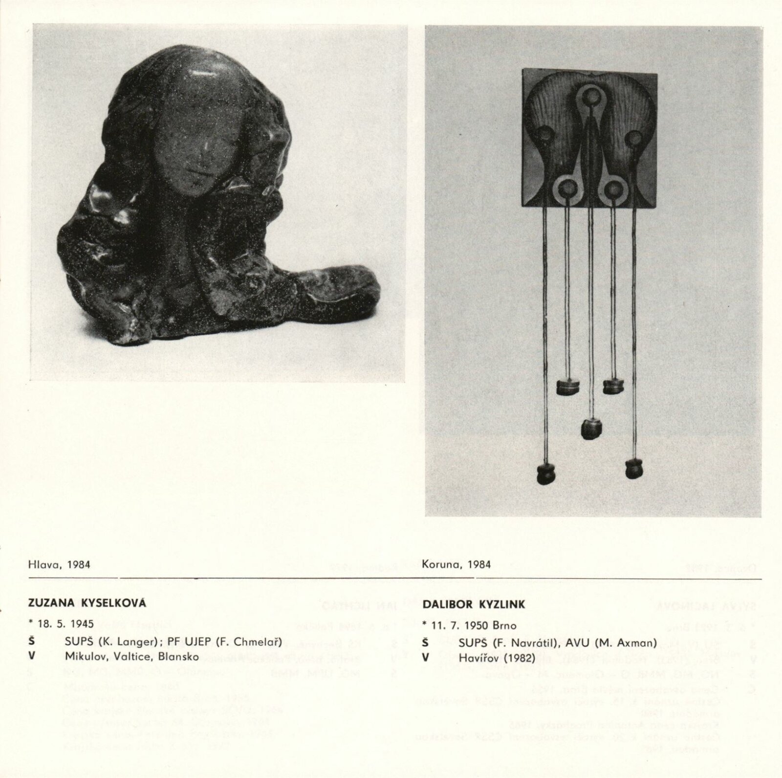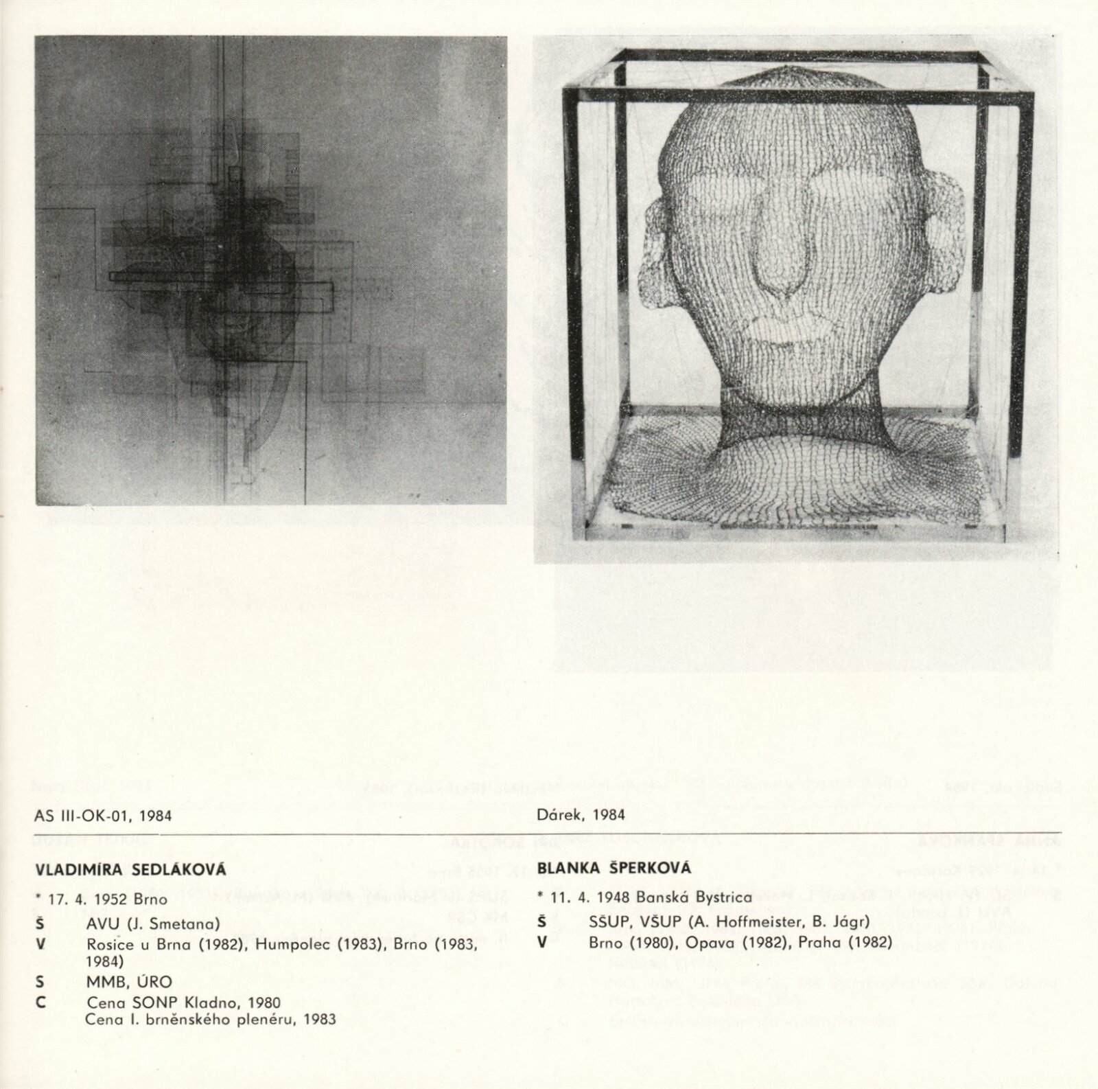 Drobná plastika v tvorbě jihomoravských výtvarníků: Dům umění města Brna, 1. patro, 30. 11. 1984 – 1. 1. 1985 / Text: Jiřina Hockeová. – Brno: DUmB, 1984. – 37 s., obr., DU 788. – MZK; MG; MMB