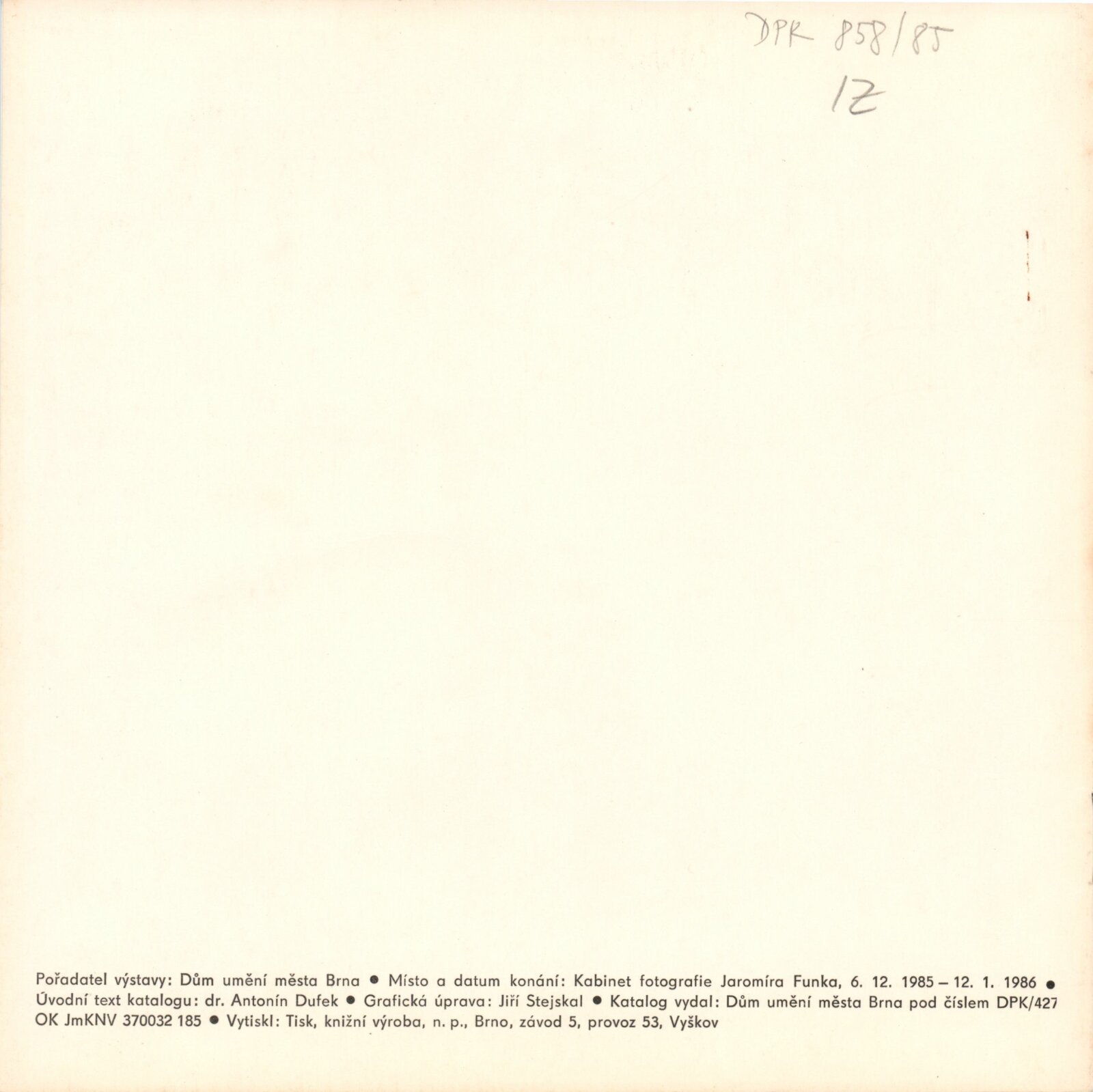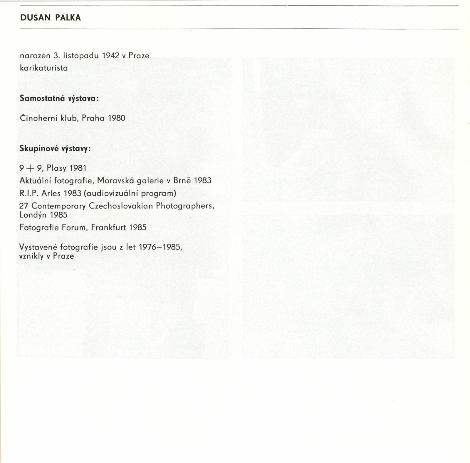 Dušan Pálka. Fotografie: Dům umění / Dům pánů z Kunštátu, Kabinet fotografie Jaromíra Funka, 6. 12. 1985 – 12. 1. 1986 / Text: Antonín Dufek. – Brno: DUmB, 1985. – 8 s., obr., životní data, výstavy, DPK 858. – MG