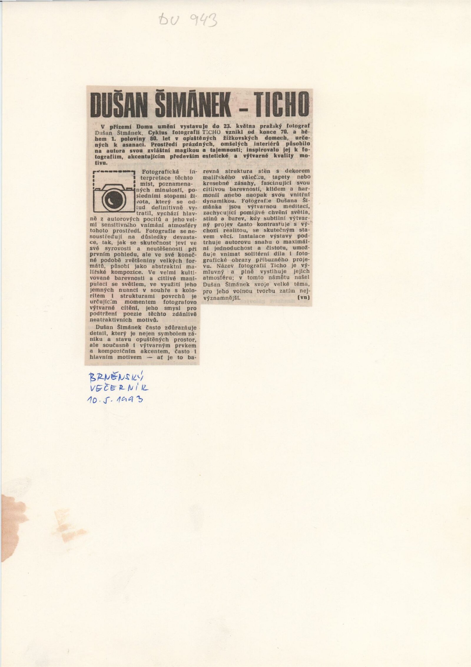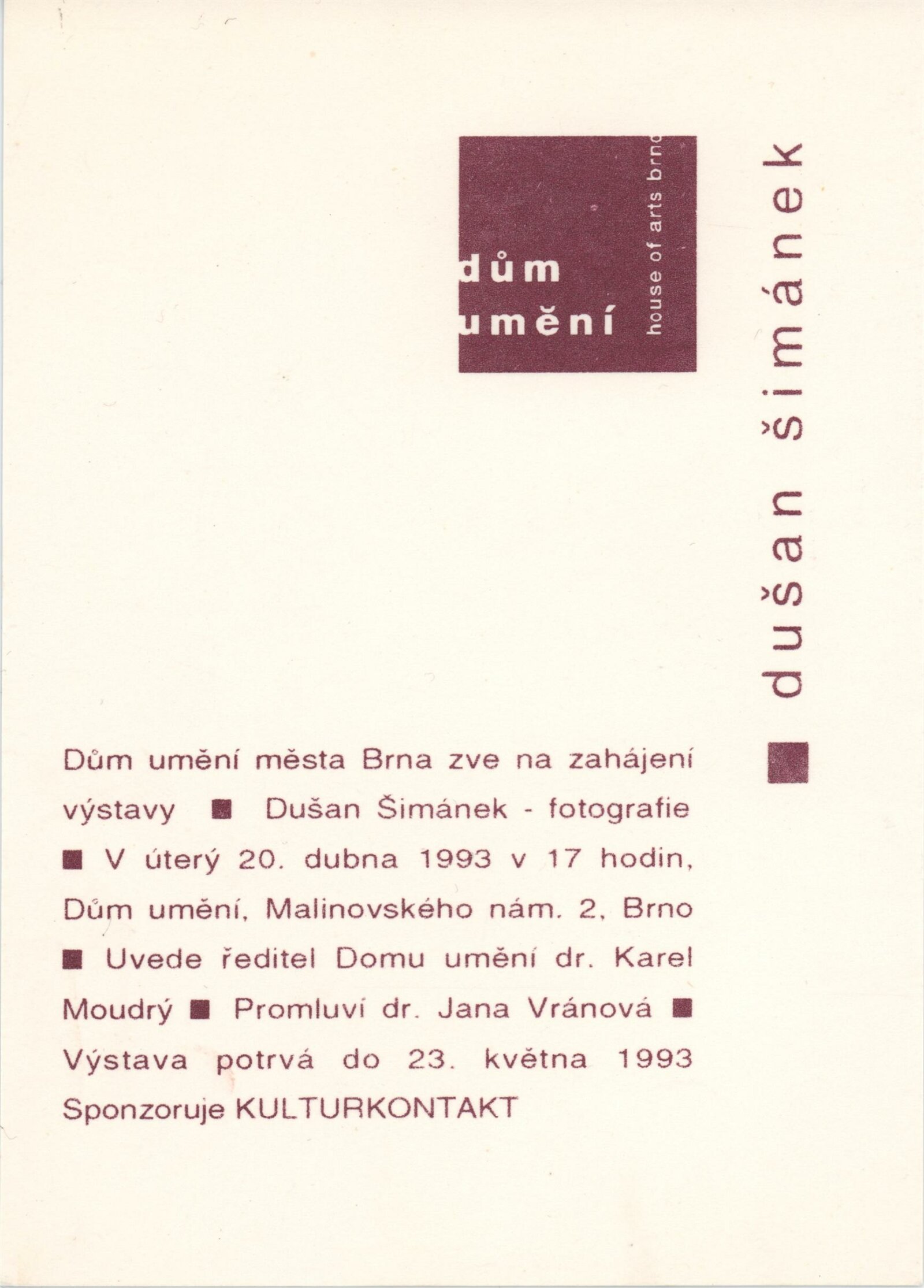 Dušan Šimánek. Ticho. Fotografie: hala DU 20. 4. – 23. 5. 1993 / Text Anna Fárová. - B. m. n. r. - [33] s. obr. Životní data, výstavy, zastoupení ve sbírkách DU 943; MG