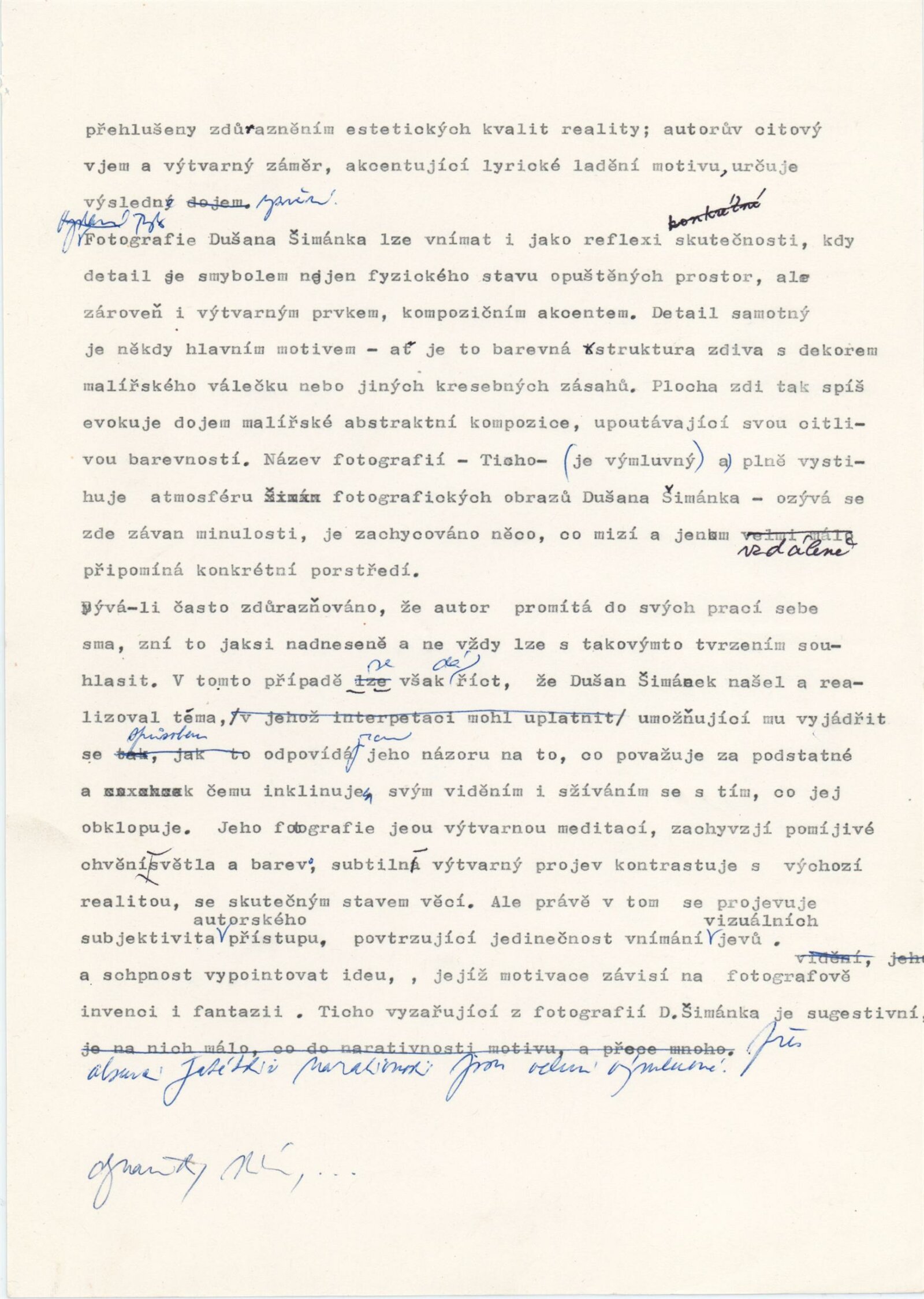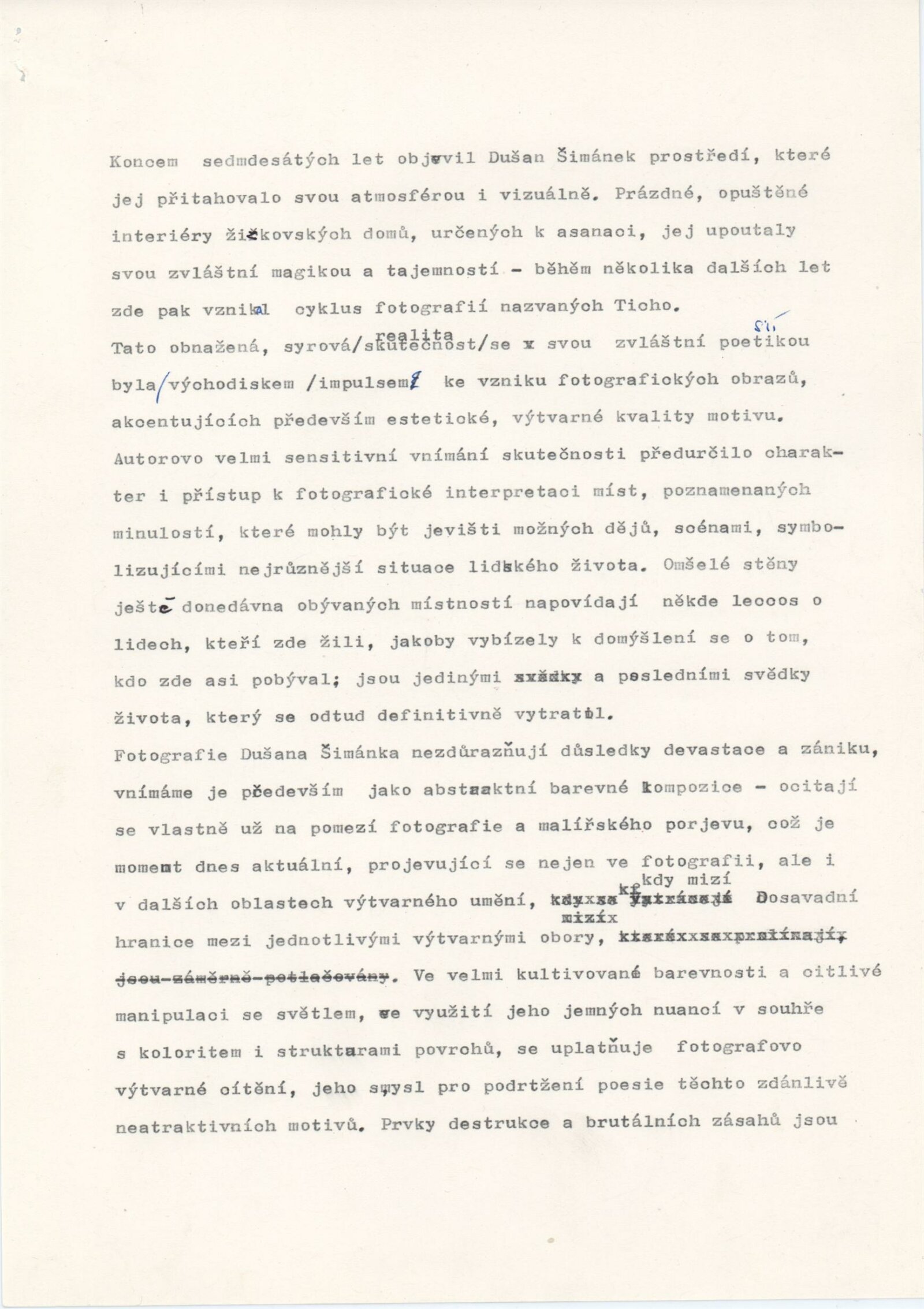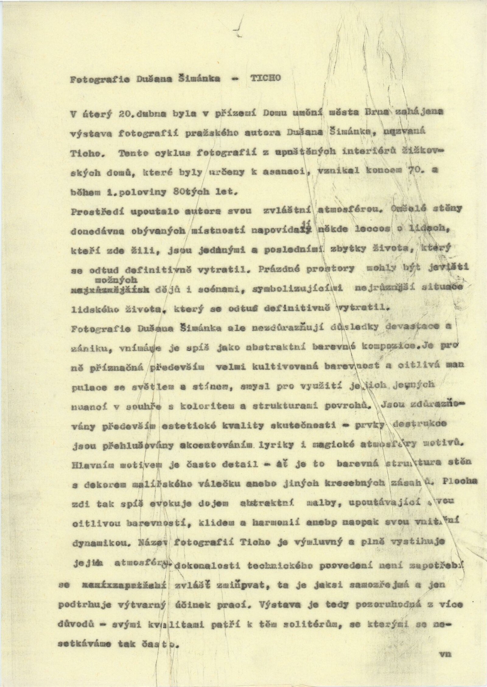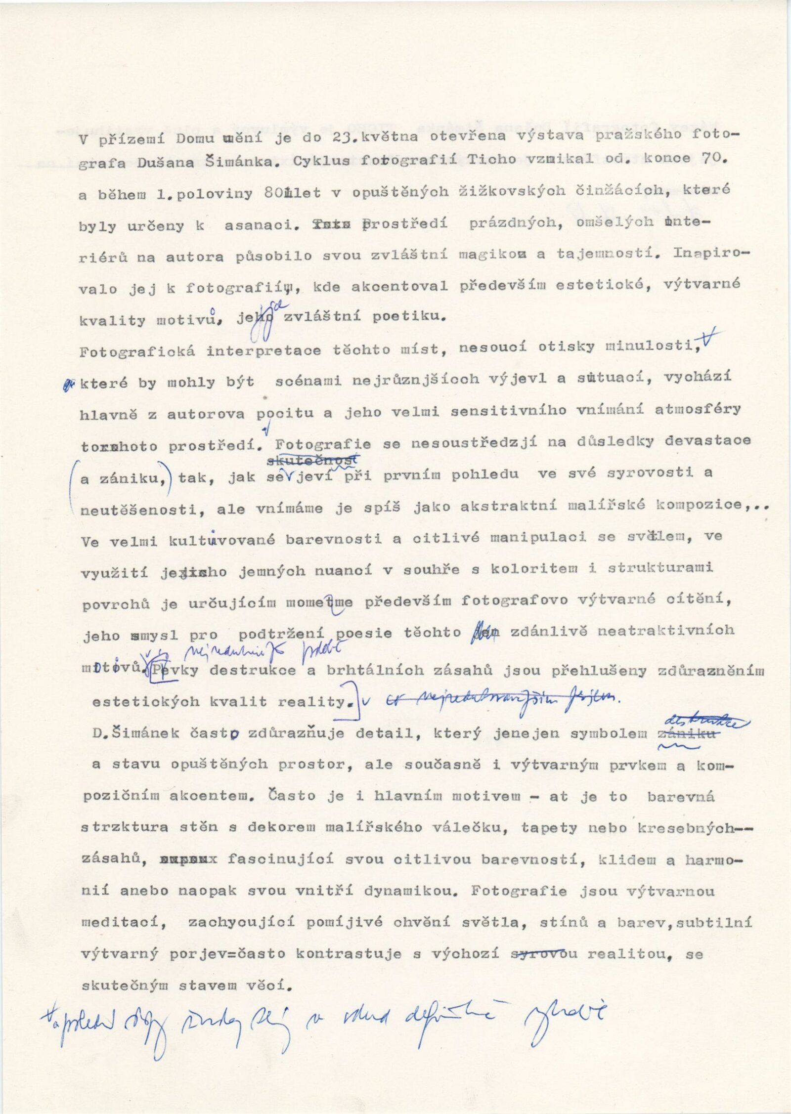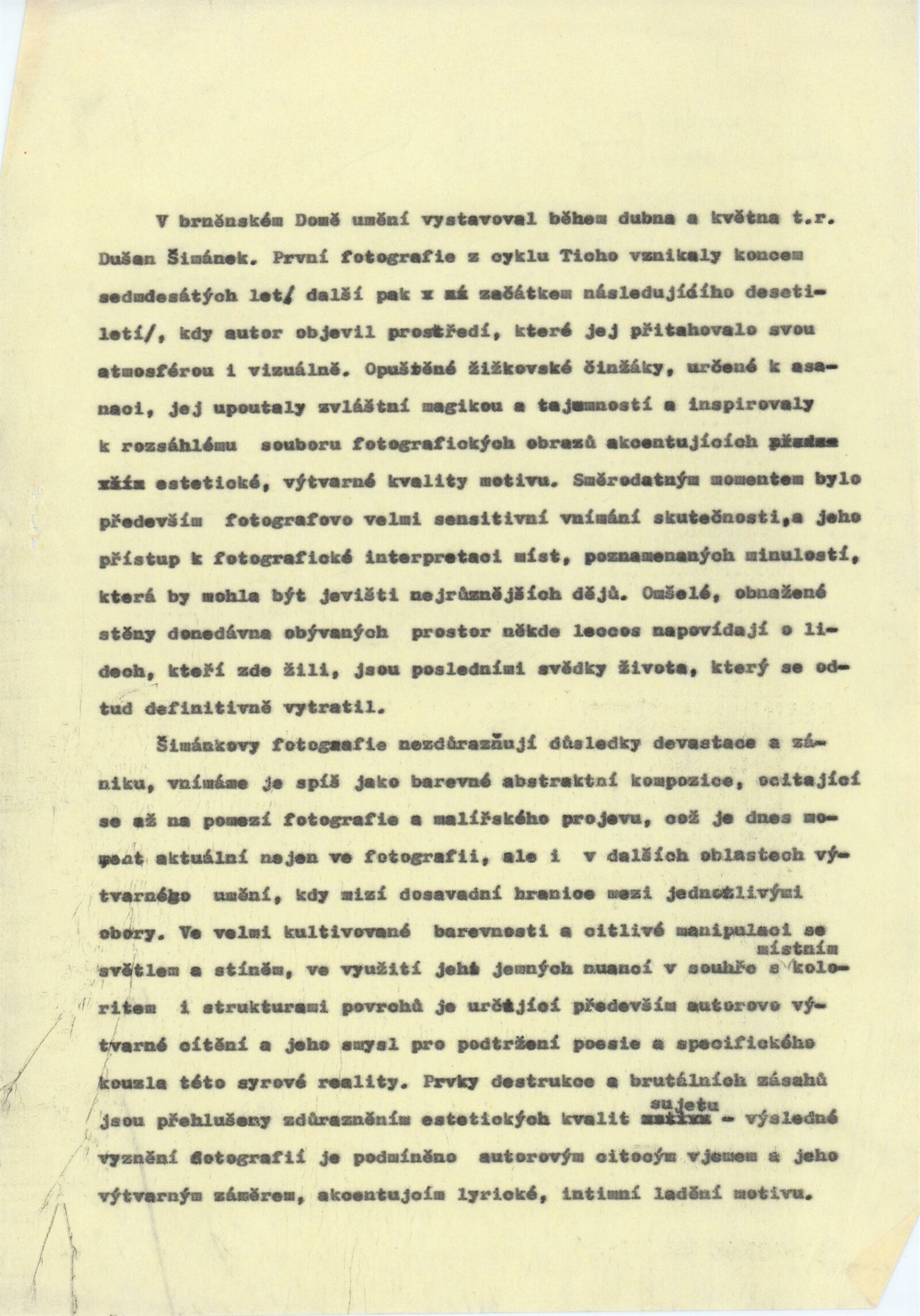 pozvánka, texty - zprávy pro tisk (J. Vránová), smlouva o uspořádání výstavy, korespondence, recenze v tisku, dvoulist k výstavě D. Šimánka (Praha 1980), leták k výstavě D. Šimánka a Jiřího Poláčka - Fotochema 1988