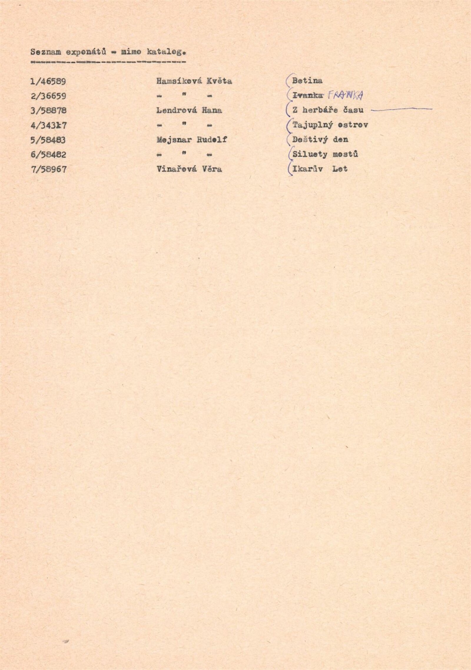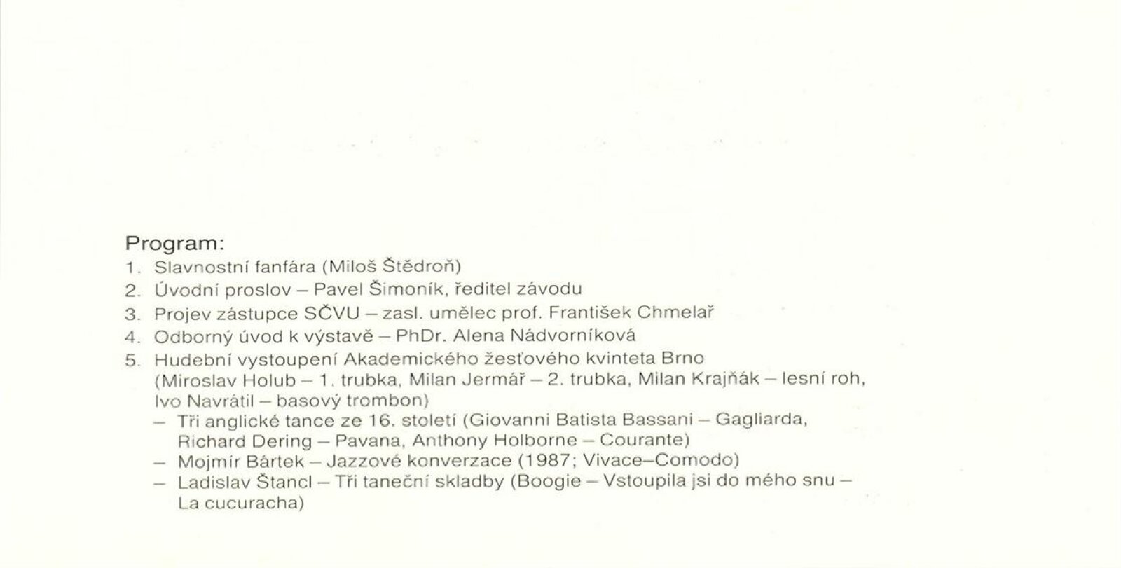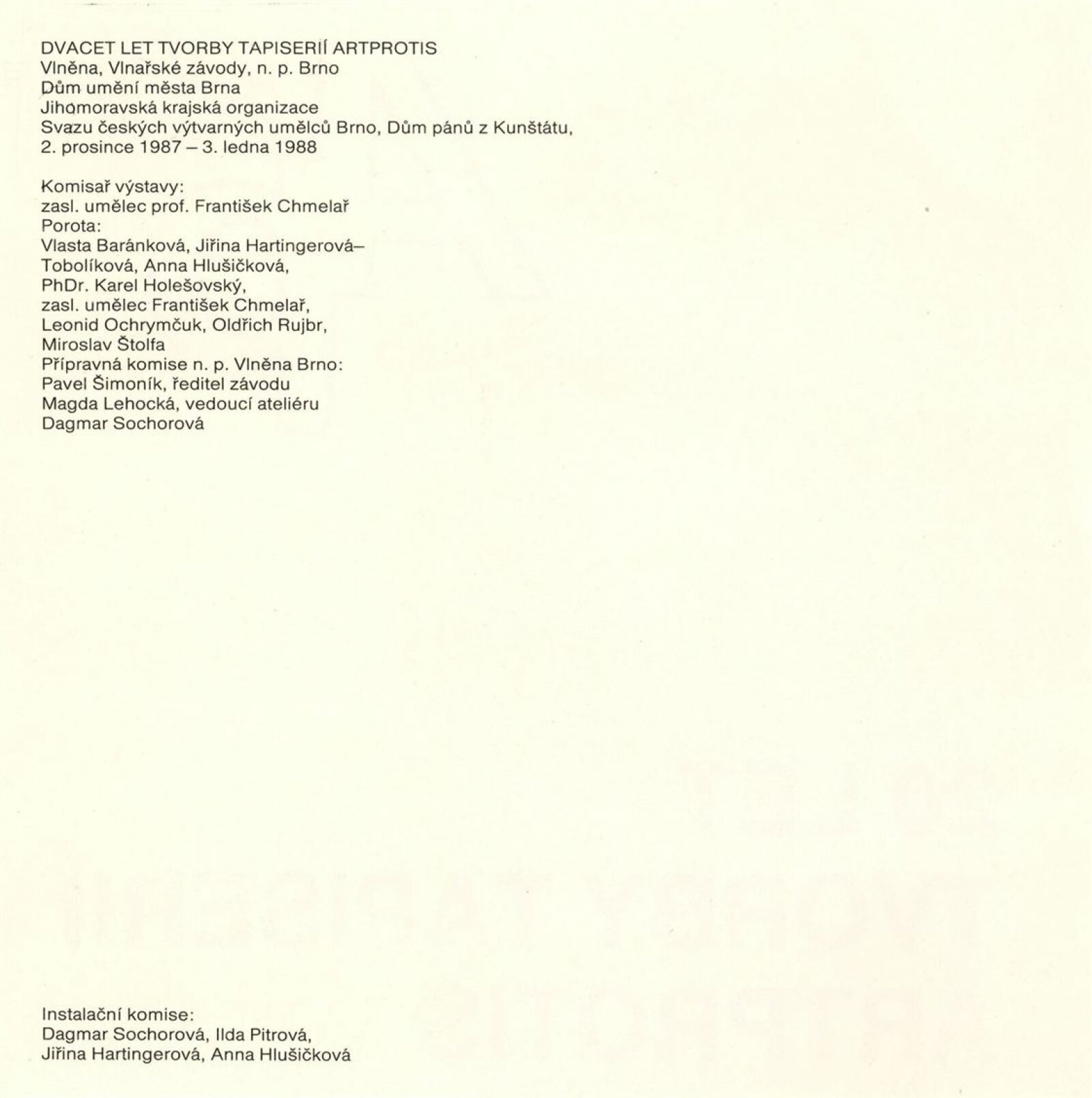 pozvánka (3 ks), katalog (2 ks), seznam vystavených děl, provozní korespondence, žádost a potvrzení o konání výstavy, recenze v tisku, katalog k výstavě Jana Wolfa (1987), propagační materiál k Artprotisu (v ruštině)
