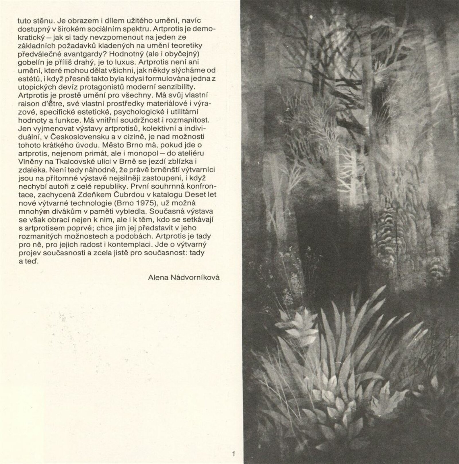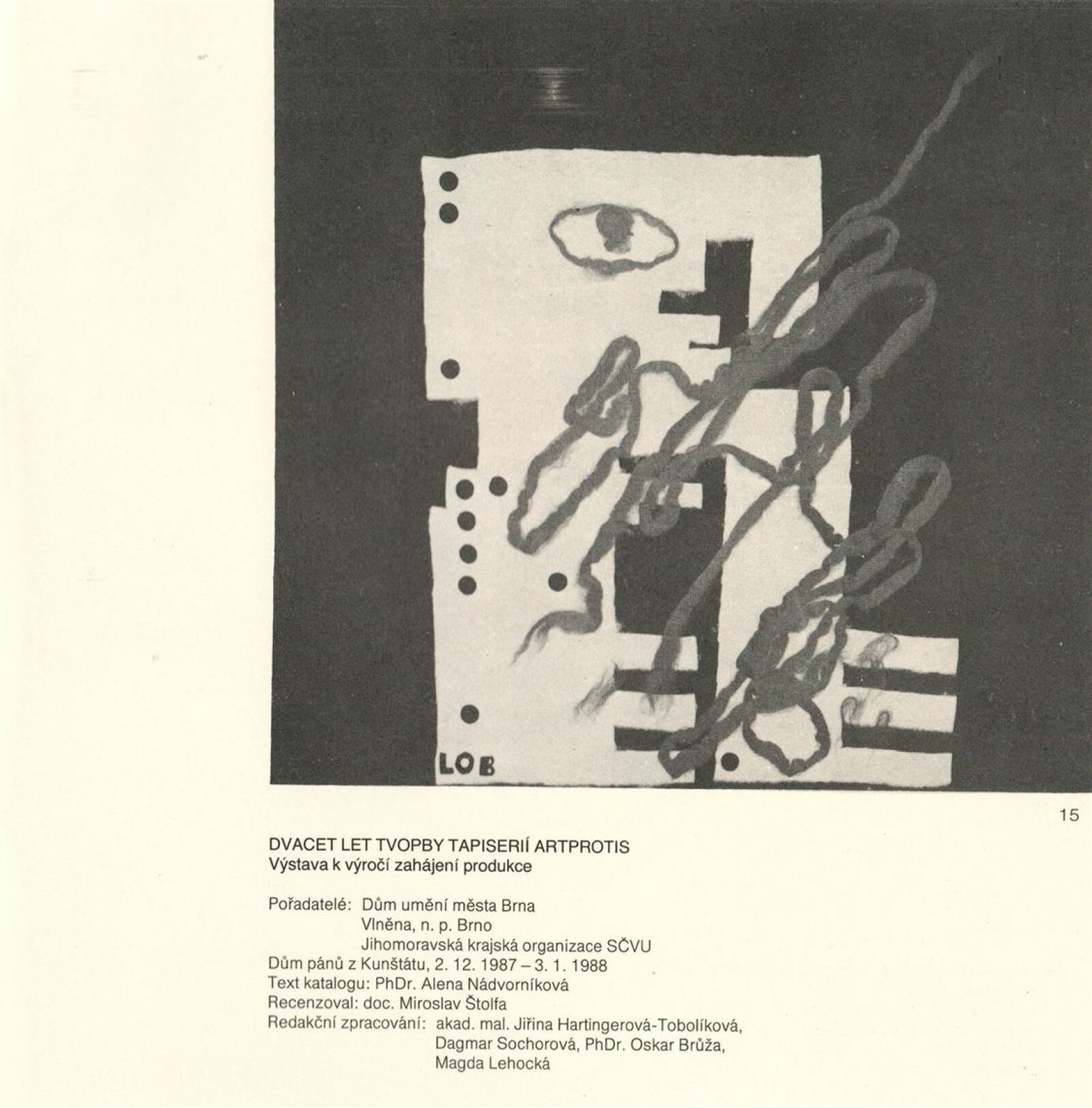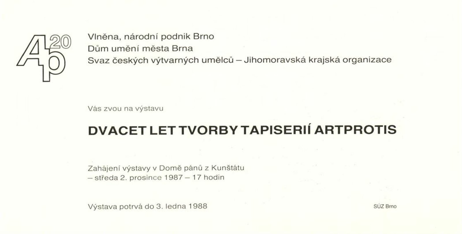 20 let tvorby tapiserií Artprotis: Dům umění / Dům pánů z Kunštátu, 2. 12. 1987 – 3. 1. 1988 / Text: Alena Nádvorníková. – Brno: DUmB, 1987. – [14] s., obr., DPK 903