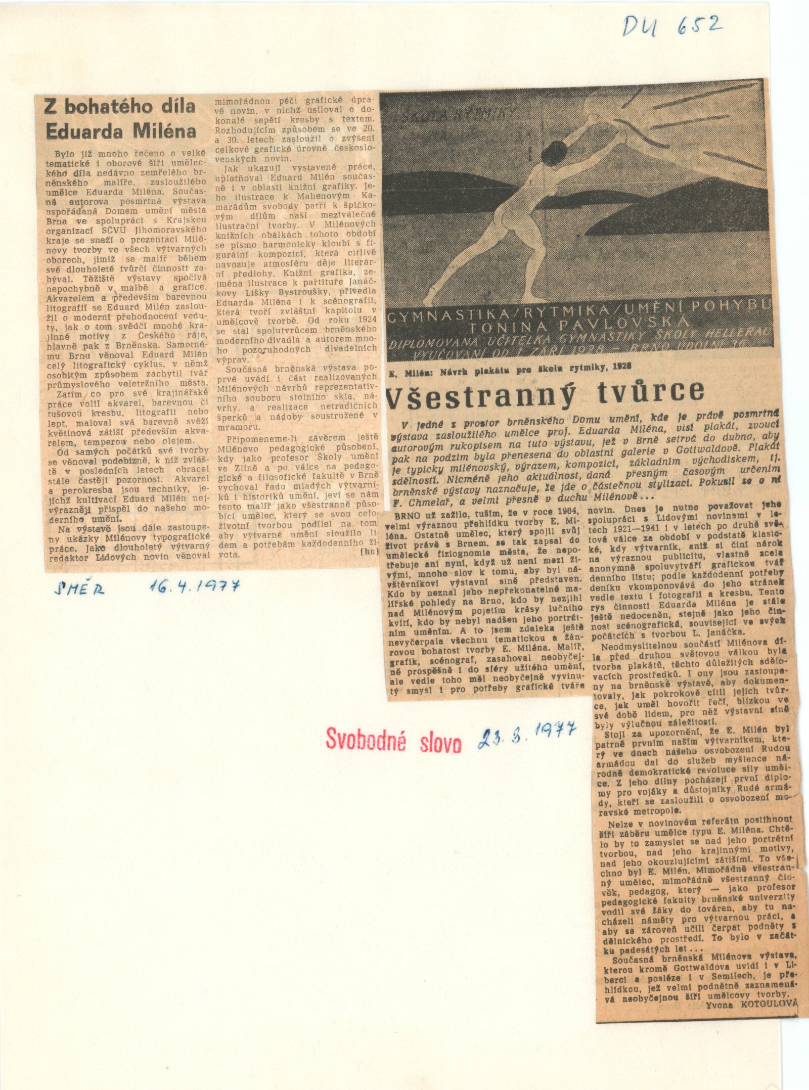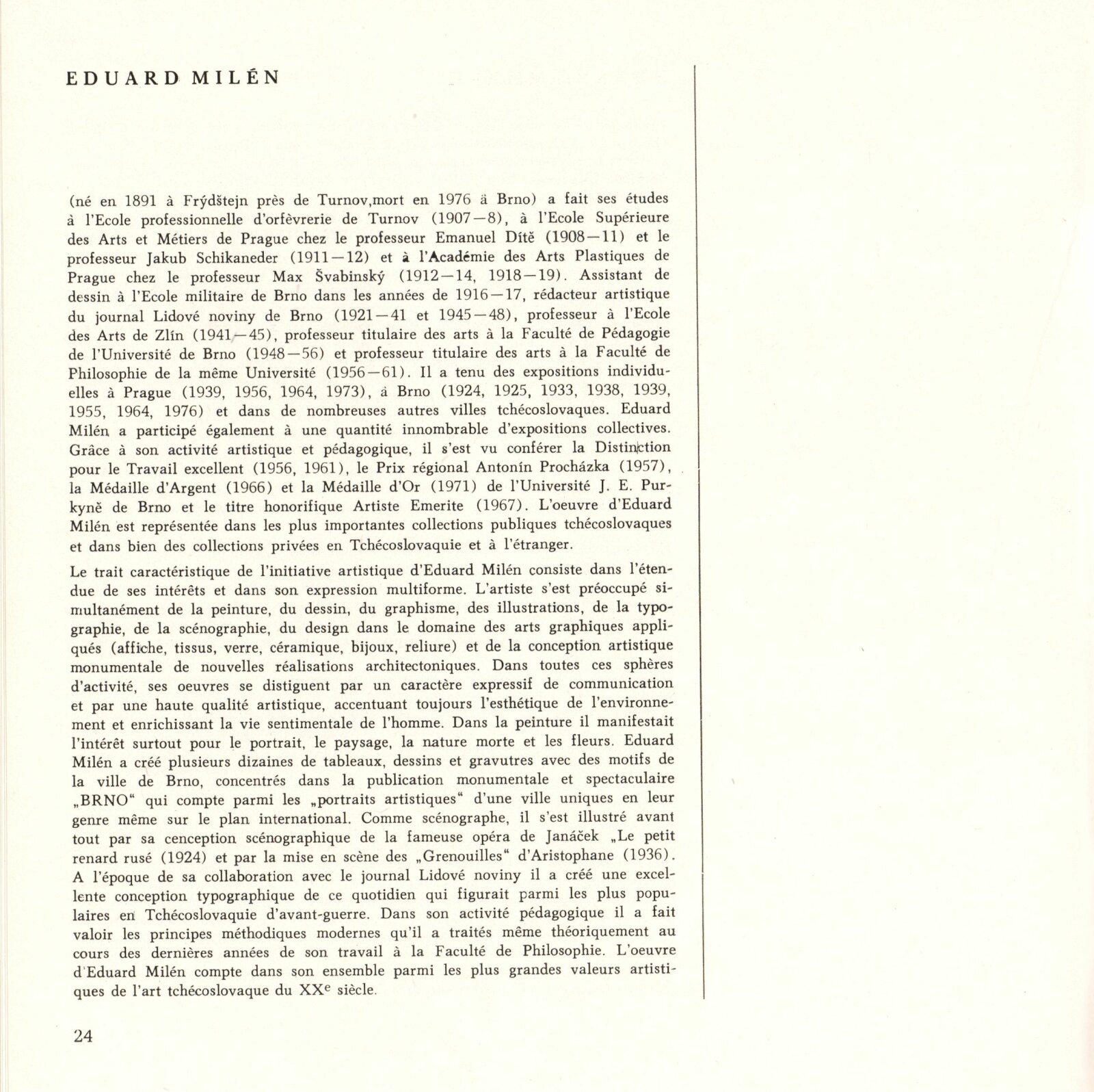Eduard Milén. Výběr z díla: Dům umění města Brna, 18. 3. – 17. 4. 1977 / Text: Zdeněk Čubrda. – Brno: DUmB, 1977. – 26 s., 26 s., obr. příl., seznam vystavených prací 12 s., portrét, životopis, seznam výstav, prací pro architekturu, bibliografie, DU 652. – MZK; MMB