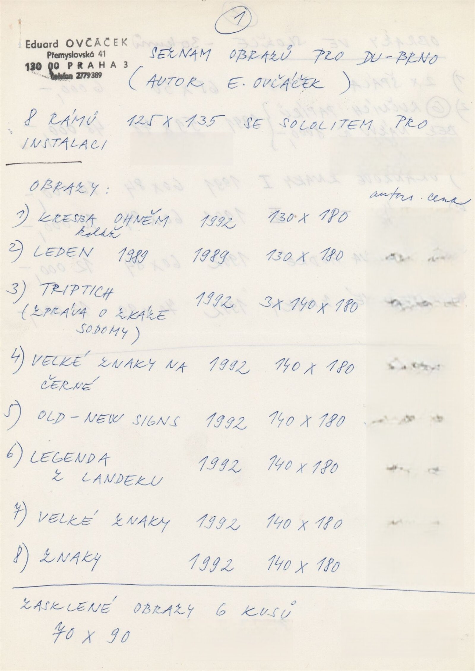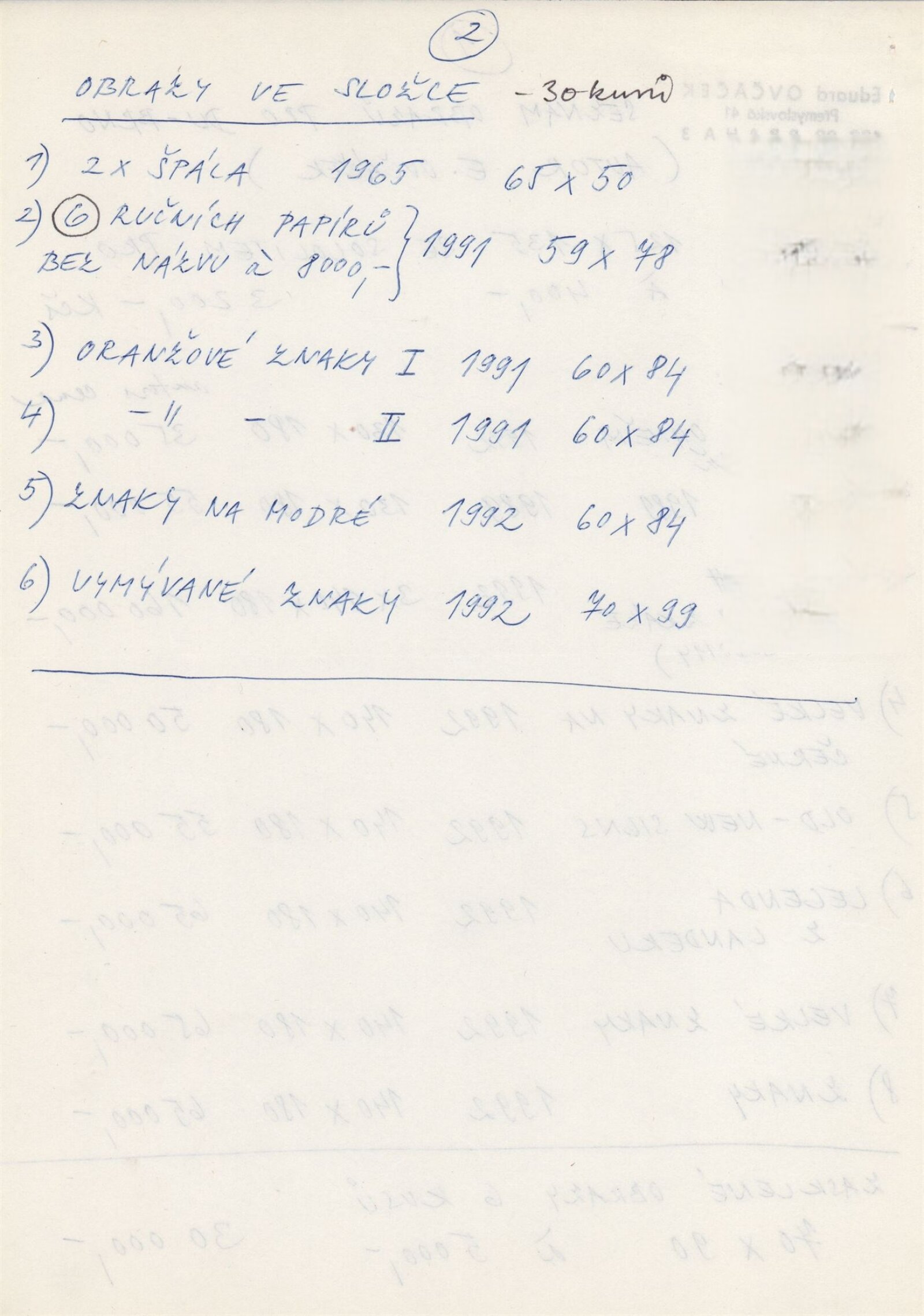 pozvánka, katalog, strojopis textů, fotografie děl, seznam vystavených děl, smlouva o pořádání výstavy, provozní korespondence s autorem, recenze v tisku, poznámky, katalog k výstavám E. Ovčáčka 1991-1992