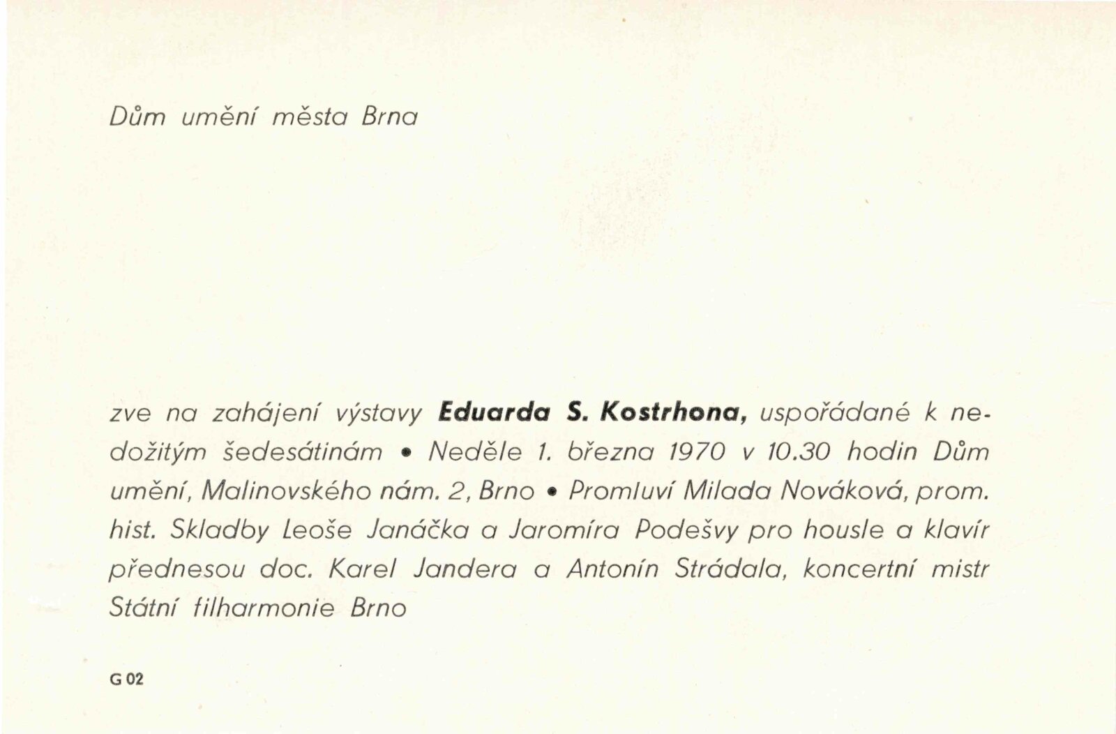 Eduard Stanislav Kostrhon. Jubilejní výstava k nedožitým šedesátinám: Dům umění města Brna, hala, 1. 3. – 5. 4. 1970 / Text: Milada Nováková. – Brno: DUmB, 1970. – 12 s., obr., portrét, životopis, DU 542. – MZK; MG; MMB