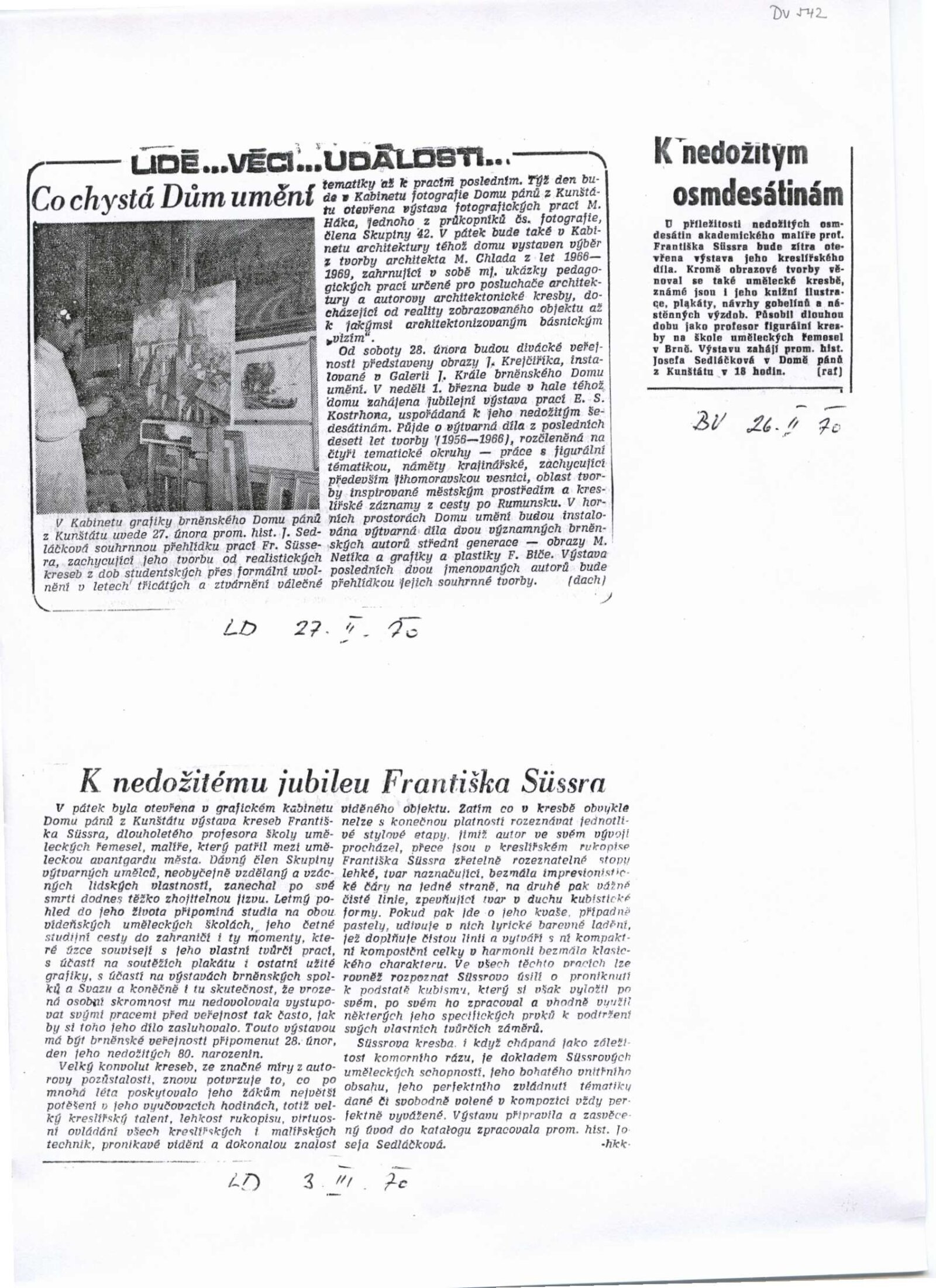 pozvánka, katalog, maketa katalogu, fotografie děl, seznam vystavených prací, strojopis textů pro katalog, žádost M. Kostrhonové o uspořádání výstavy + katalog a pozvánka DPK 102, smlouva výstavy, recenze v tisku, katalog (Ostrava 1949, Brno 1947, Brno 1956, Zlín 1946)