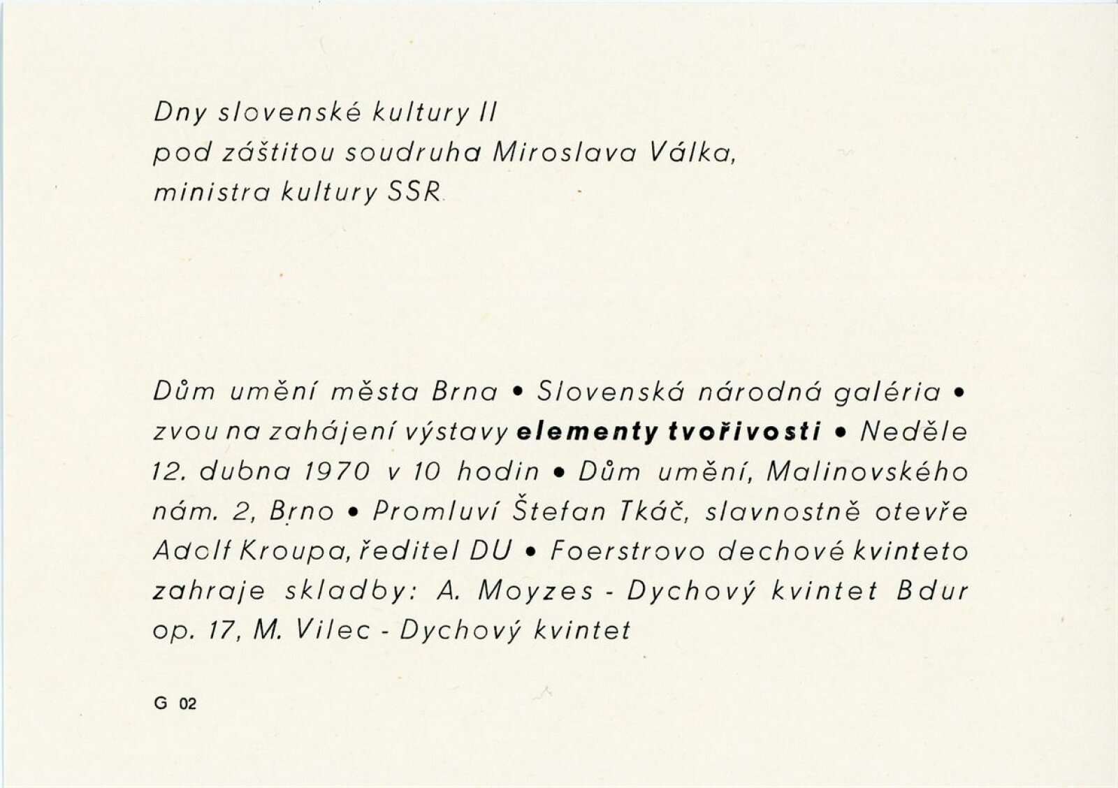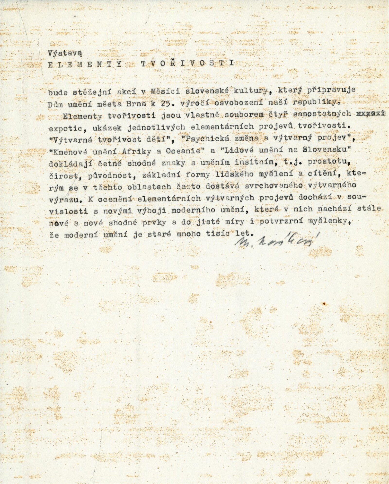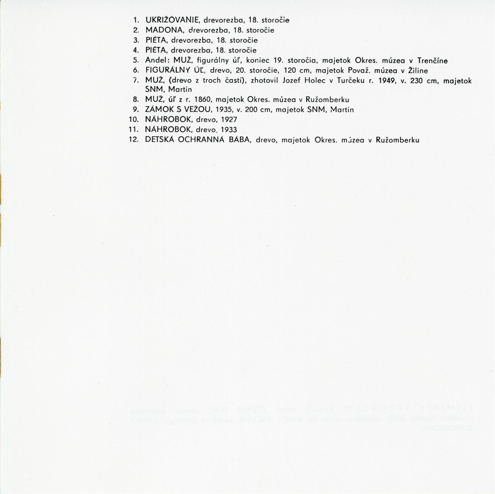 Elementy tvořivosti: Dům umění, 12. 4. – 17. 5. 1970 / Převzatý katalog. Elementy tvorivosti. Výtvarná tvorivosť detí. Kresby Juraja Putnu. Psychická zmena a výtvarný prejav. Kmeňové umenie Oceánie a Afriky. Ľudové výtvarné umenie na Slovesnku: Slovenská národní galerie, září–prosinec 1969 / Texty: Štefan Tkáč, Erich Herold. – Bratislava: Slovenská národná galéria, 1969. – 52 s., obr., DU 545. – MZK
