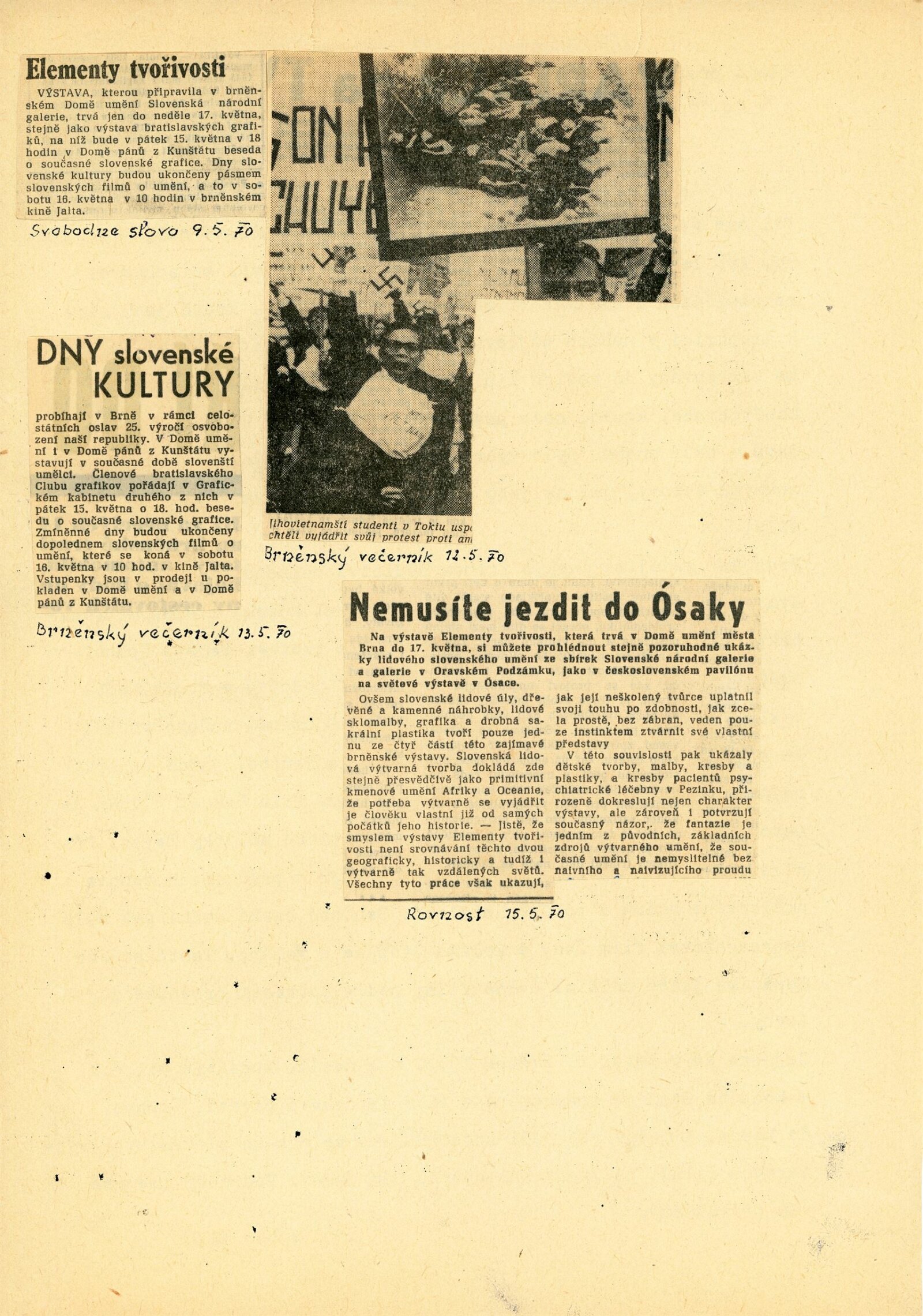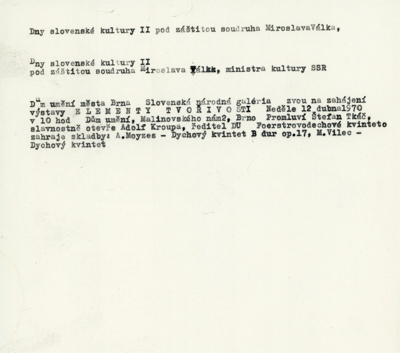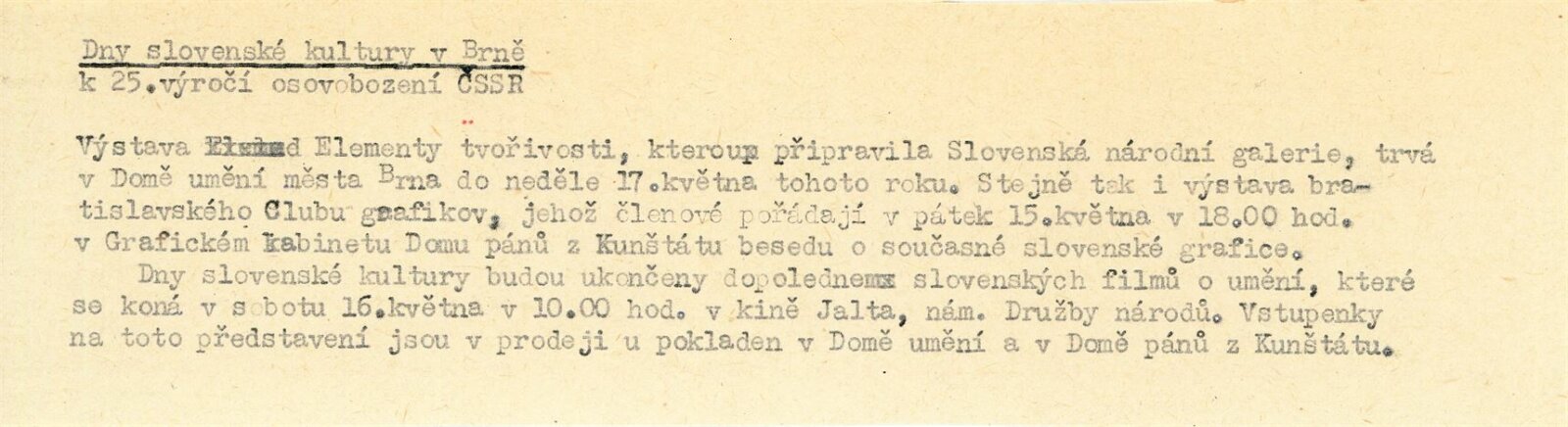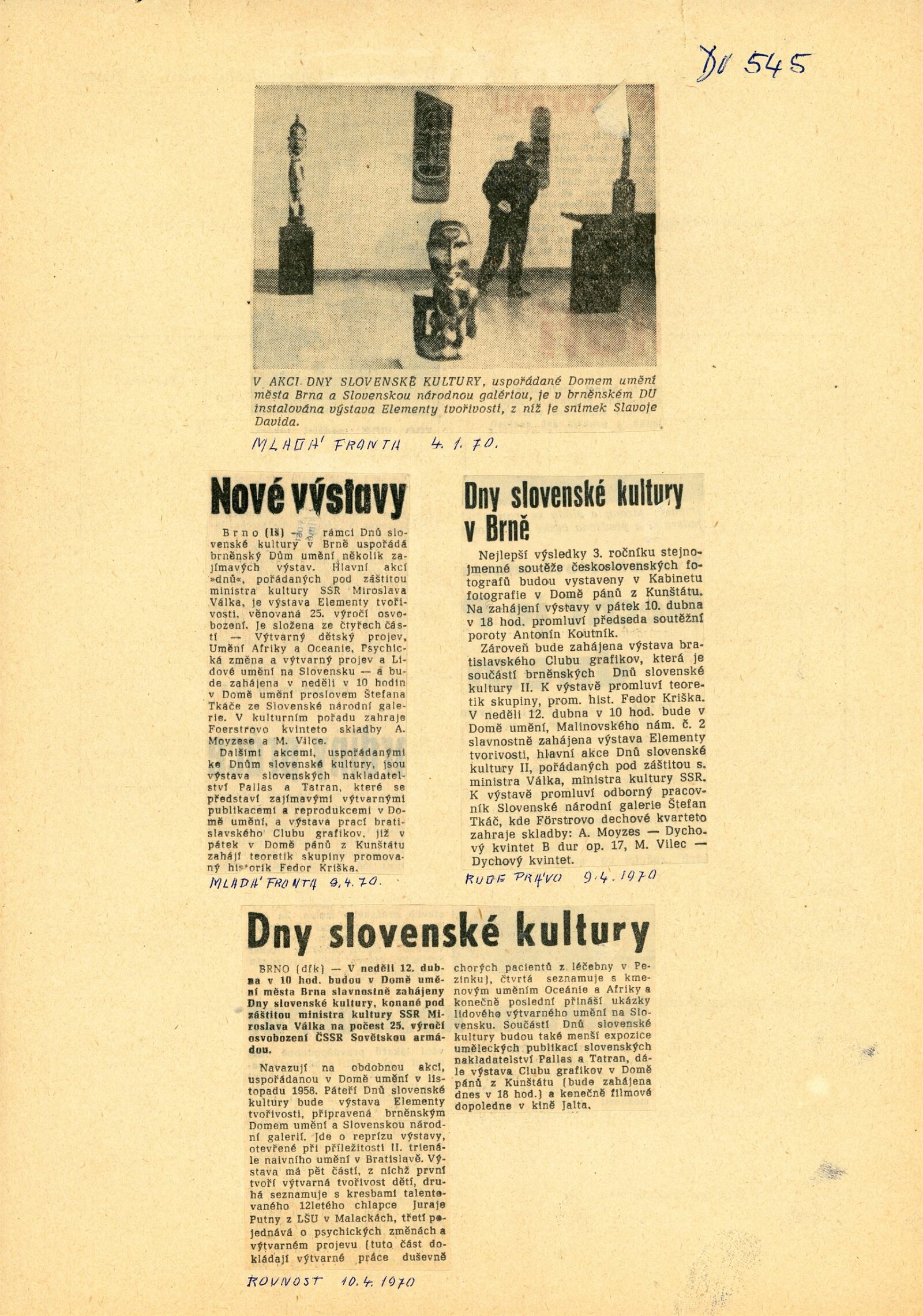 pozvánka, katalog, měsíční plakát (spol. pro DU 544–545 a DPK 439–442), fotografie instalace a vernisáže výstavy, zprávy o výstavě z DU, úvodní slovo nepřítomného Adolfa Kroupy, texty k výstavě (Milada Nováková), plán práce, pracovní úkoly na březen (Milada Nováková), strojopis programu DU, seznam výtvarných publikací na Deň slovenskej kultúry v Brně, korespondence (Adolf Kroupa Paľu Biednikovi a Miroslavu Válkovi, provozní korespondence Moravská galerie – seznam exponátů, žádost o výpůjčku), korespondence k DU 545a (šéfredaktorům Pallas a Tatran), recenze v tisku, katalog výstavy reprodukcí „Slovenské malířství po roce 1918“ ve Východočeské galerii v Pardubicích