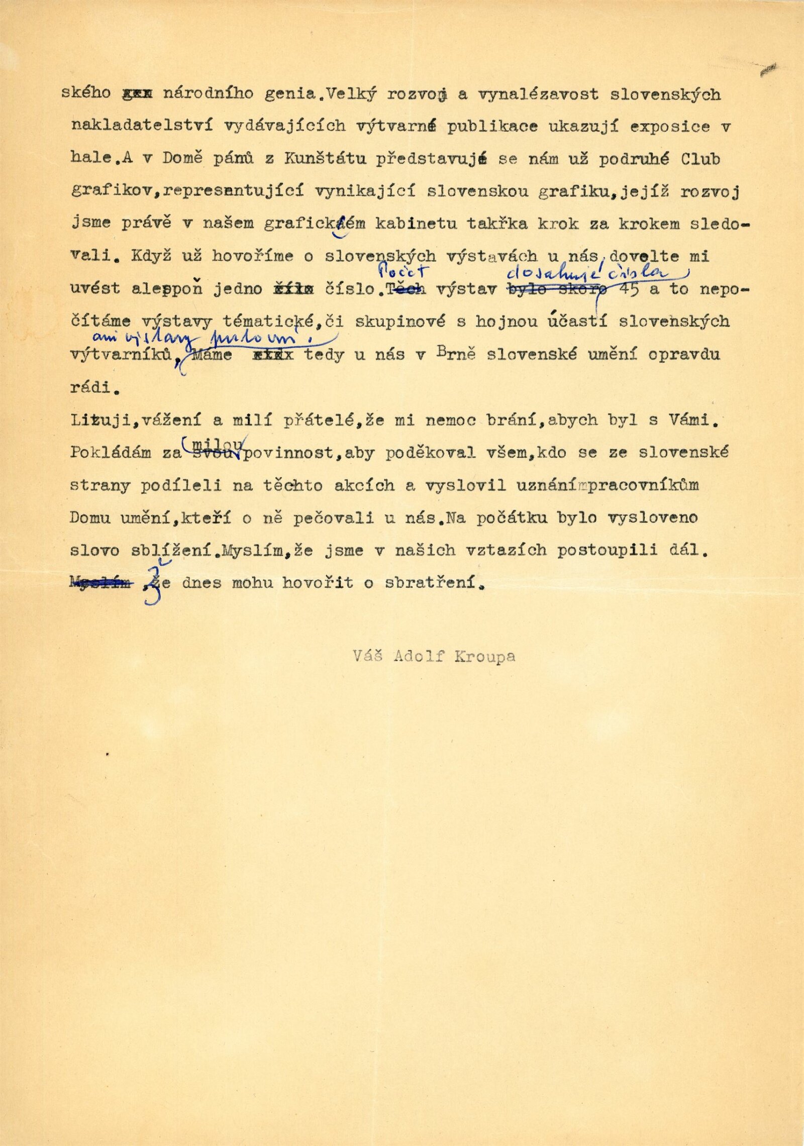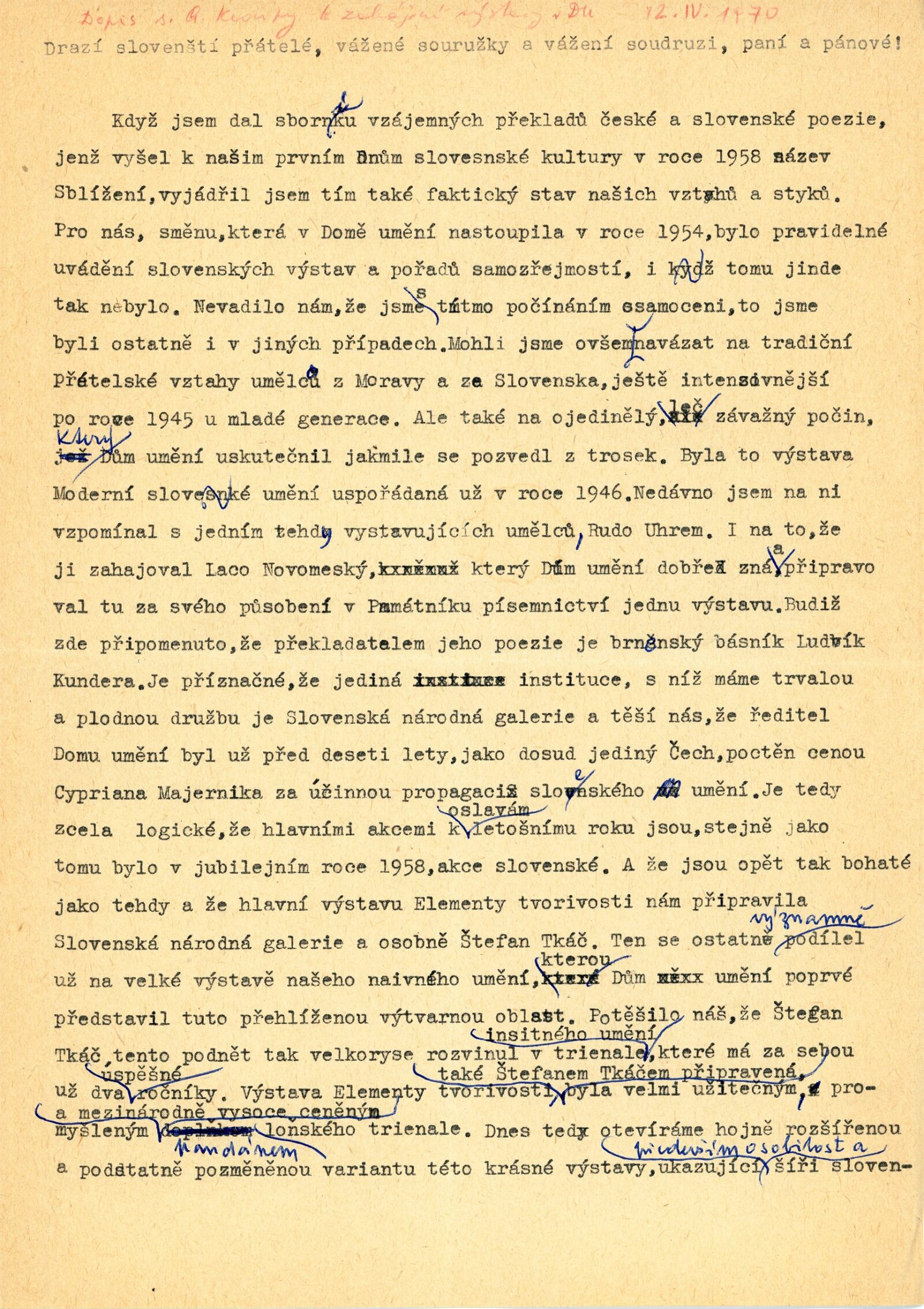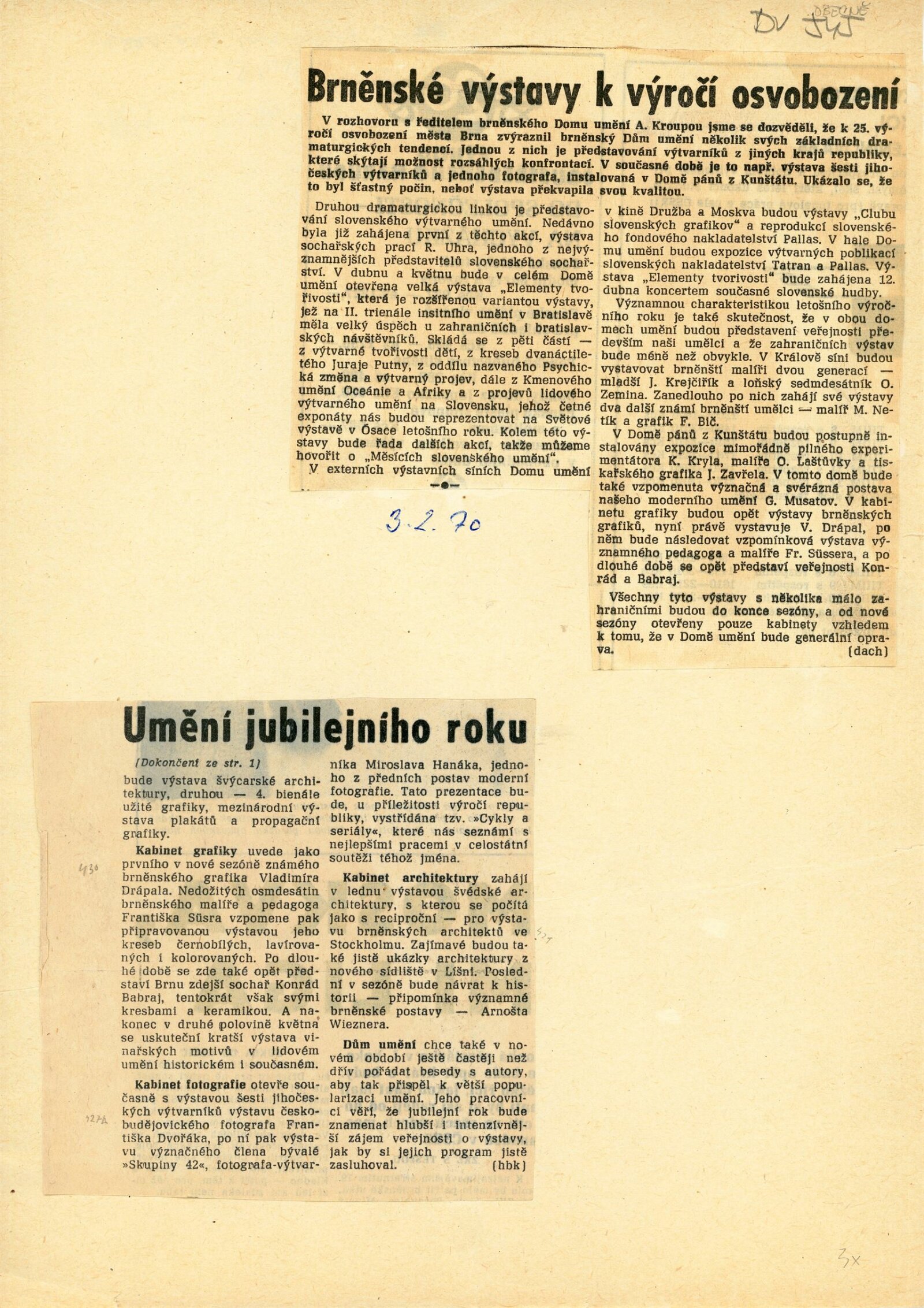 pozvánka, katalog, měsíční plakát (spol. pro DU 544–545 a DPK 439–442), fotografie instalace a vernisáže výstavy, zprávy o výstavě z DU, úvodní slovo nepřítomného Adolfa Kroupy, texty k výstavě (Milada Nováková), plán práce, pracovní úkoly na březen (Milada Nováková), strojopis programu DU, seznam výtvarných publikací na Deň slovenskej kultúry v Brně, korespondence (Adolf Kroupa Paľu Biednikovi a Miroslavu Válkovi, provozní korespondence Moravská galerie – seznam exponátů, žádost o výpůjčku), korespondence k DU 545a (šéfredaktorům Pallas a Tatran), recenze v tisku, katalog výstavy reprodukcí „Slovenské malířství po roce 1918“ ve Východočeské galerii v Pardubicích