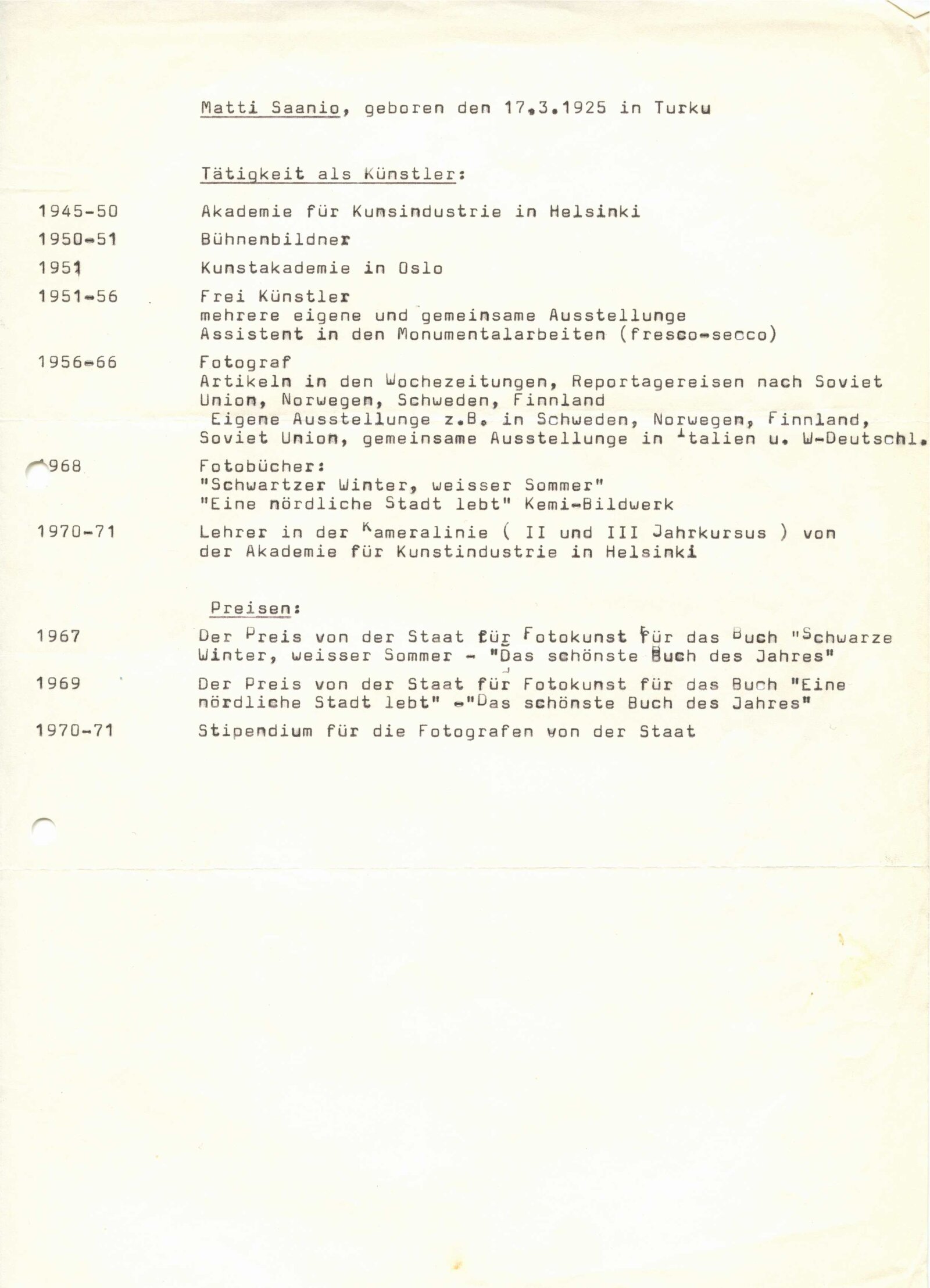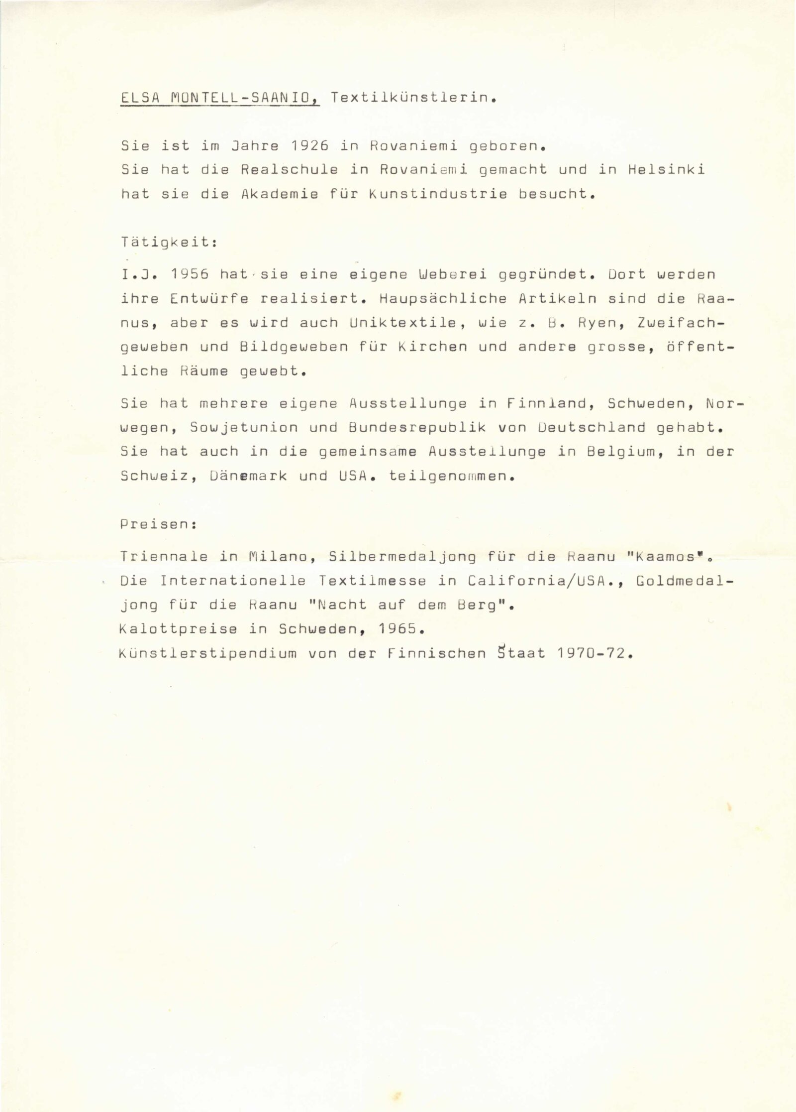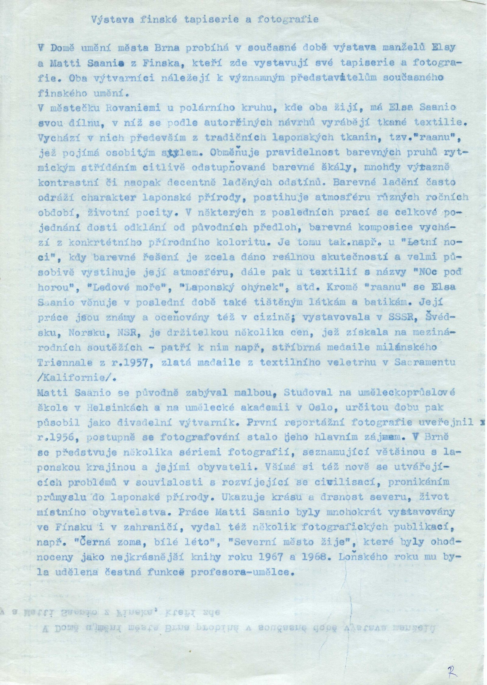 pozvánka, katalog, plakát, fotografie z vernisáže, fotografie Elsa Montell-Saanio, strojopis textu pro rozhlas, žádost o schválení a registraci výstavy, korespondence s umělci (příprava výstavy, materiály pro katalog), žádost o schválení výstavy (MK ČSR), recenze v tisku, katalog ze zahraniční výstavy