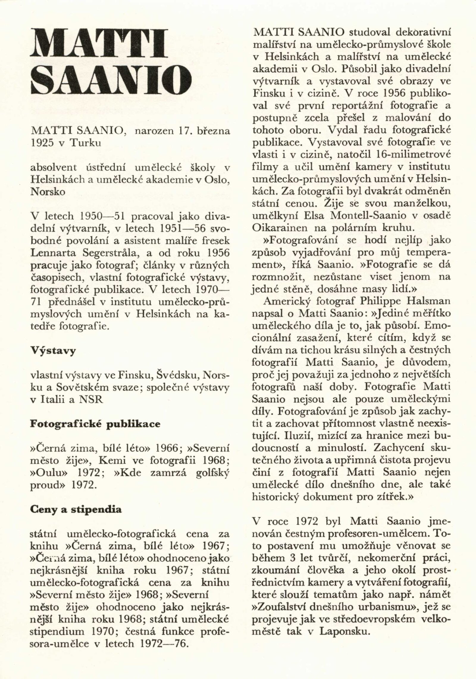 Elsa Montell-Saanio. Tapiserie. Matti Saanio Fotografie: Dům umění města Brna 6. 4. – 27. 4. 1973 / Text: Anna-Liisa Ahmavaara. Brno: DUmB, 1973. – 4 s., 4 s. obr., životopisy, DU 587. – MG