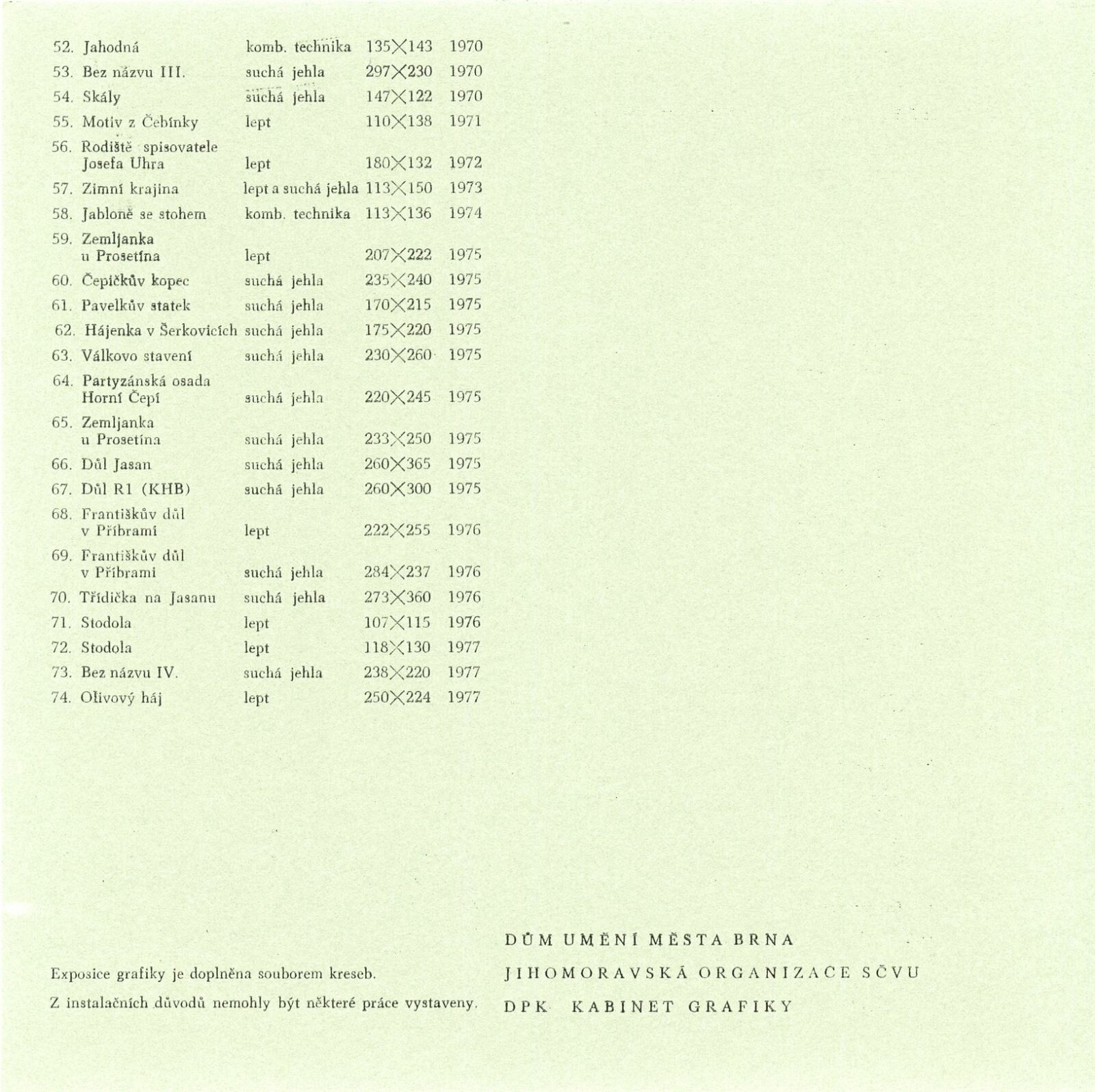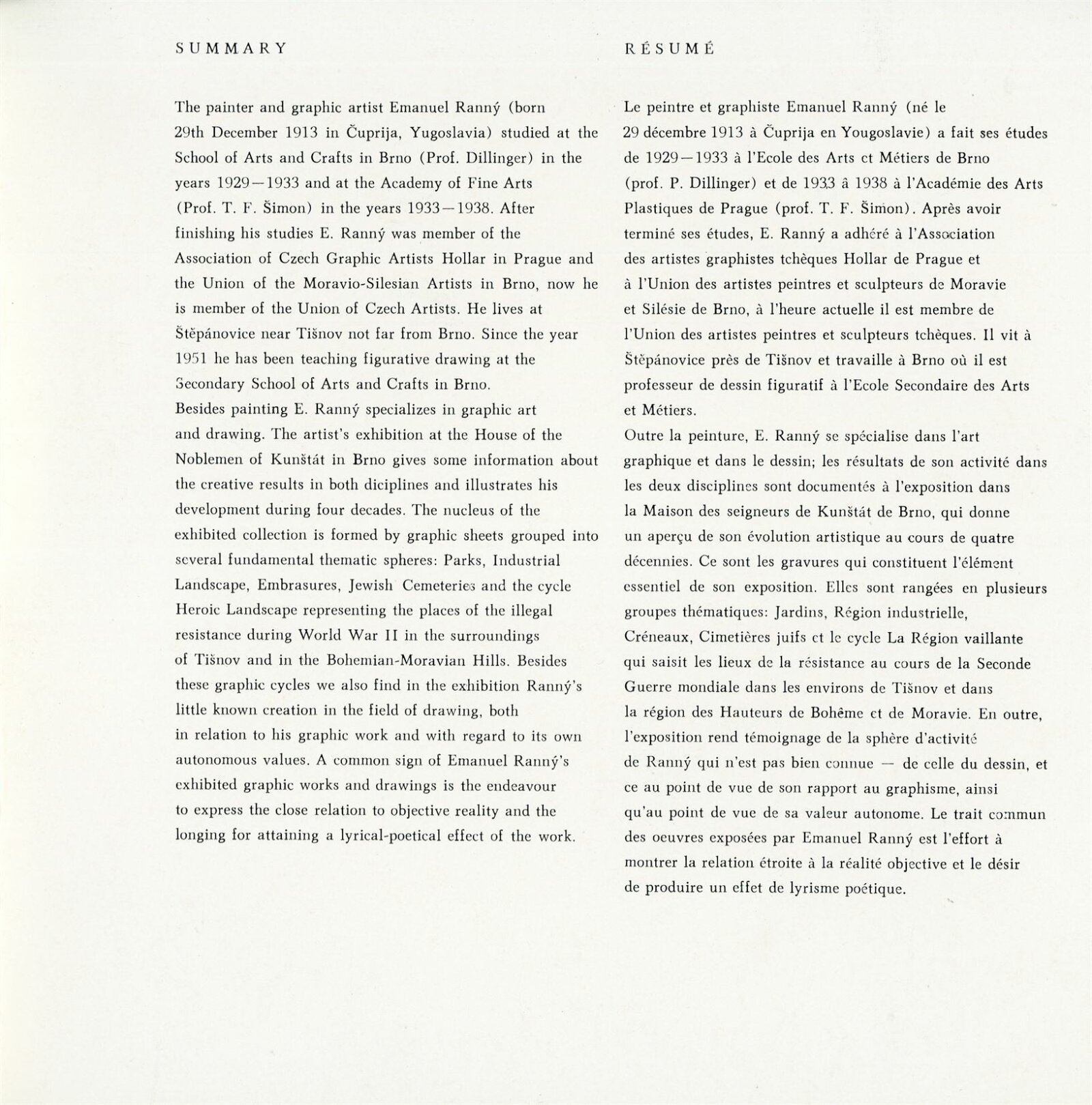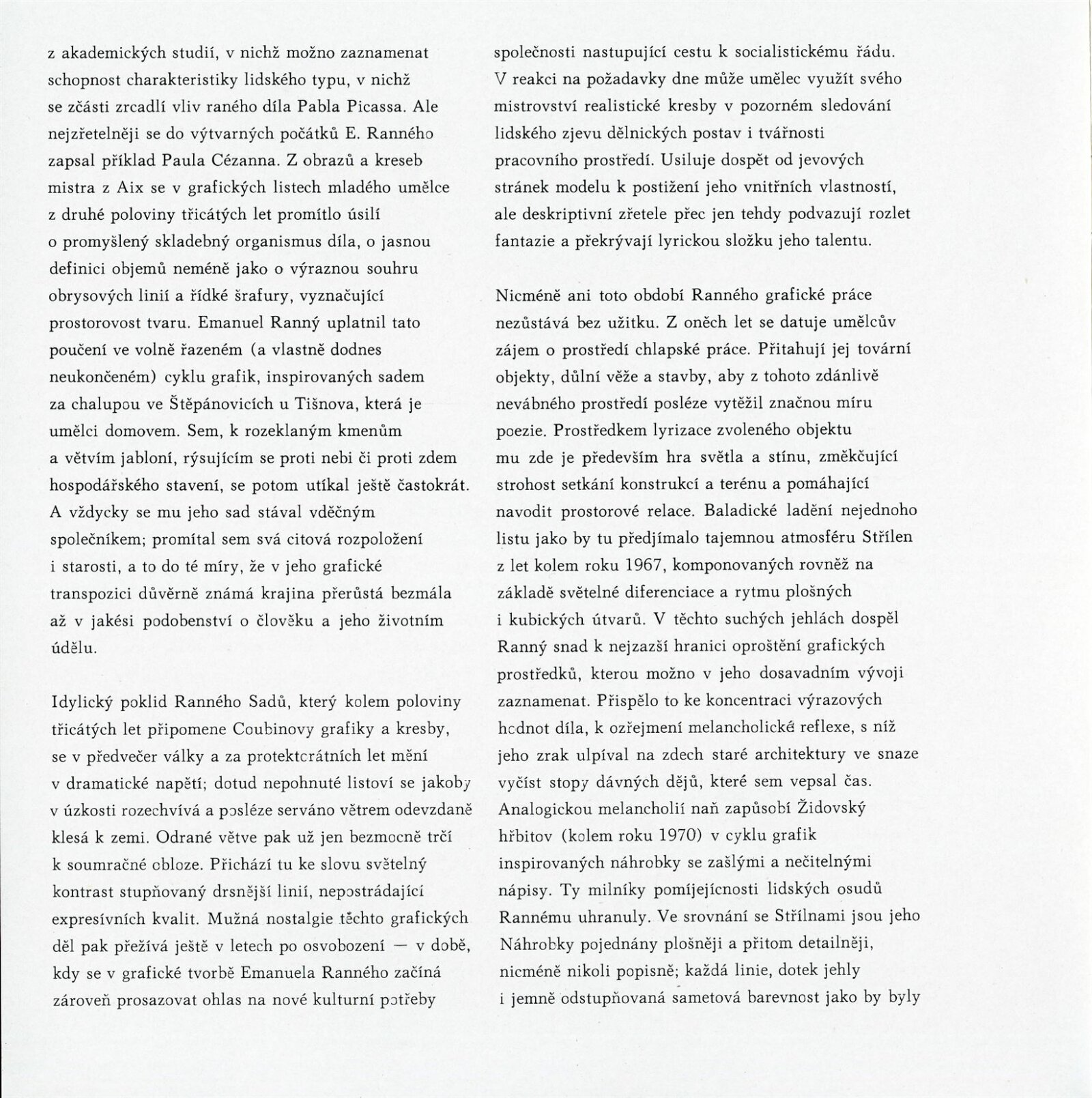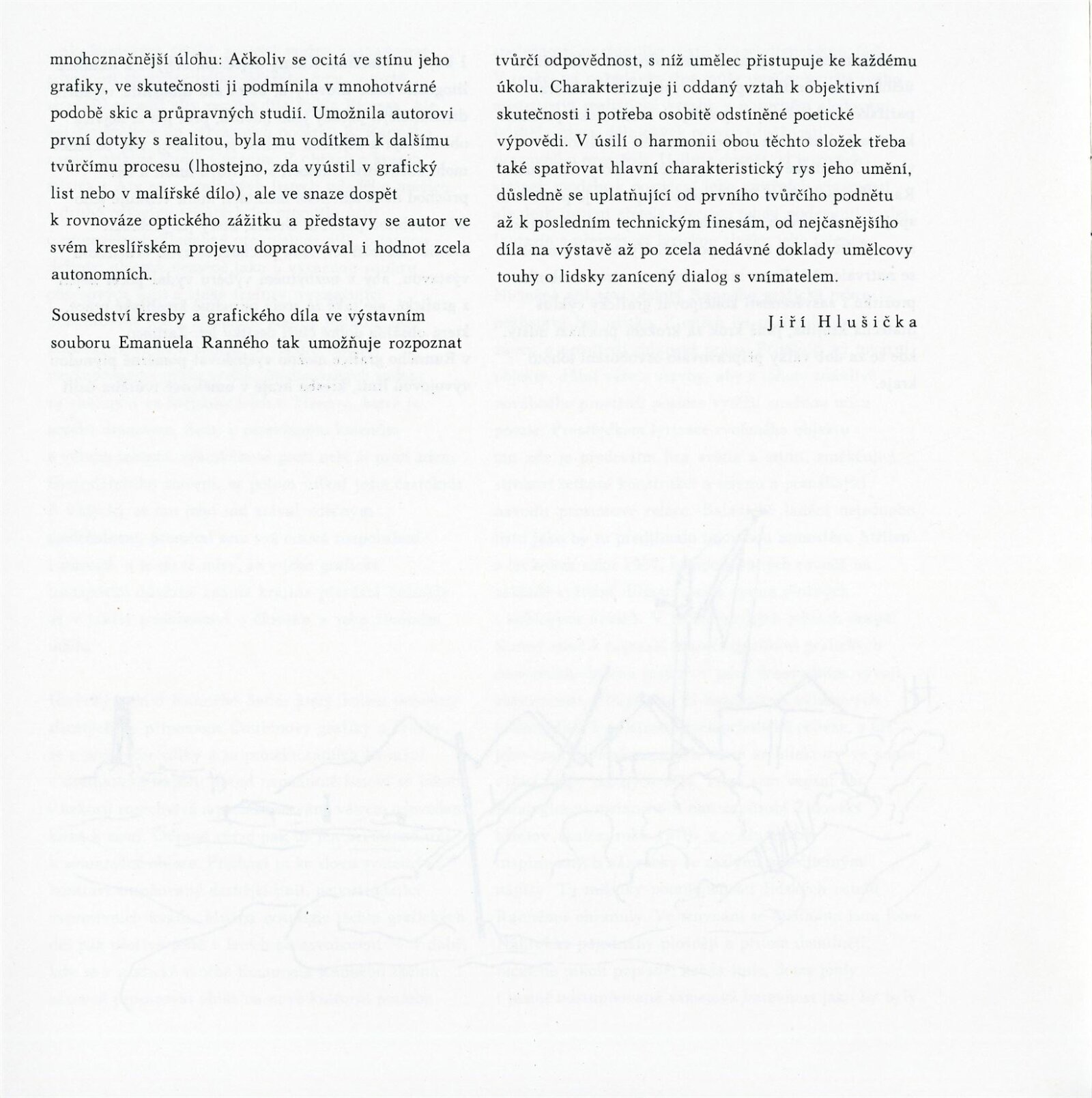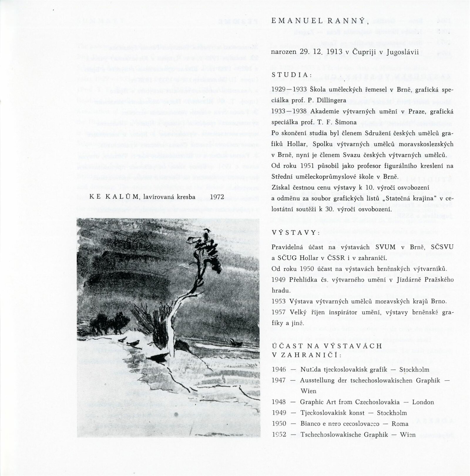 Emanuel Ranný (starší). Grafika a kresby: Dům umění / Dům pánů z Kunštátu, 162. výstava Kabinetu grafiky, 4. 3. – 10. 4. 1977 / Text: Jiří Hlušička. – Brno: DUmB, 1977. – 24 s., obr., seznam vystavených prací 2 s., DPK 645. – MZK; MG; MMB