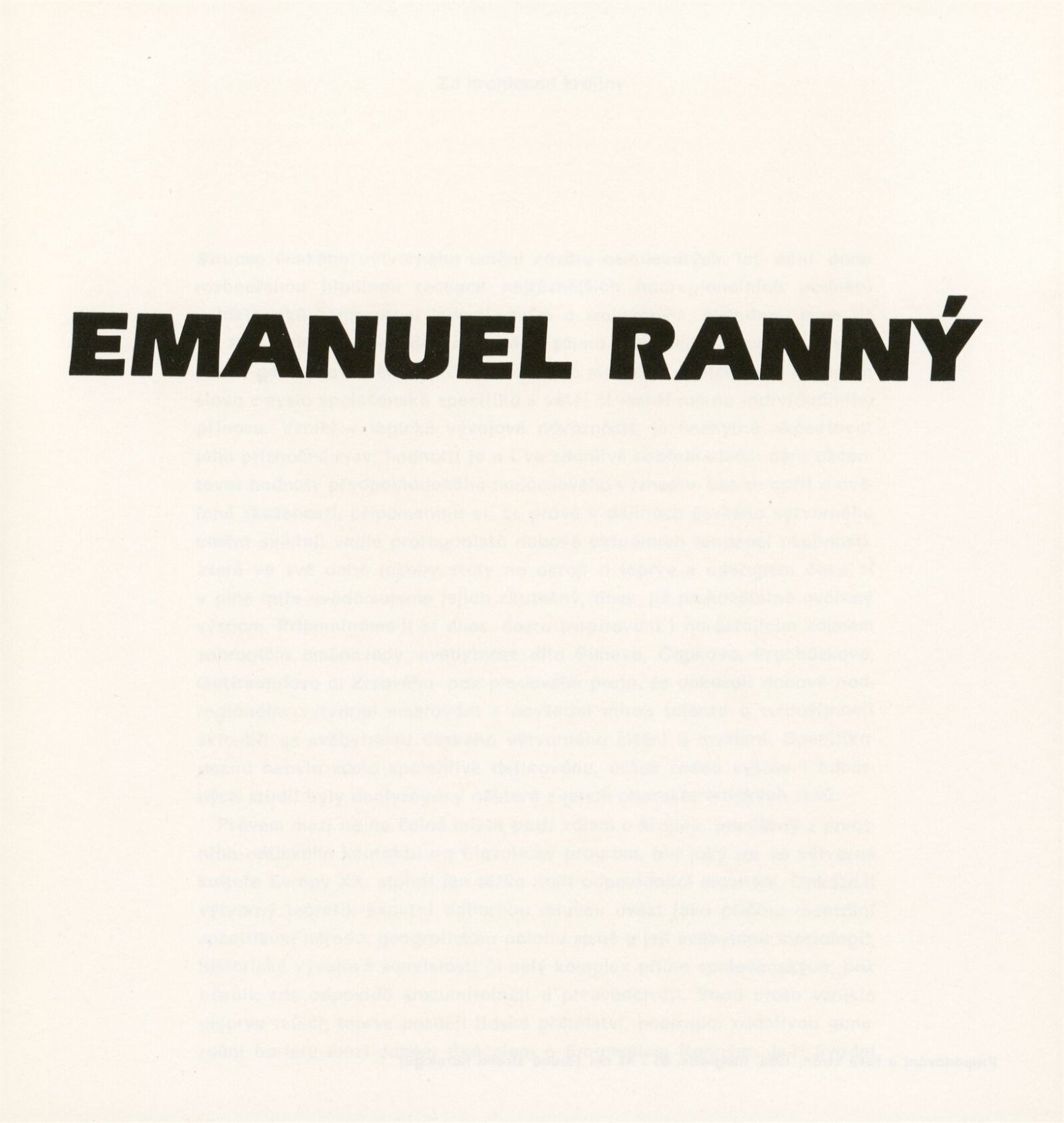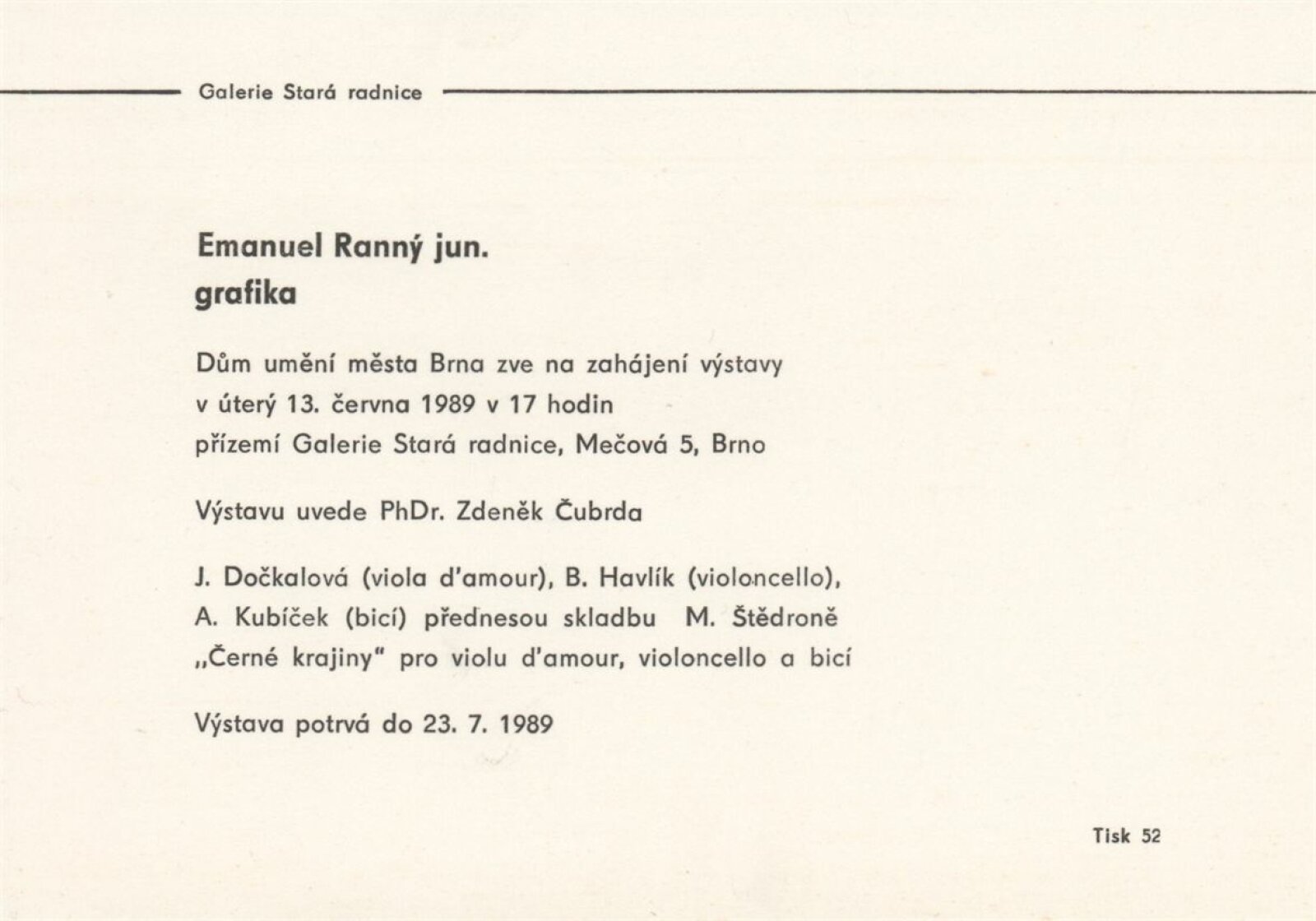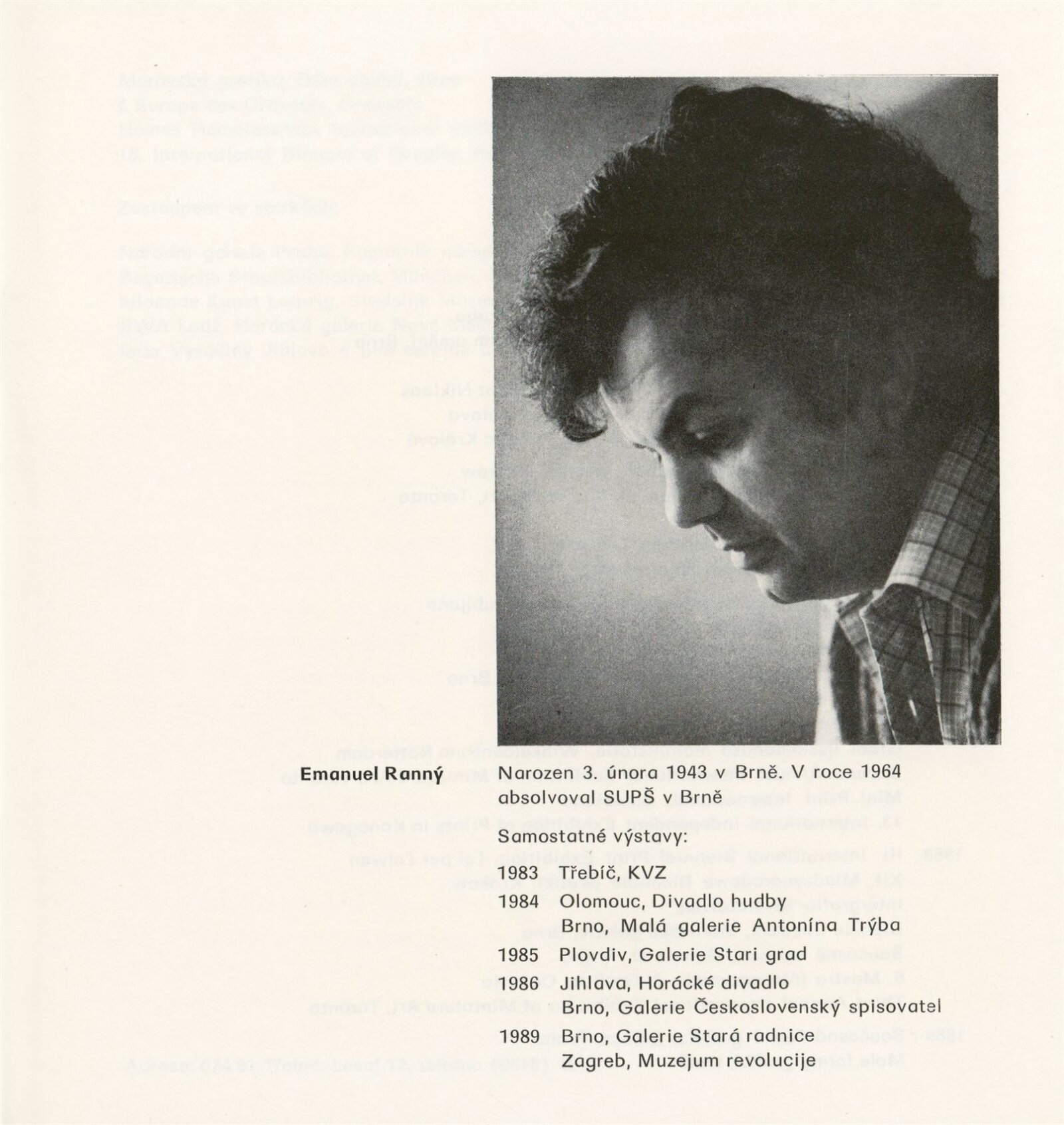Emanuel Ranný [mladší. Grafika]: Galerie Stará radnice, přízemí, 13. 6. – 23. 7. 1989 / Texty: Zdeněk Čubrda, Jan Skácel. – Brno: DUmB, 1989. – [28] s., obr., seznam vystavených prací [2] s., portrét, životní data, výstavy, zastoupení ve sbírkách, GSR 49. – MZK; MG; MMB