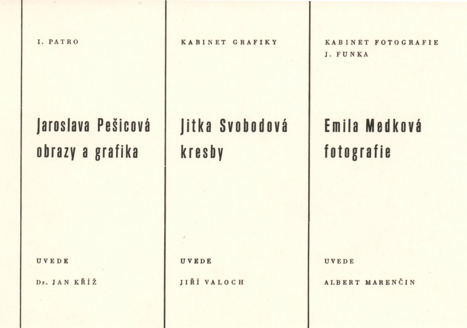 společná pozvánka pro DPK 712–714, katalog + strojopis, básně a citáty, fotografie autorky, autorské fotografie, seznam fotografií, medailony Alberta Marenčina a Ladislava Švába, korespondence (poděkování za výstavu od autorky, žádost o povolení výstavy), recenze v tisku