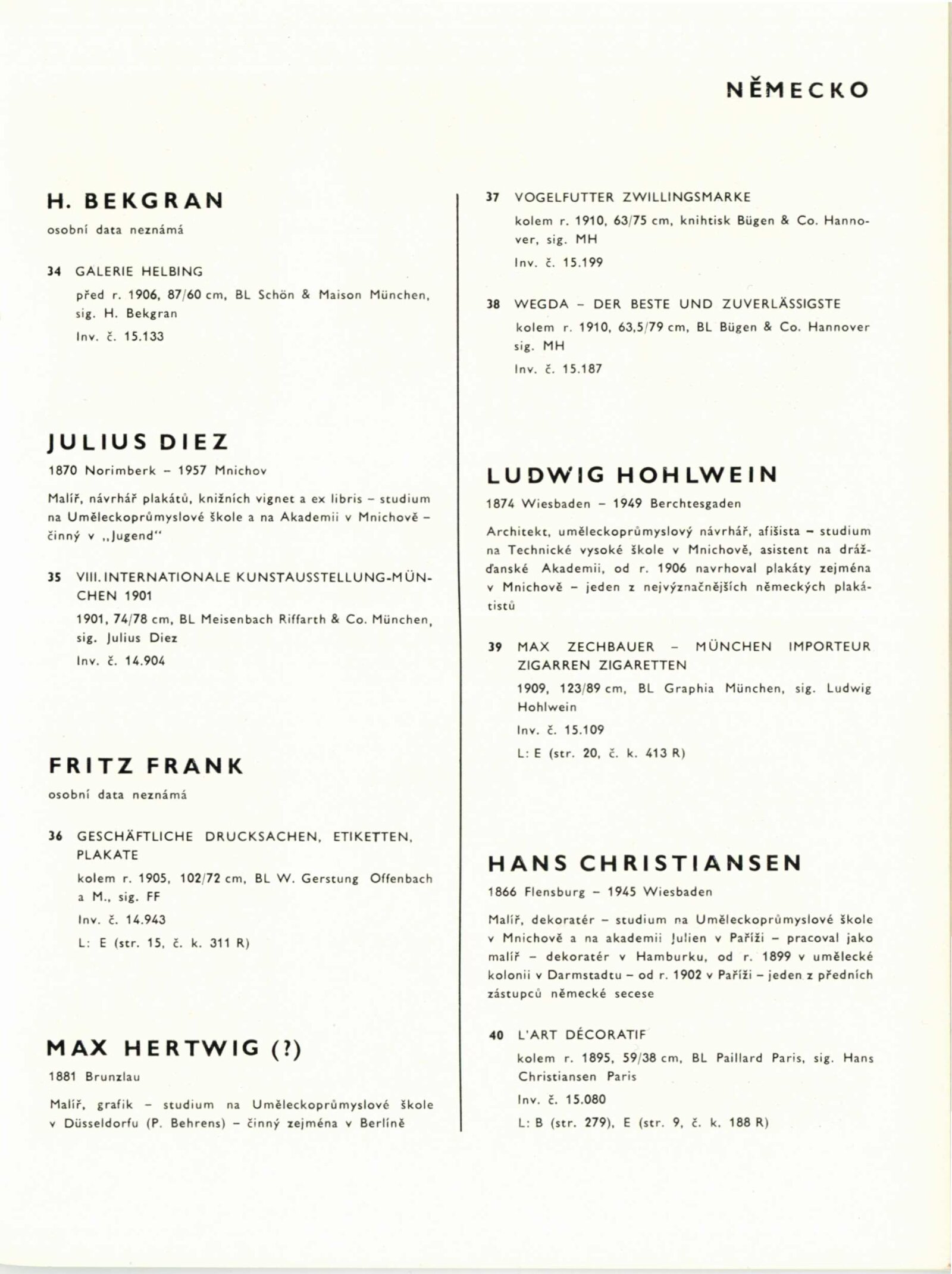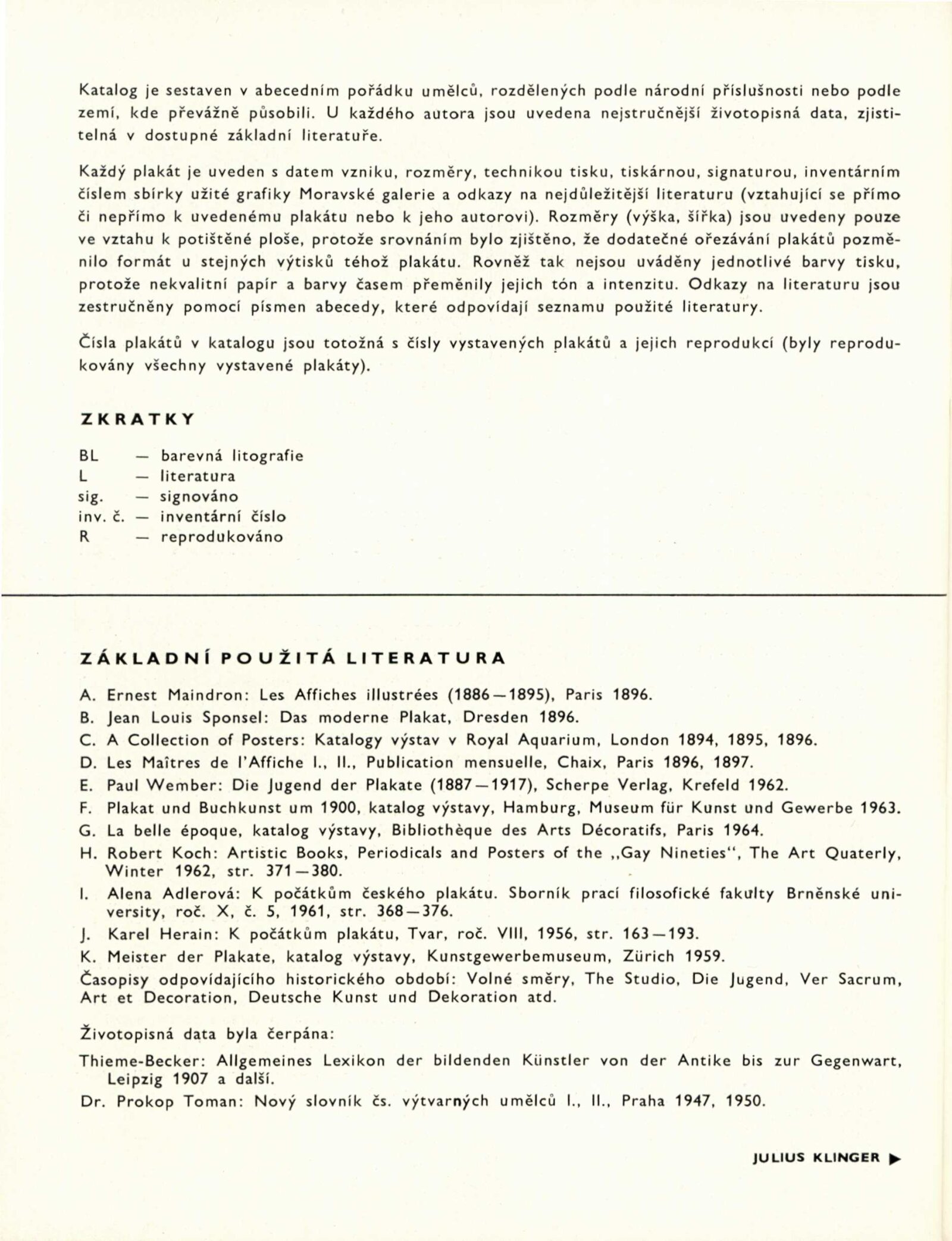 100 plakátů z přelomu století ze sbírek Moravské galerie v Brně: Dům umění města Brna / Dům pánů z Kunštátu, 11. 3. – 1. 5. 1966 / Text: Karel Holešovský. – Brno: Moravská galerie, 1966. – 42 s., obr., životní data autorů, bibliografie, DPK 298. – MZK; MG
