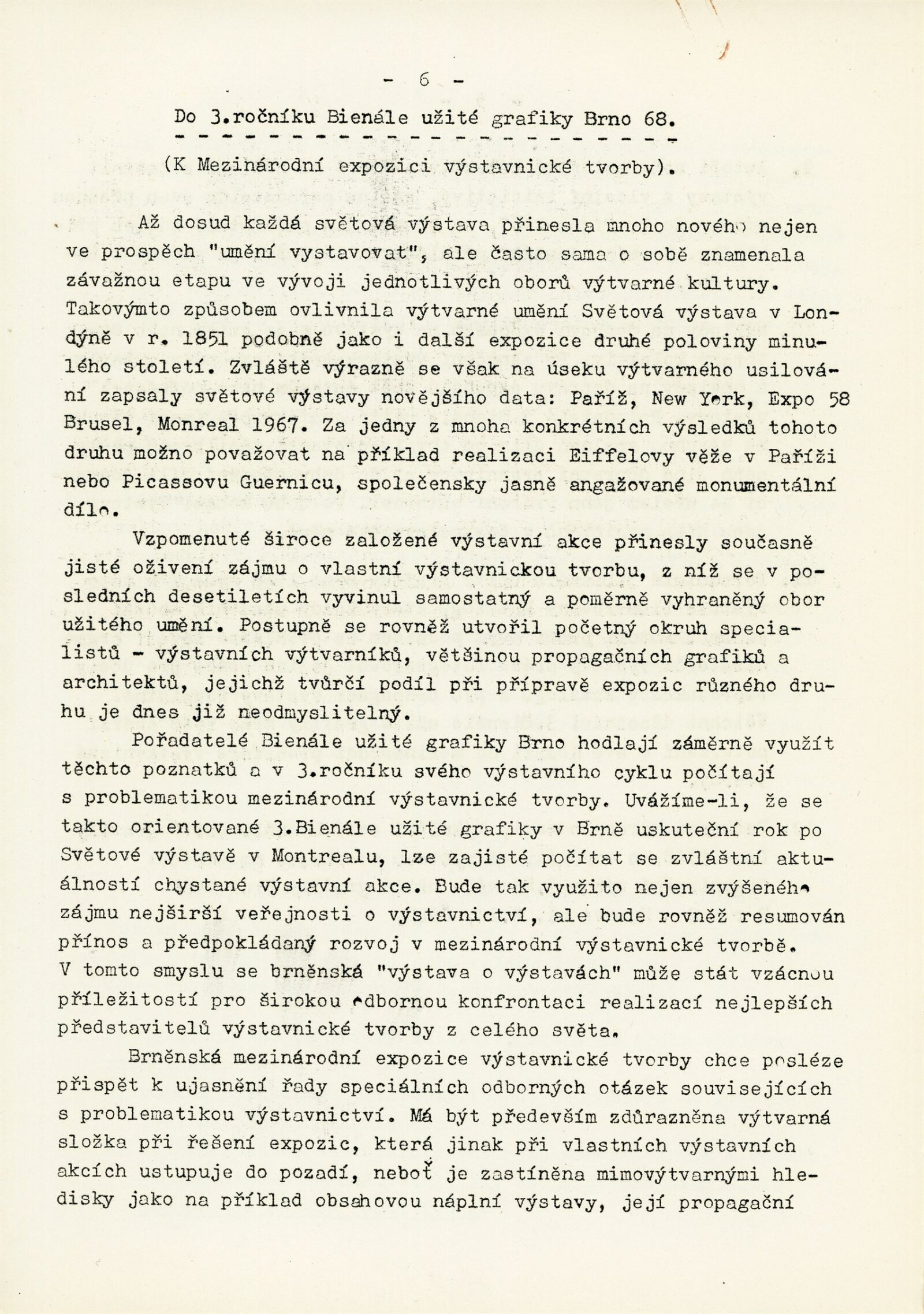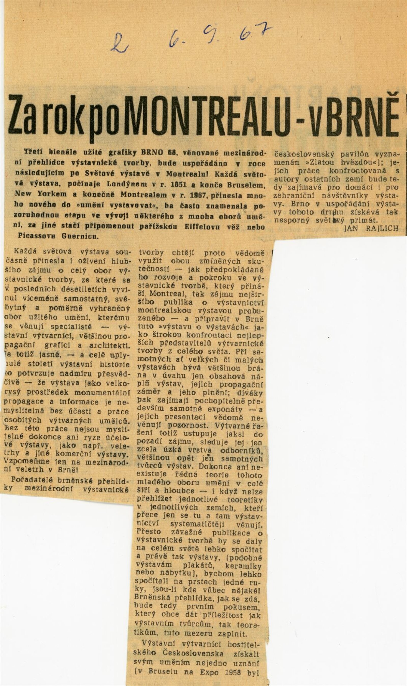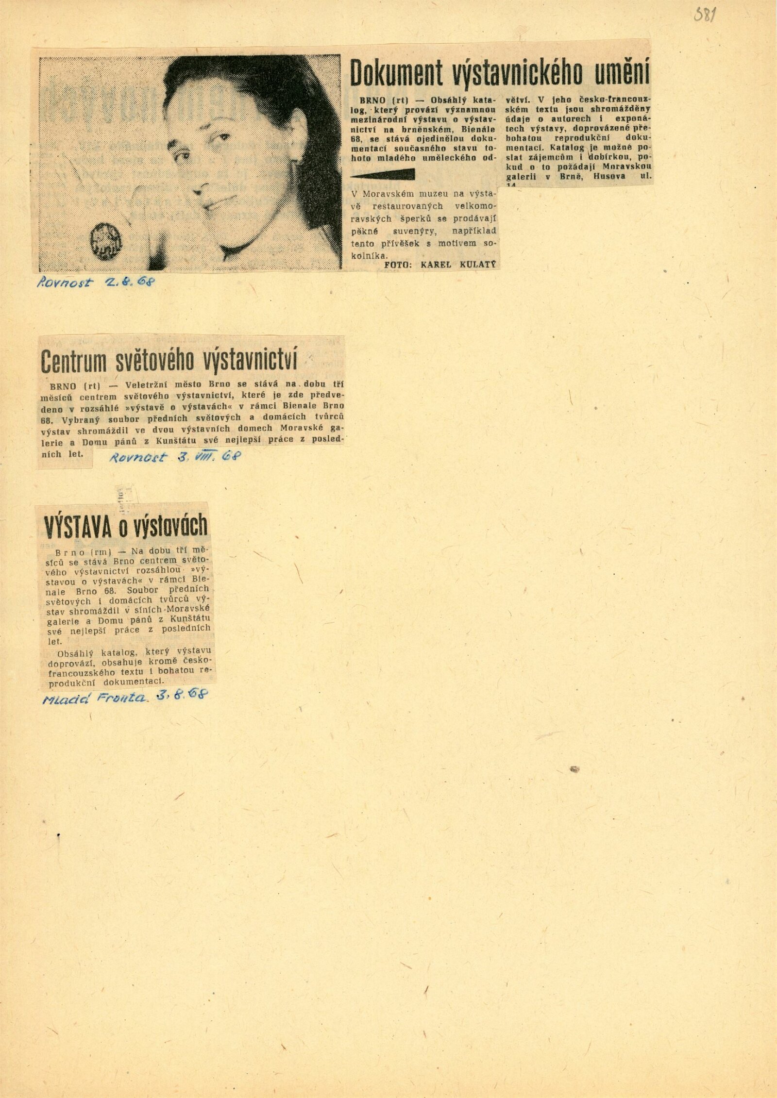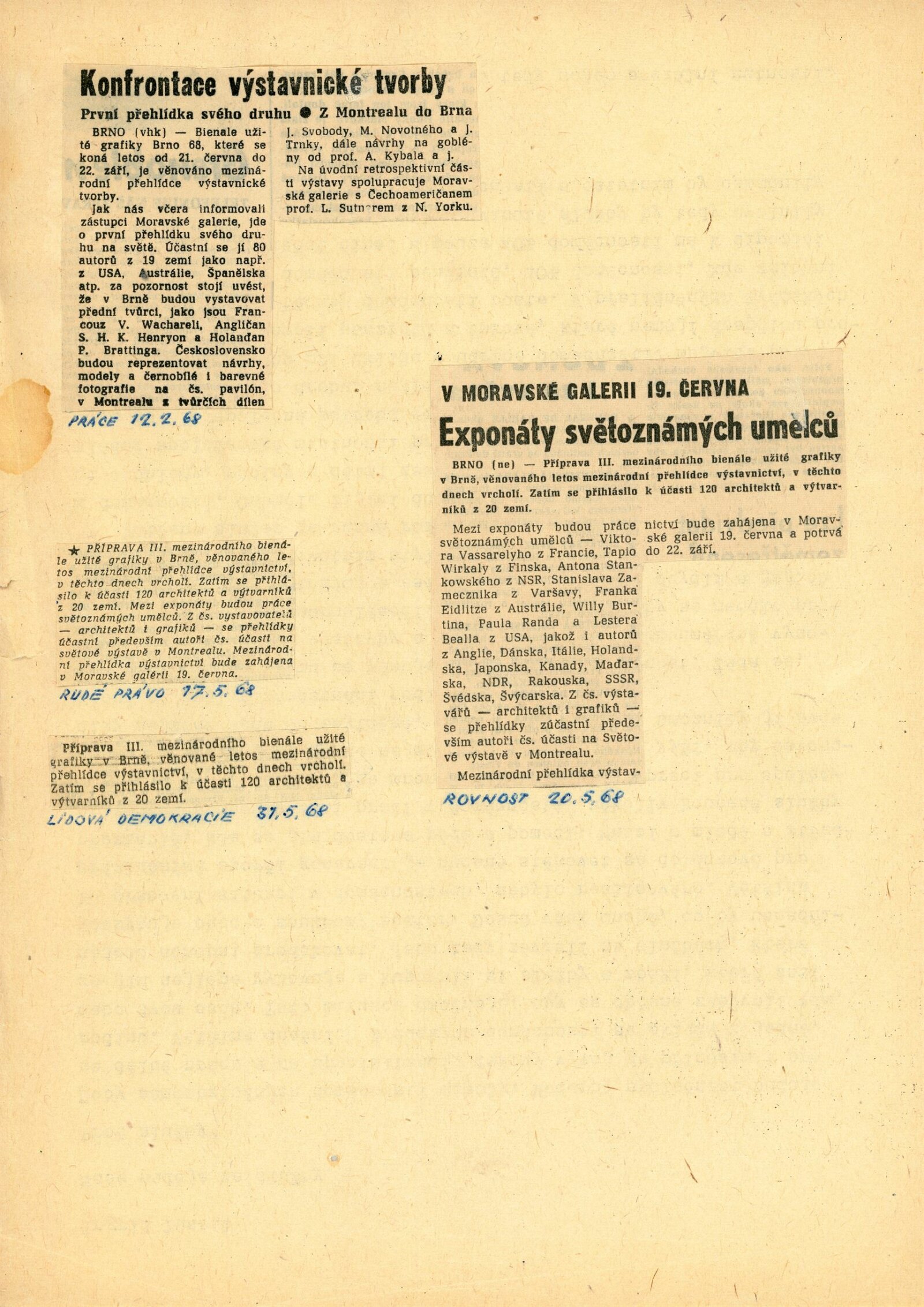 Mezinárodní přehlídka výstavnické tvorby. 3. bienále užité grafiky Brno ´68: Dům umění města Brna / Dům pánů z Kunštátu, Moravská galerie v Brně, 19. 6. – 22. 9. 1968 / Texty: Jan Rajlich, Ladislav Sutnar. – Brno: Moravská galerie, 1968. – 114 s., 144 s. obr. příl., název a text též francouzsky, DPK 381. – MZK