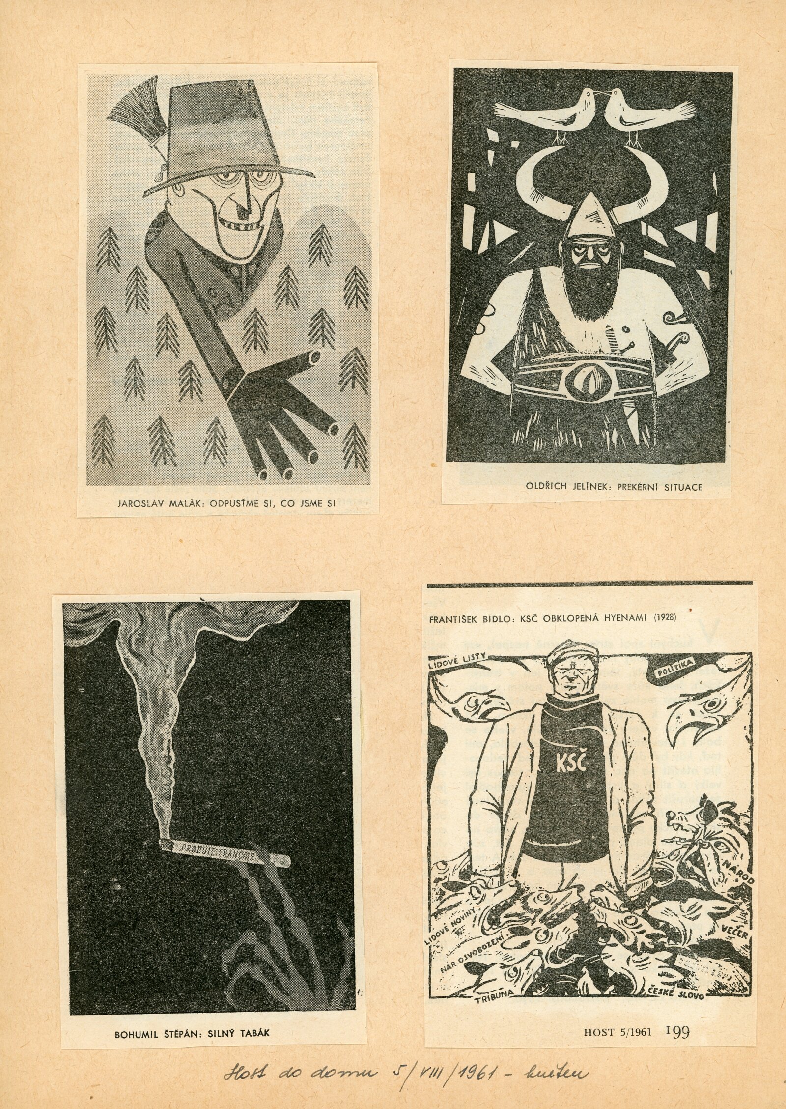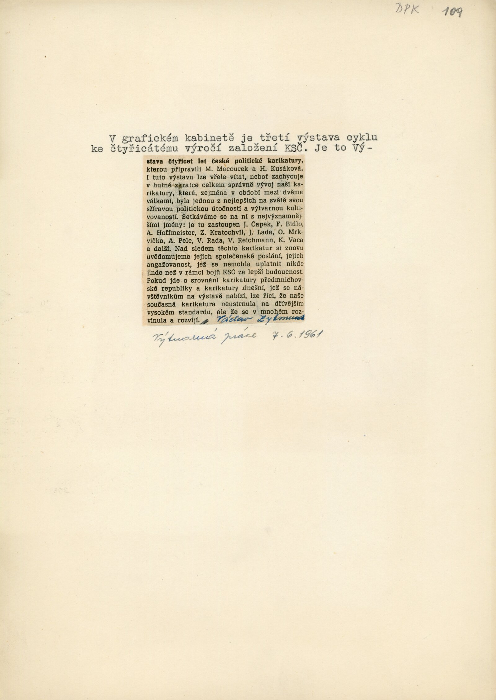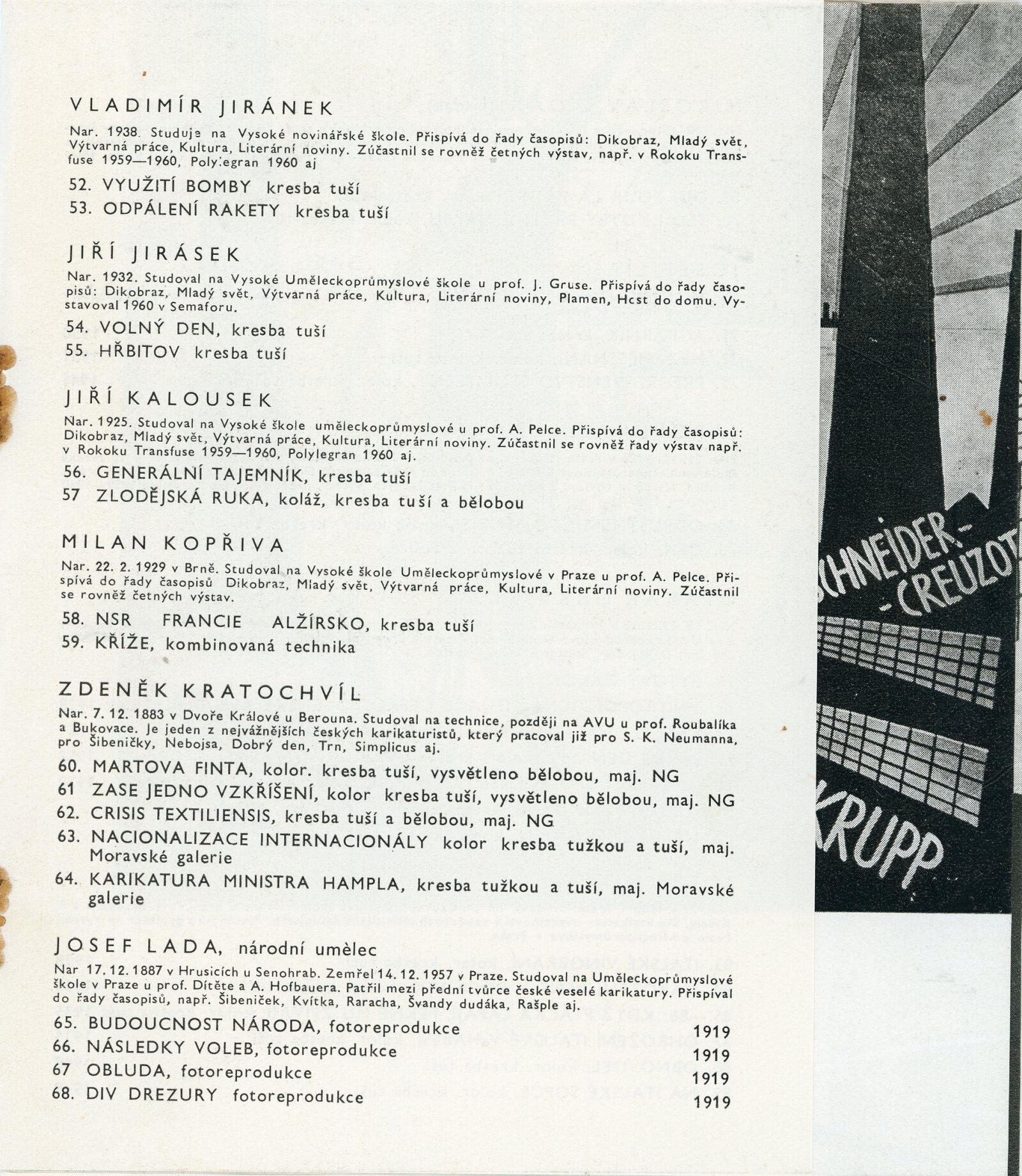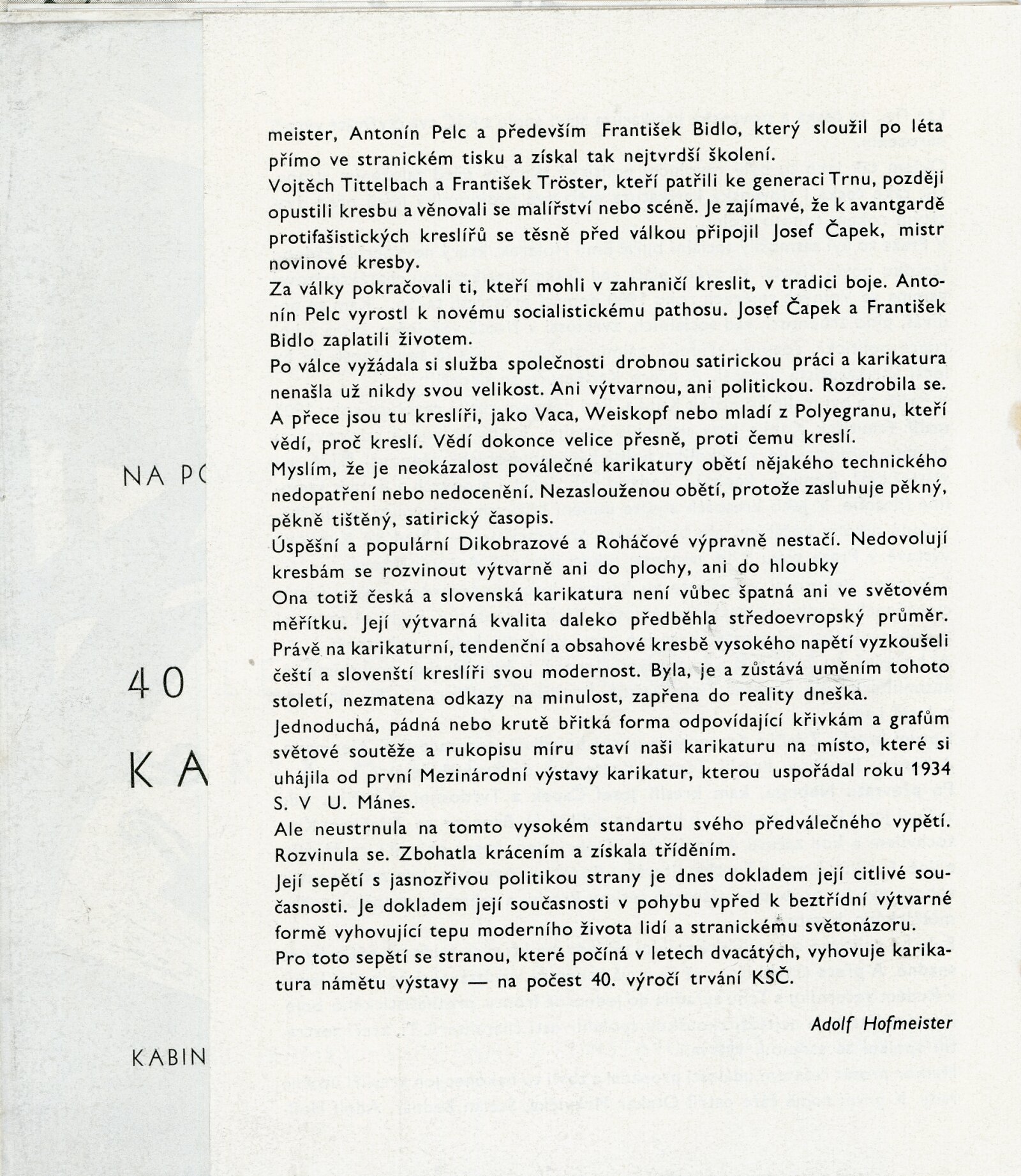 40 let české politické karikatury: Dům umění města Brna / Dům pánů z Kunštátu, 24. výstava Kabinetu grafiky, 6. 5. – 27. 5. 1961 / Text: Adolf Hoffmeister. – Brno: DUmB, 1961. – 16 s., obr., životní data, DPK 109. – MZK; MG; MMB