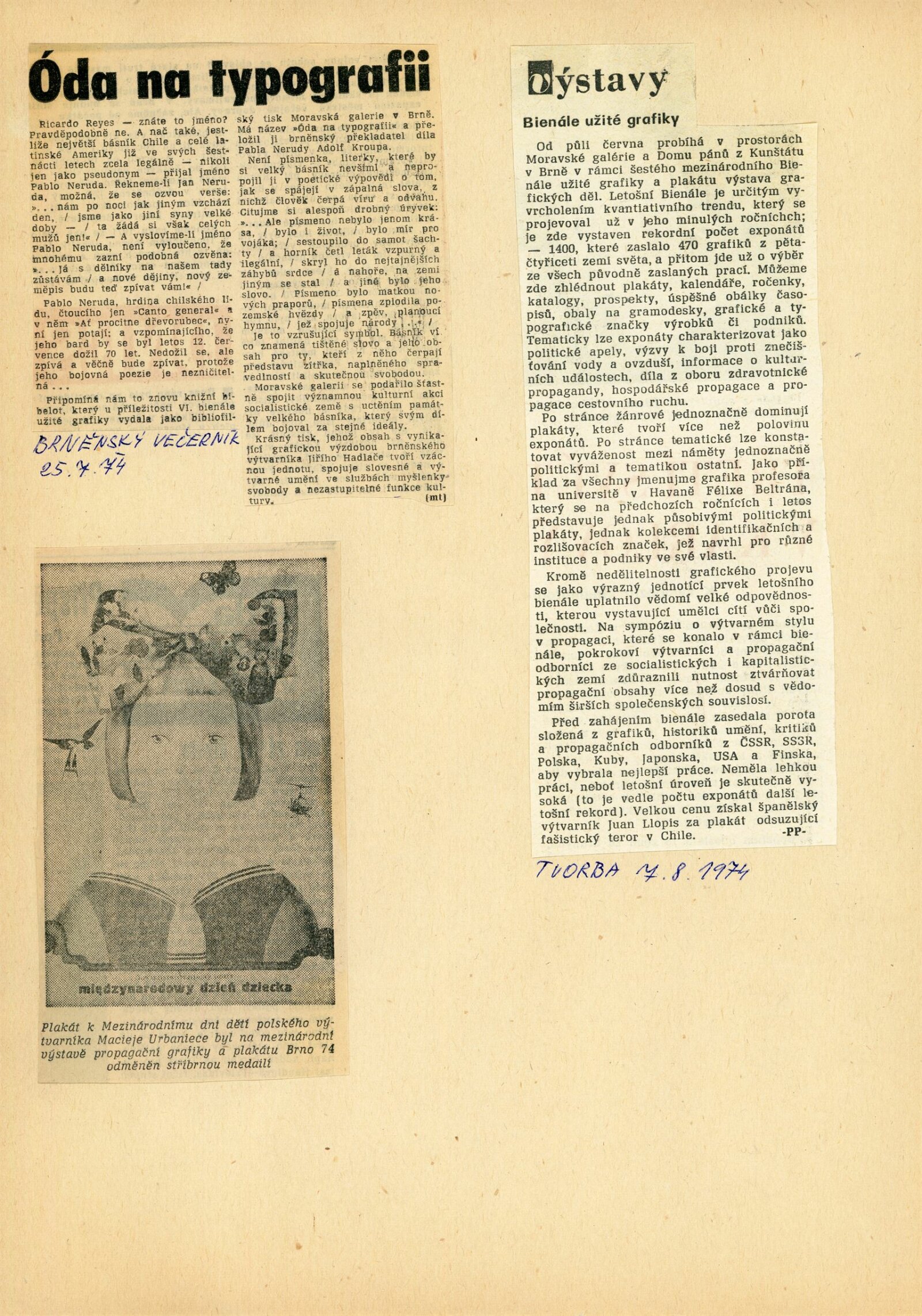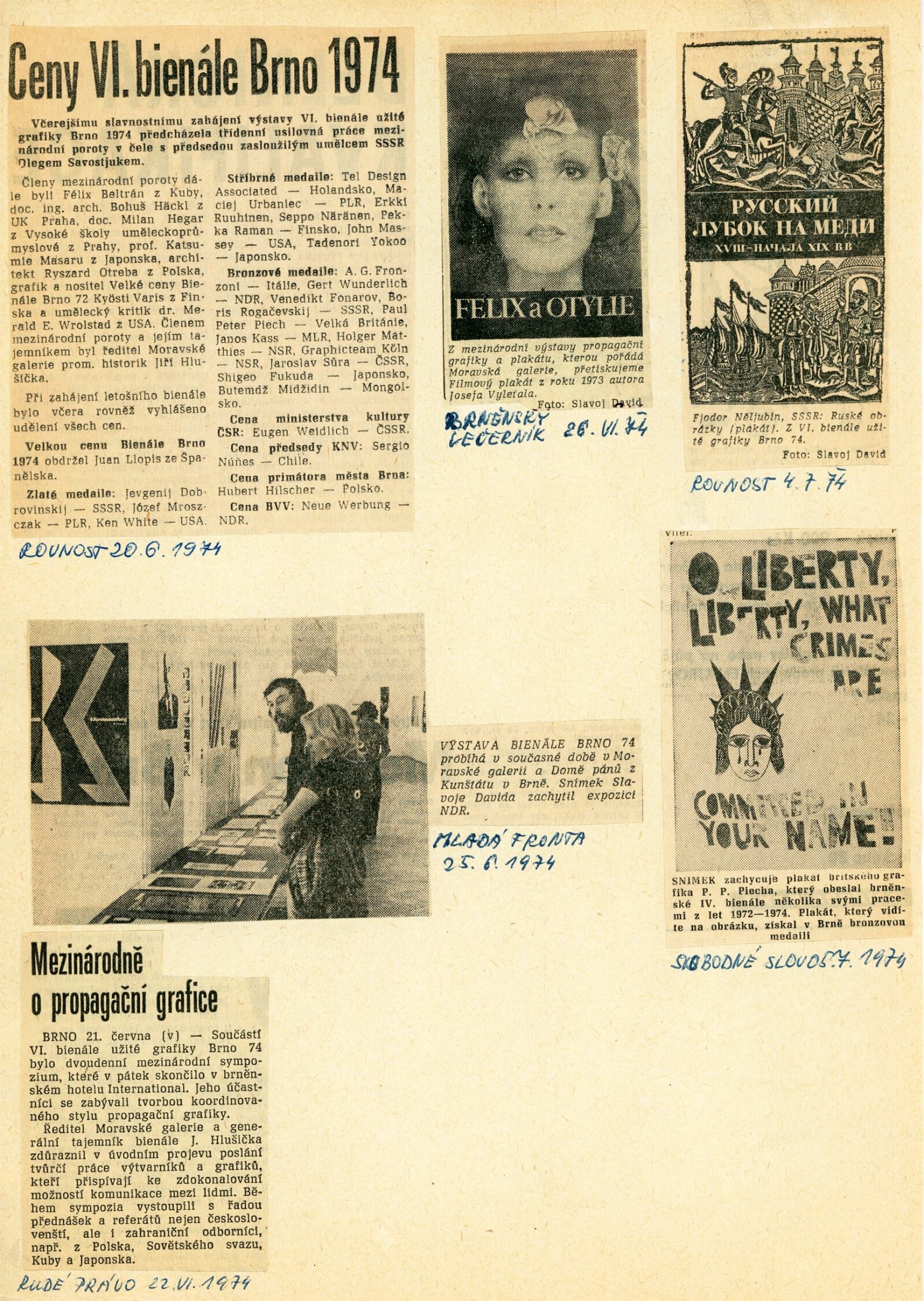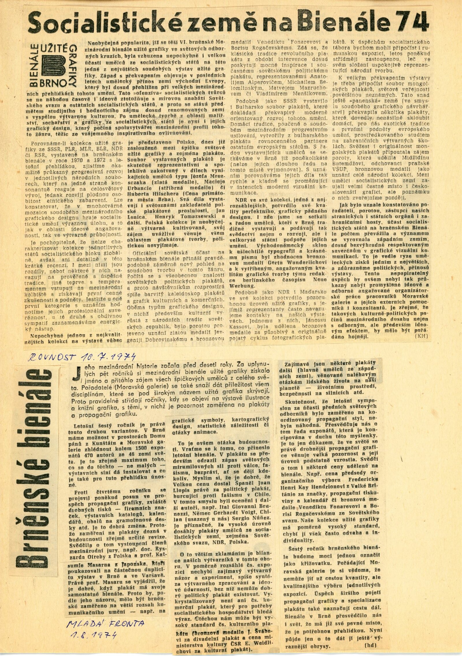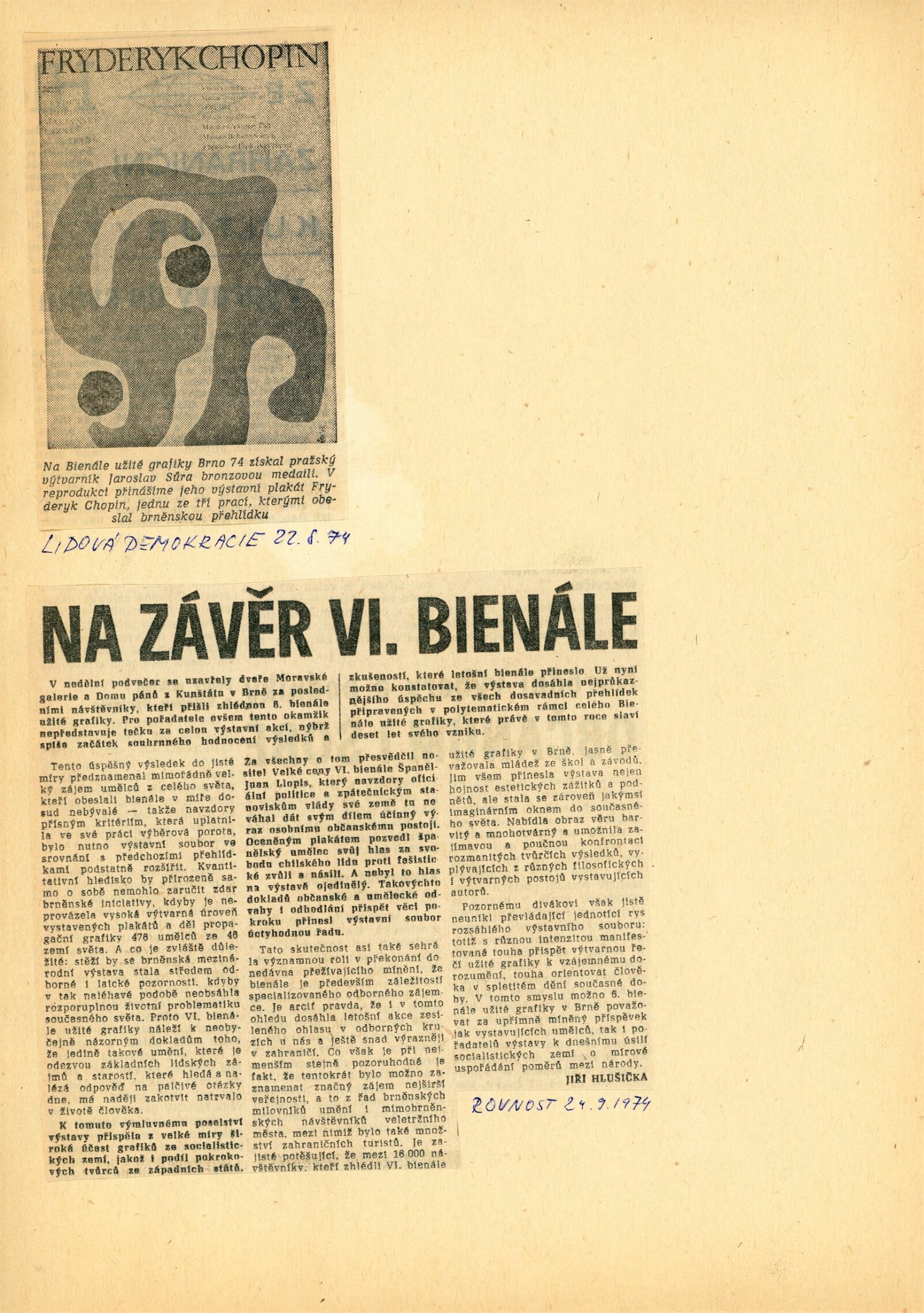 Mezinárodní výstava propagační grafiky a plakátu: 6. bienále užité grafiky Brno 1974: Dům umění / Dům pánů z Kunštátu, Moravská galerie v Brně, 19. 6. – 22. 9. 1974 / Text: Jiří Hlušička. – Brno: Moravská galerie, 1974. – 326 s., obr., název a text též francouzsky, životopisy vystavujících, přehled cen a uznání z roku 1970 a 1972, DPK 573. – MZK; MG