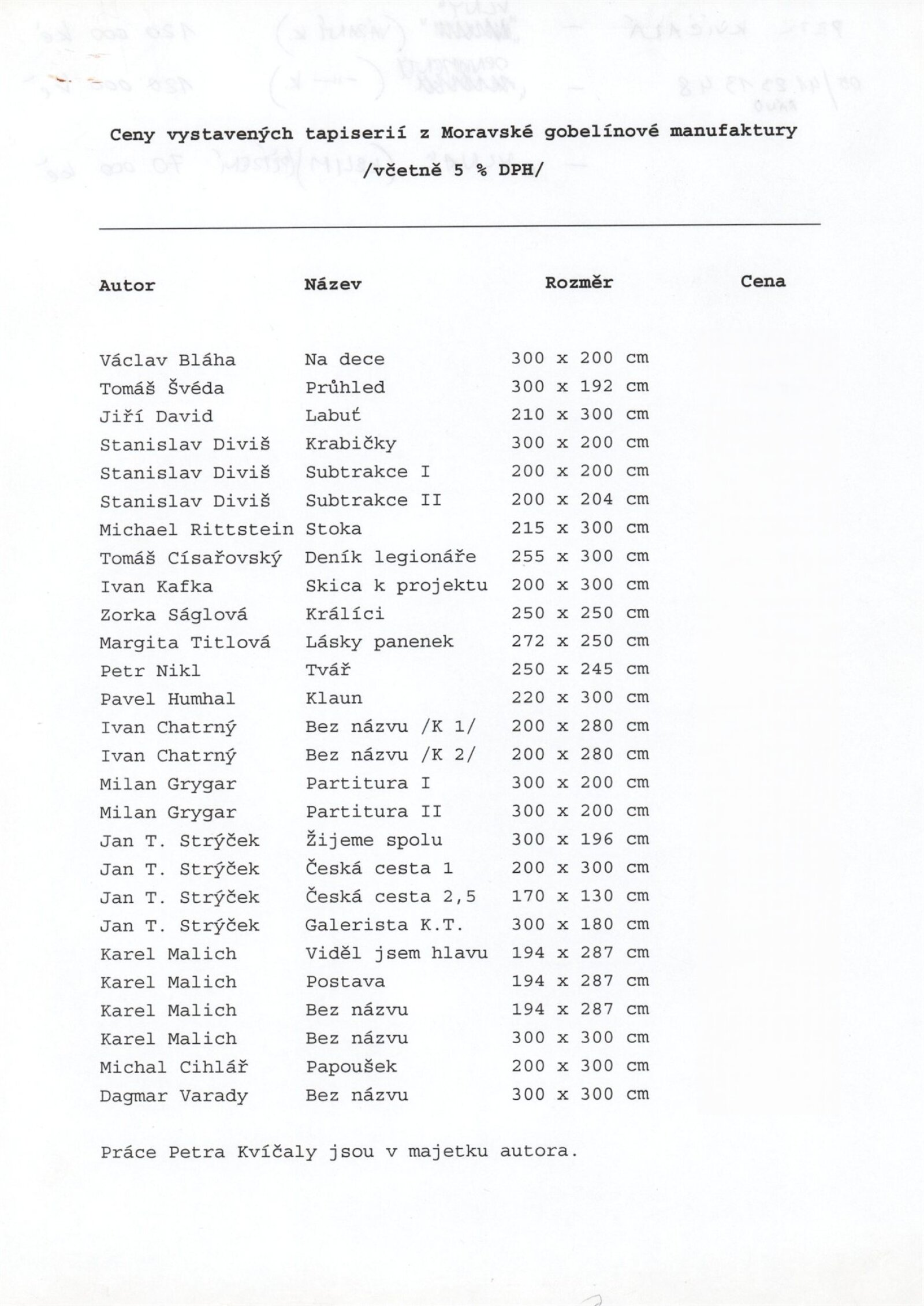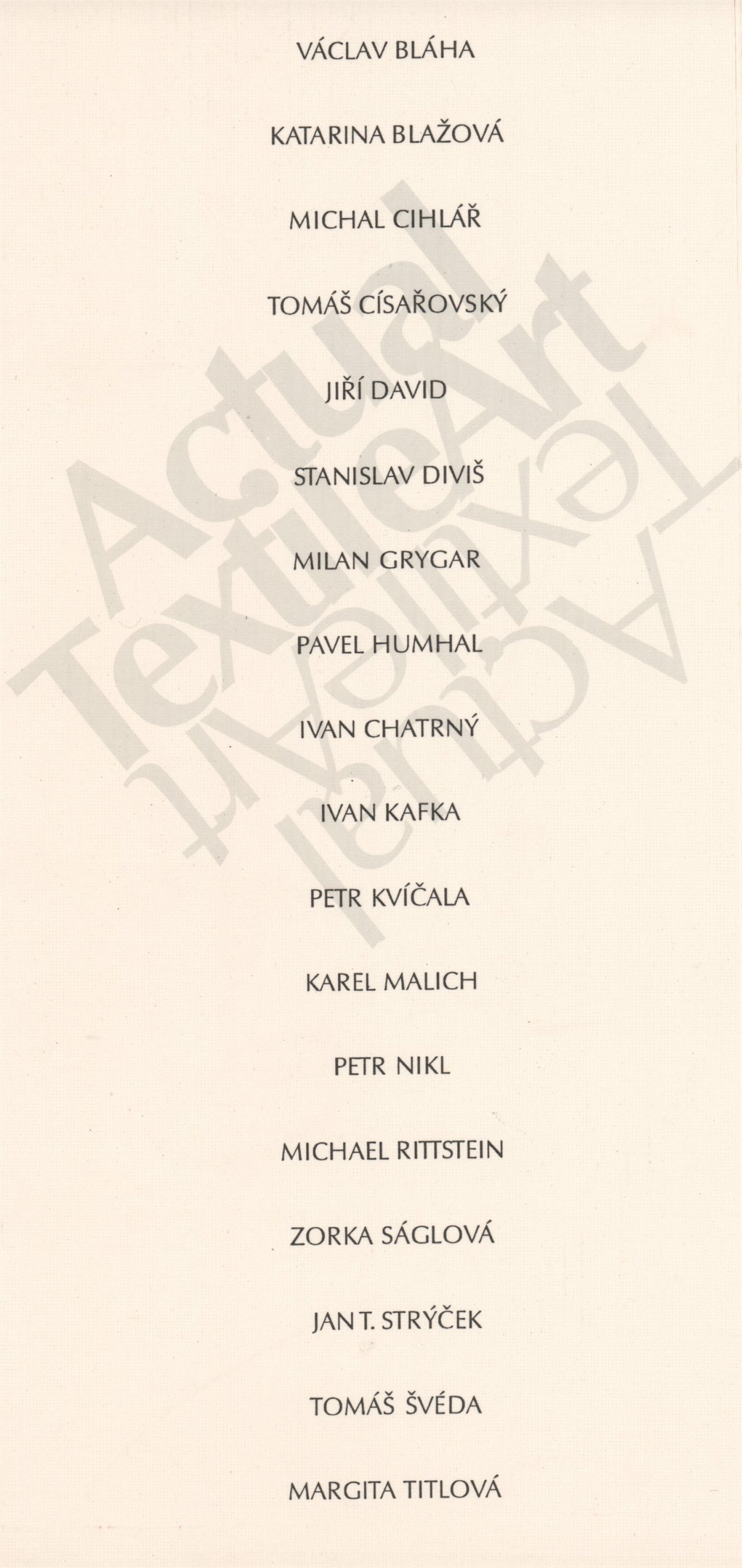 Václav Bláha, Katarina Blažová, Michal Cihlář, Tomáš Císařovský, Jiří David, Stanislav Diviš, Milan Grygar, Pavel Humhal, Ivan Chatrný, Ivan Kafka, Petr Kvíčala, Karel Malich, Petr Nikl, Michael Rittstein, Zorka Ságlová, Jan T. Strýček, Tomáš Švéda, Margita Titlová