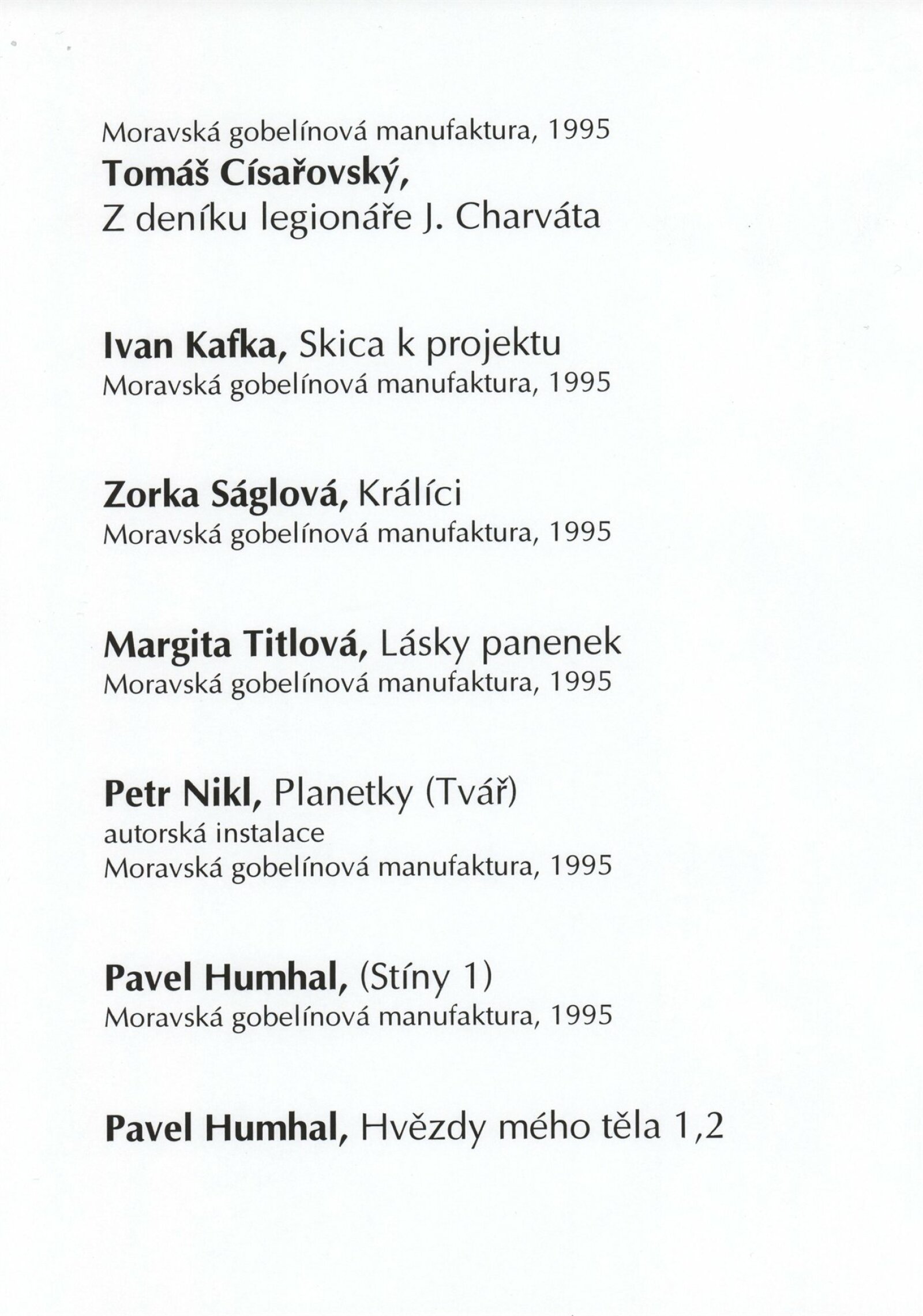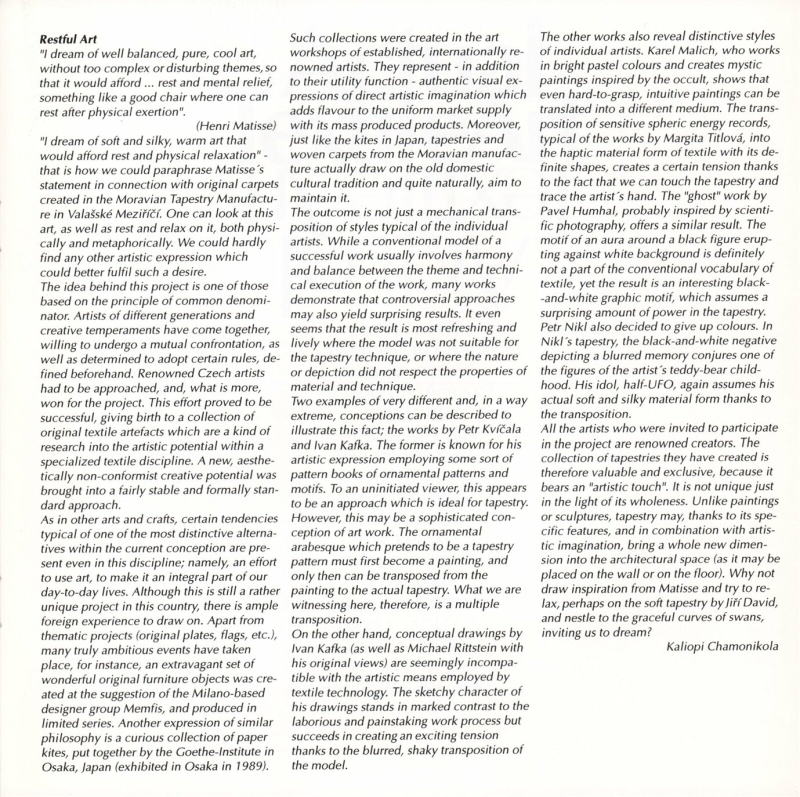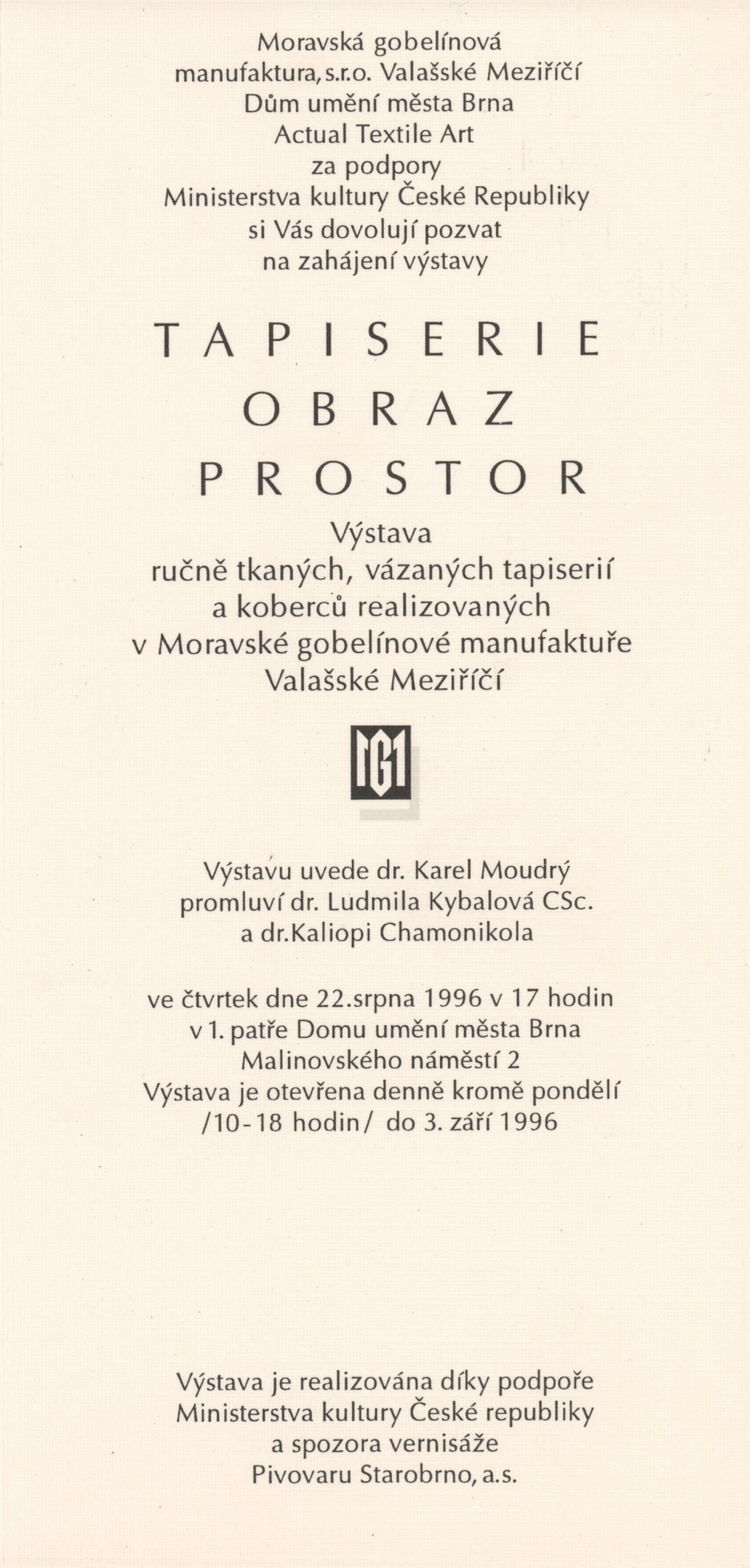 Actual Textile Art. Výstava ručně tkaných, vázaných tapiserií a koberců realizovaných v Moravské gobelínové manufaktuře Valašské Meziříčí: Dům umění města Brna, 22. 8. – 3. 9. 1996 / Texty: Ludmila Kybalová, Kaliopi Chamonikola. – Valašské Meziříčí: Moravská gobelínová manufaktrura, 1996. – [60] s., obr., DU 1030