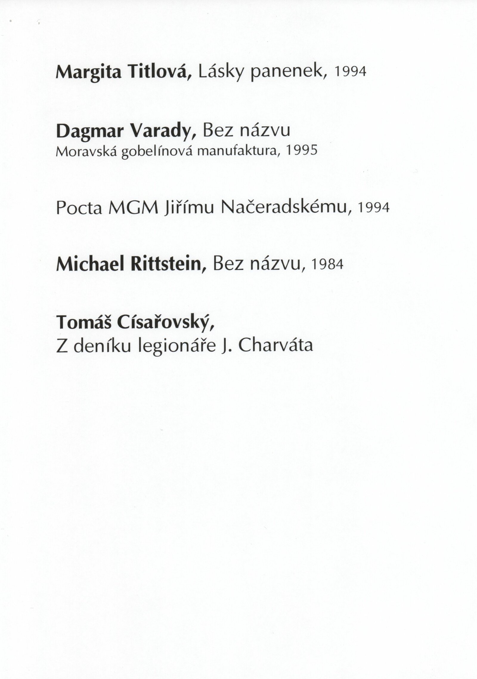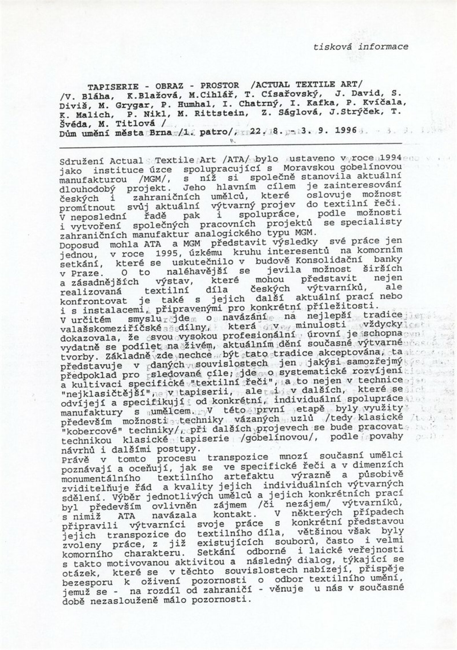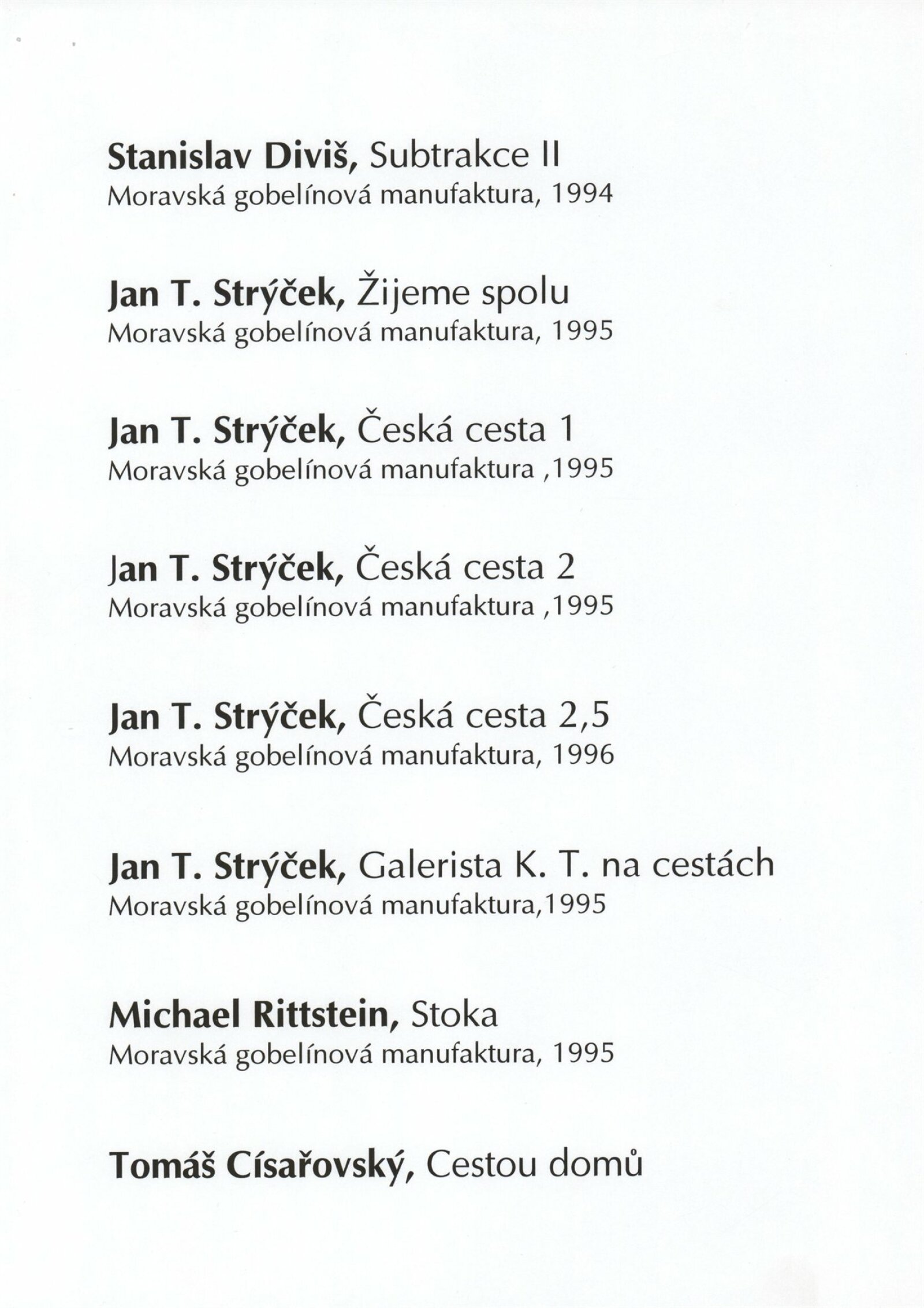 Actual Textile Art. Výstava ručně tkaných, vázaných tapiserií a koberců realizovaných v Moravské gobelínové manufaktuře Valašské Meziříčí: Dům umění města Brna, 22. 8. – 3. 9. 1996 / Texty: Ludmila Kybalová, Kaliopi Chamonikola. – Valašské Meziříčí: Moravská gobelínová manufaktrura, 1996. – [60] s., obr., DU 1030