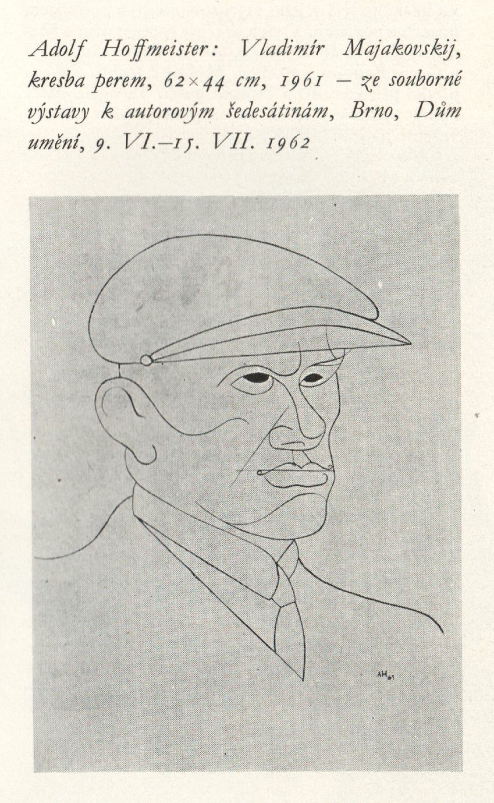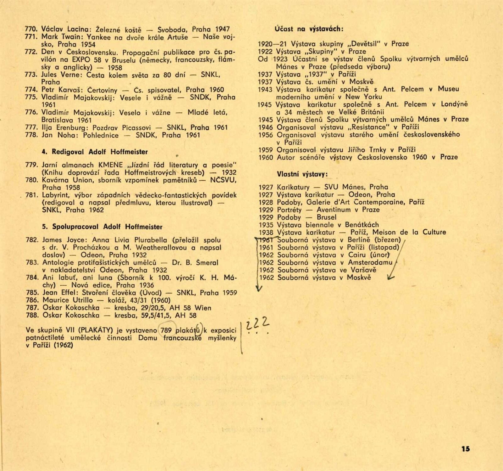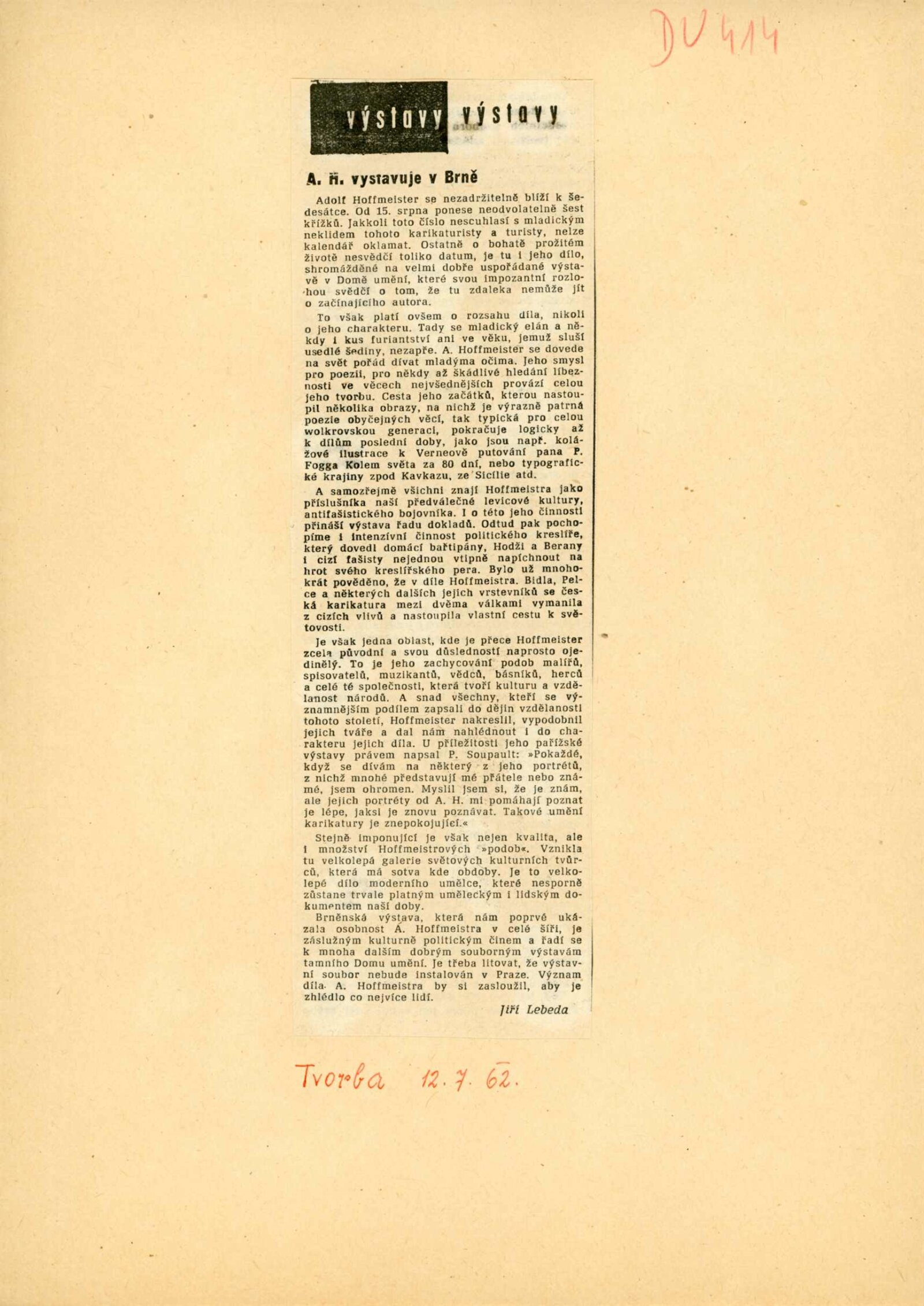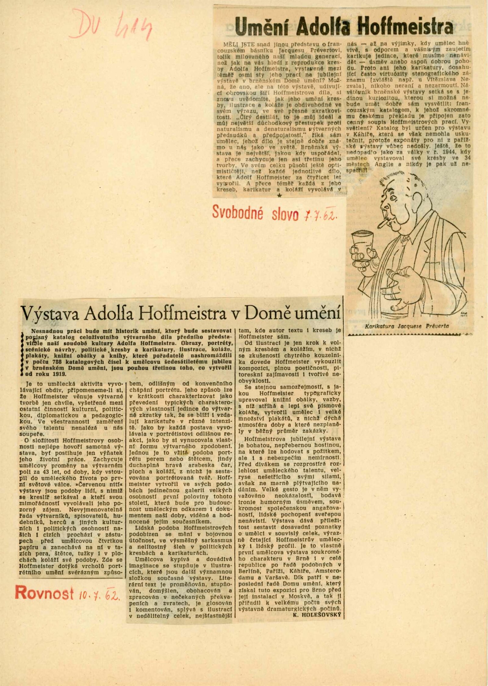 Adolf Hoffmeister. Objevy metodou smíchu – kresby, ilustrace, kvaše, oleje: Dům umění, 1. patro, 9. 6. – 15. 7. 1962 / Převzatý katalog s francouzským textem doplněný o český překlad. Adolf Hoffmeister. Visages, illustrations, collages / francouzské texty: Miroslav Lamač, Adolf Hoffmeister, Aragon, Georges Ribemont-Desaignes, Roger Vailland, Boris Efimov, William Gropper, David Low, Karel Teige, Philippe Soupault, Pablo Neruda. – Praha: Výstavnictví. – 26 s., obr., soupis prací souborné výstavy Jan Tomeš. – Brno: DUmB, 1962. – 15 s., DU 414. – MZK