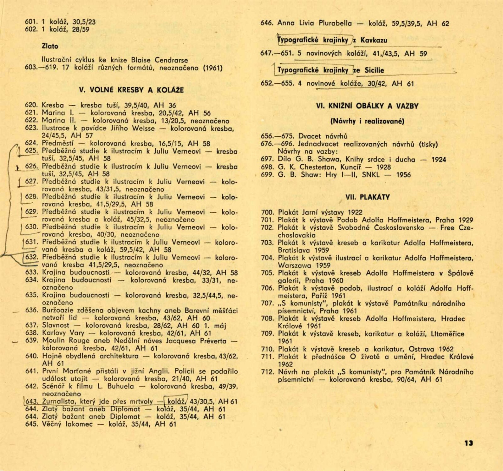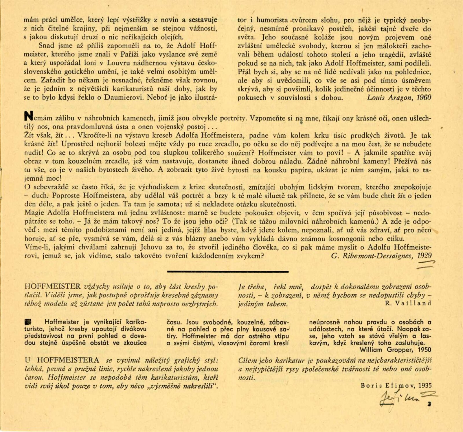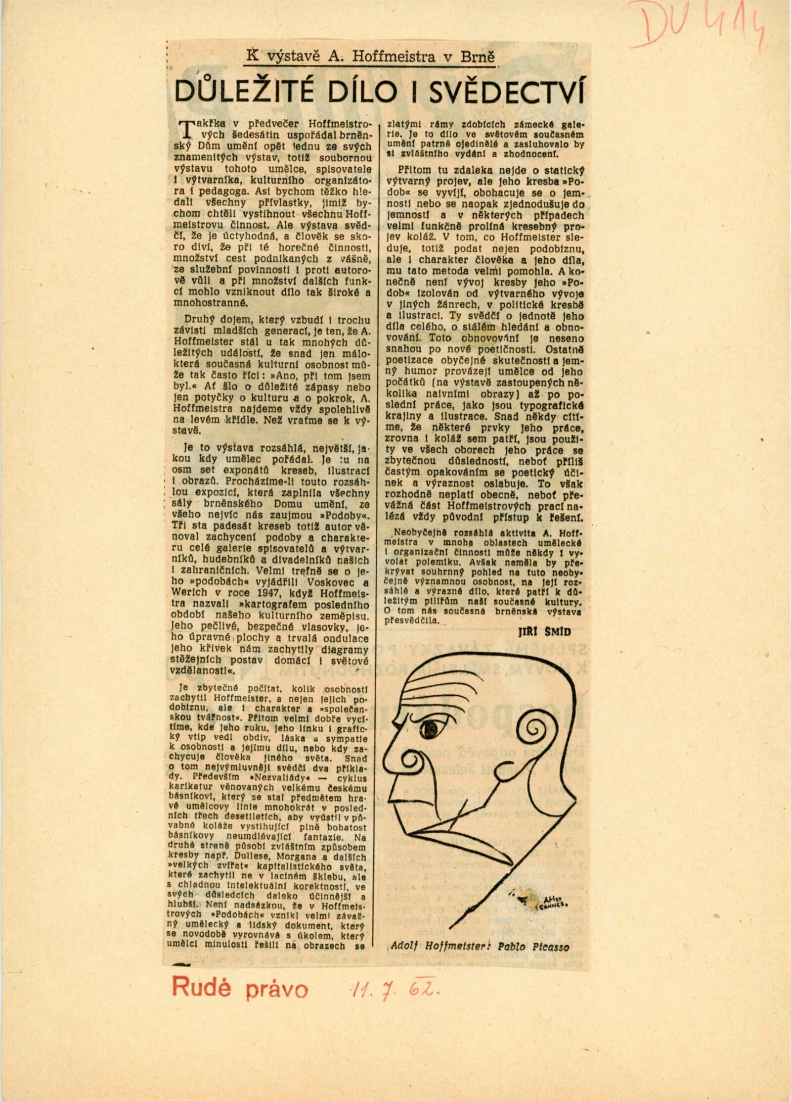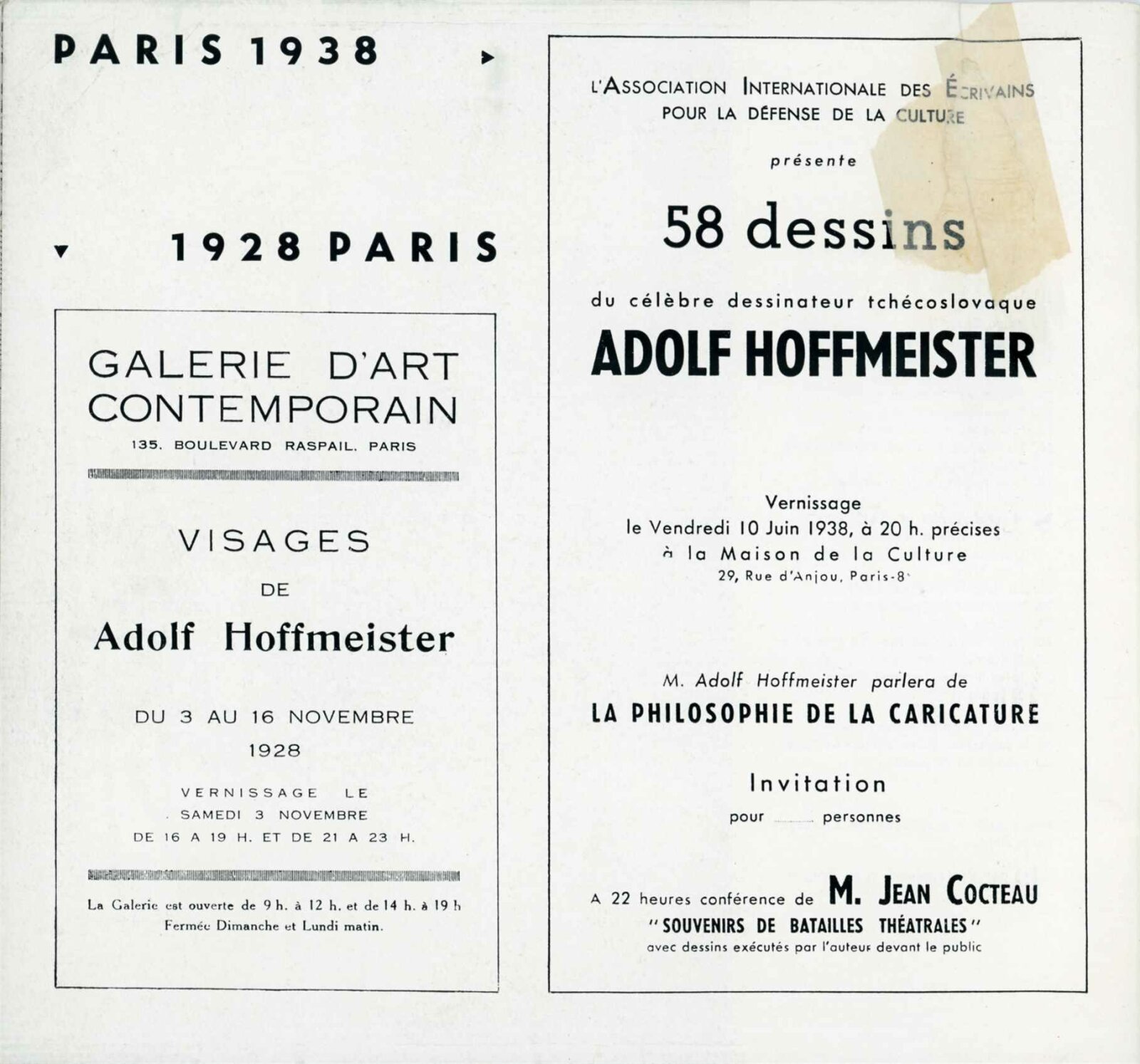 Adolf Hoffmeister. Objevy metodou smíchu – kresby, ilustrace, kvaše, oleje: Dům umění, 1. patro, 9. 6. – 15. 7. 1962 / Převzatý katalog s francouzským textem doplněný o český překlad. Adolf Hoffmeister. Visages, illustrations, collages / francouzské texty: Miroslav Lamač, Adolf Hoffmeister, Aragon, Georges Ribemont-Desaignes, Roger Vailland, Boris Efimov, William Gropper, David Low, Karel Teige, Philippe Soupault, Pablo Neruda. – Praha: Výstavnictví. – 26 s., obr., soupis prací souborné výstavy Jan Tomeš. – Brno: DUmB, 1962. – 15 s., DU 414. – MZK