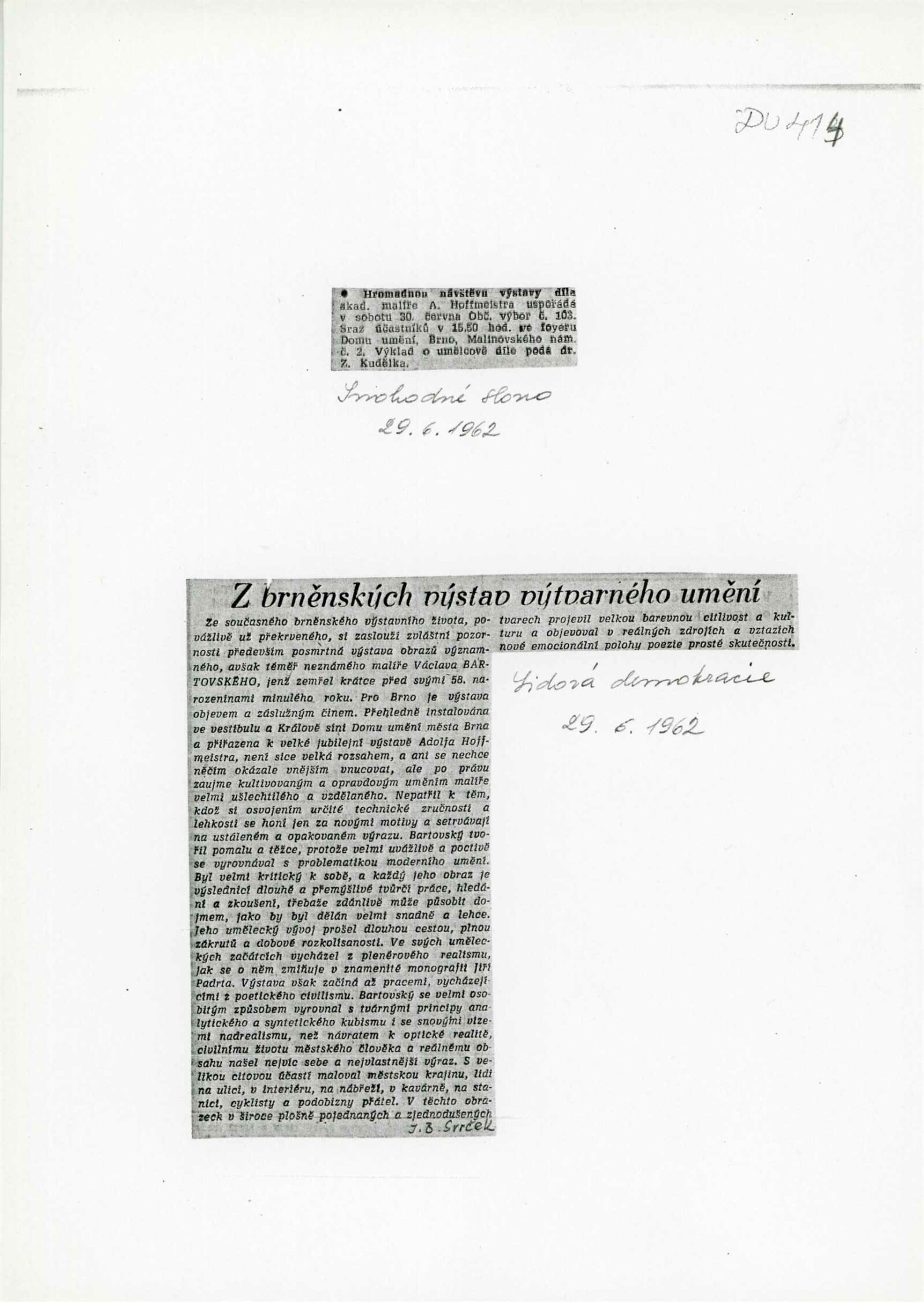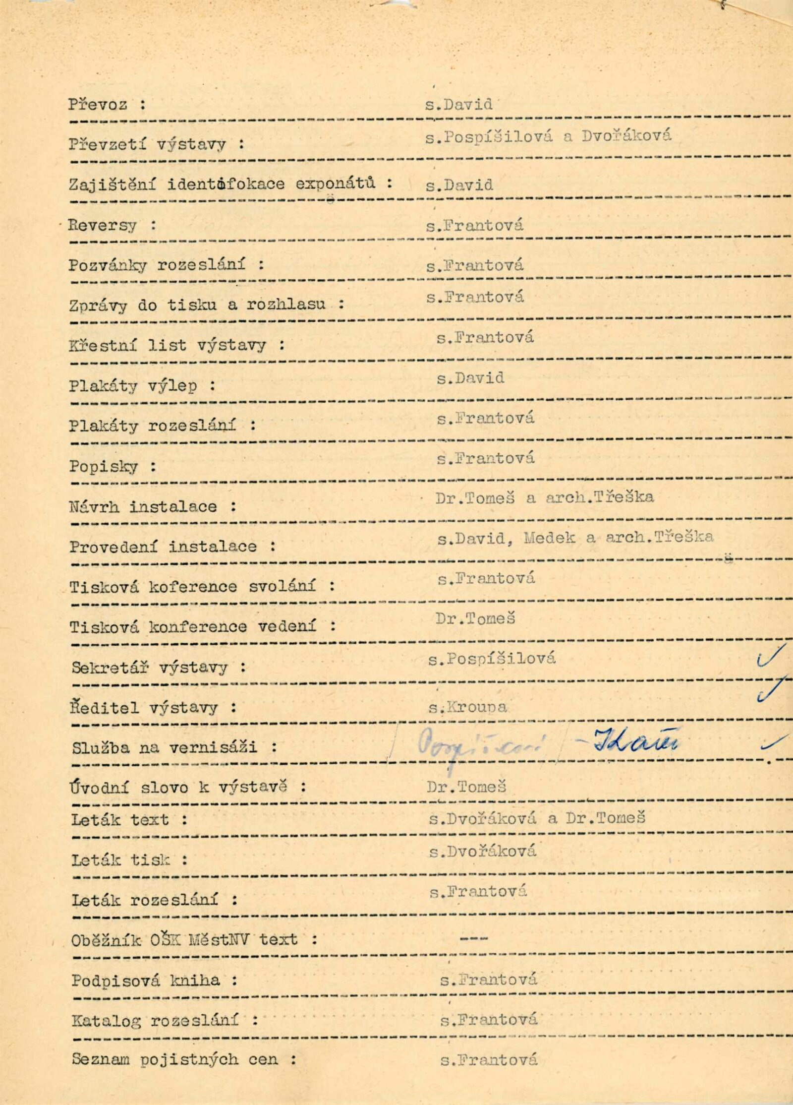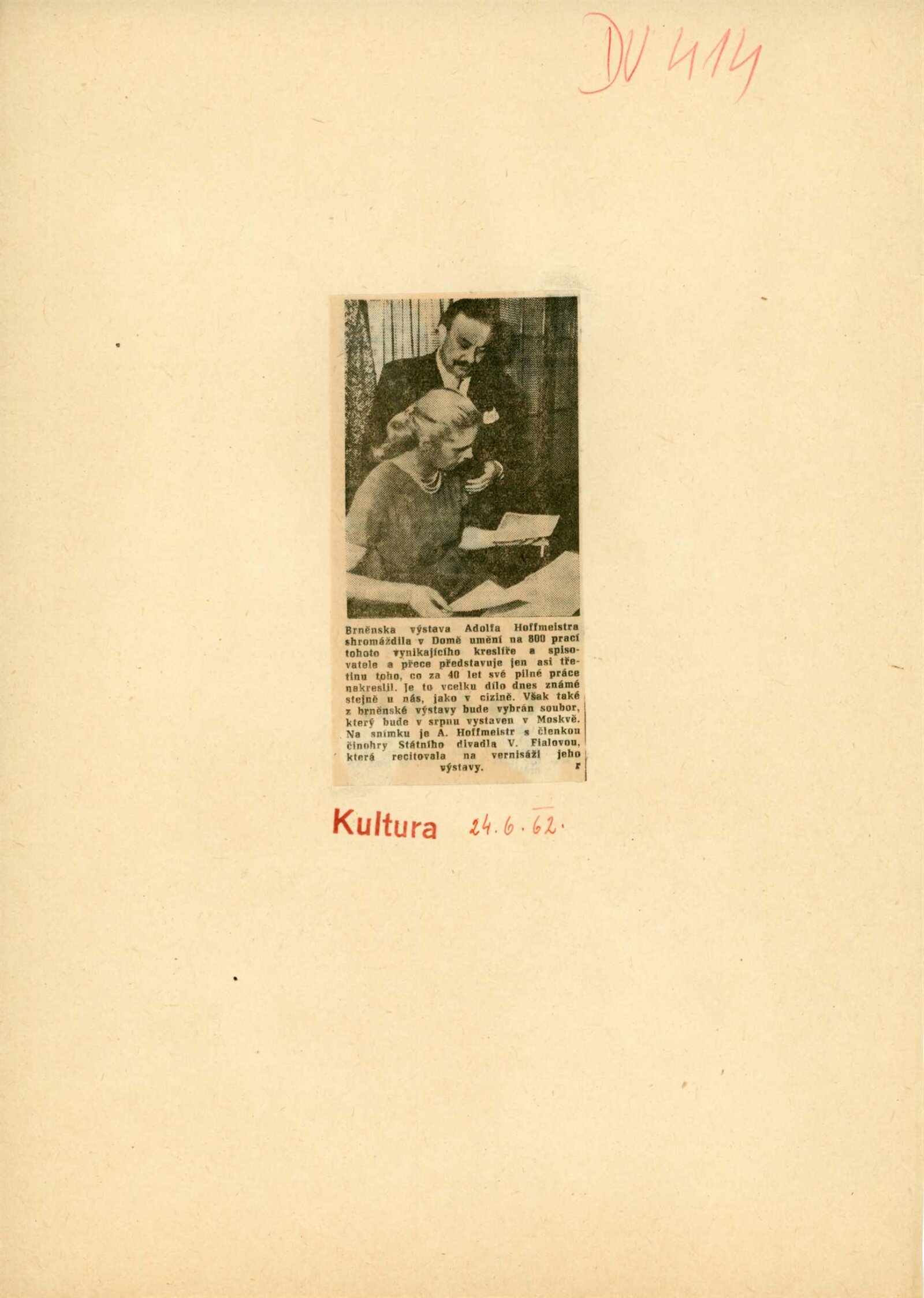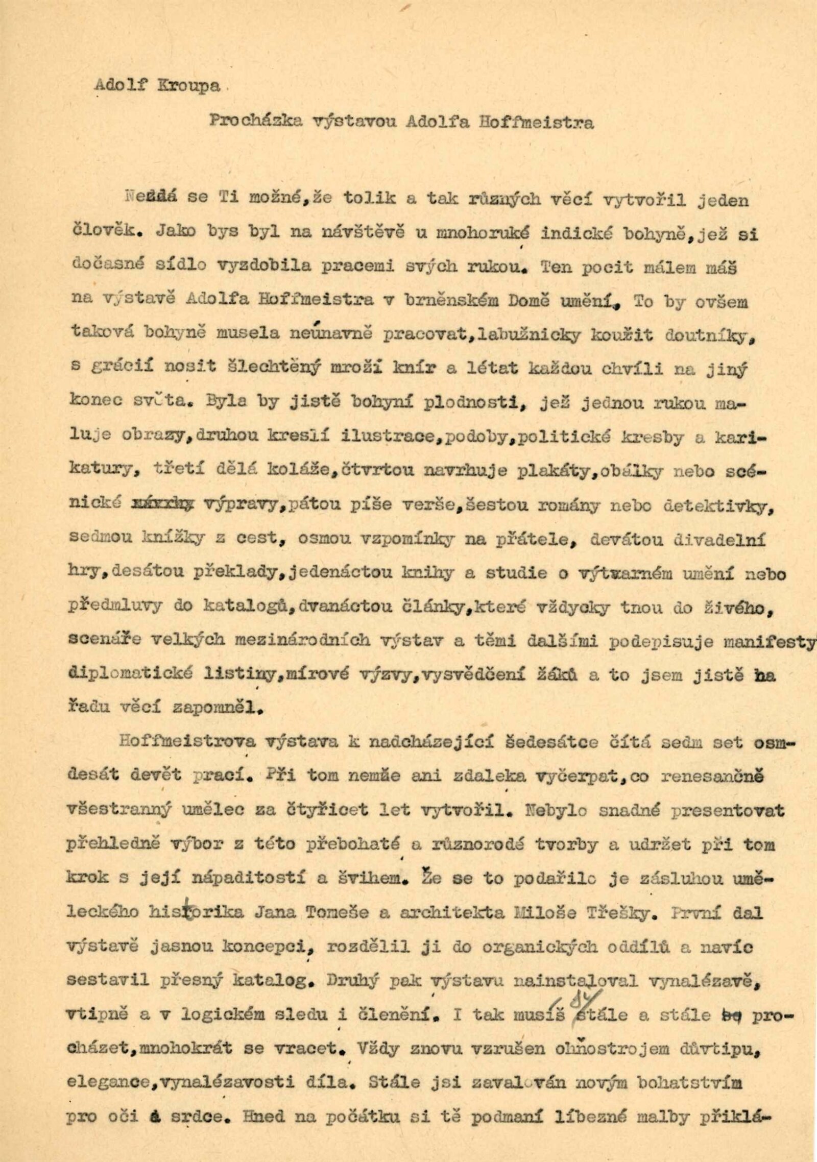 pozvánka, katalog, výstavní list, jména účastníků vernisáže (uvítání), texty Adolfa Kroupy a Jana Tomeše, texty pro katalog, seznamy prací, knih a dokumentačních materiálů, fotografie z vernisáže, korespondence (dopisy Adolfa Hoffmeistera, Jana Tomeše, arch. Třešky s Adolfem Kroupou), reverzy, recenze v tisku