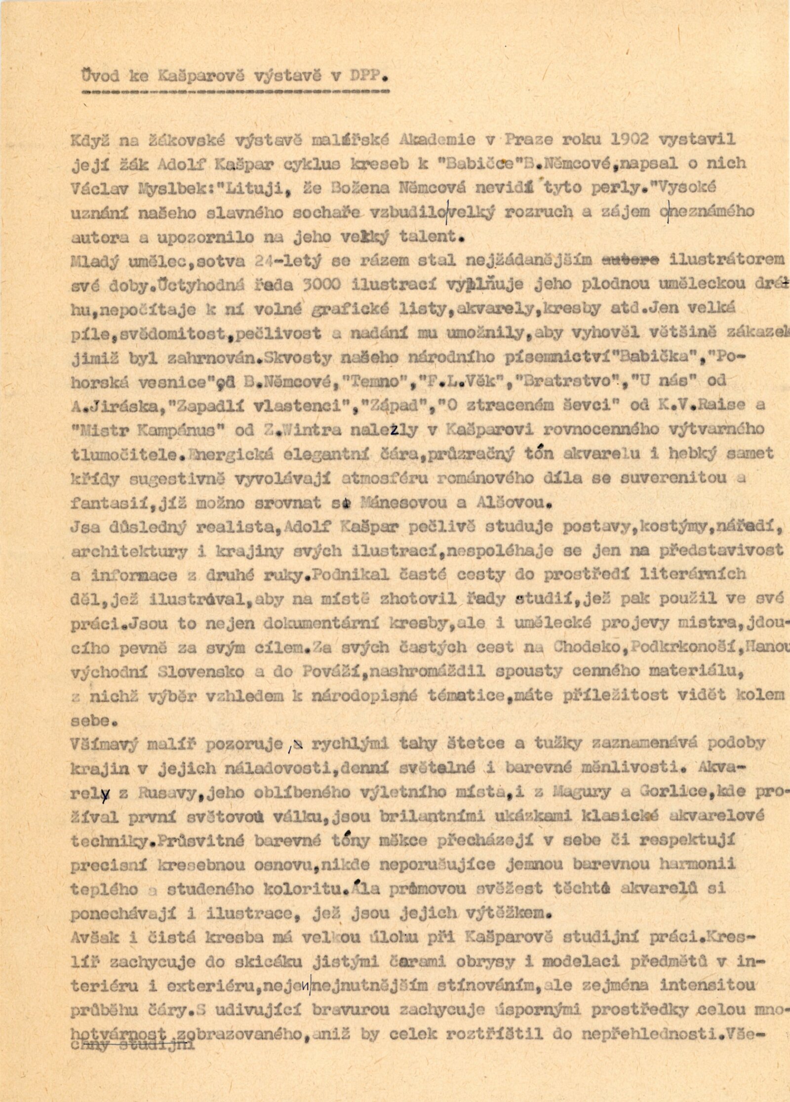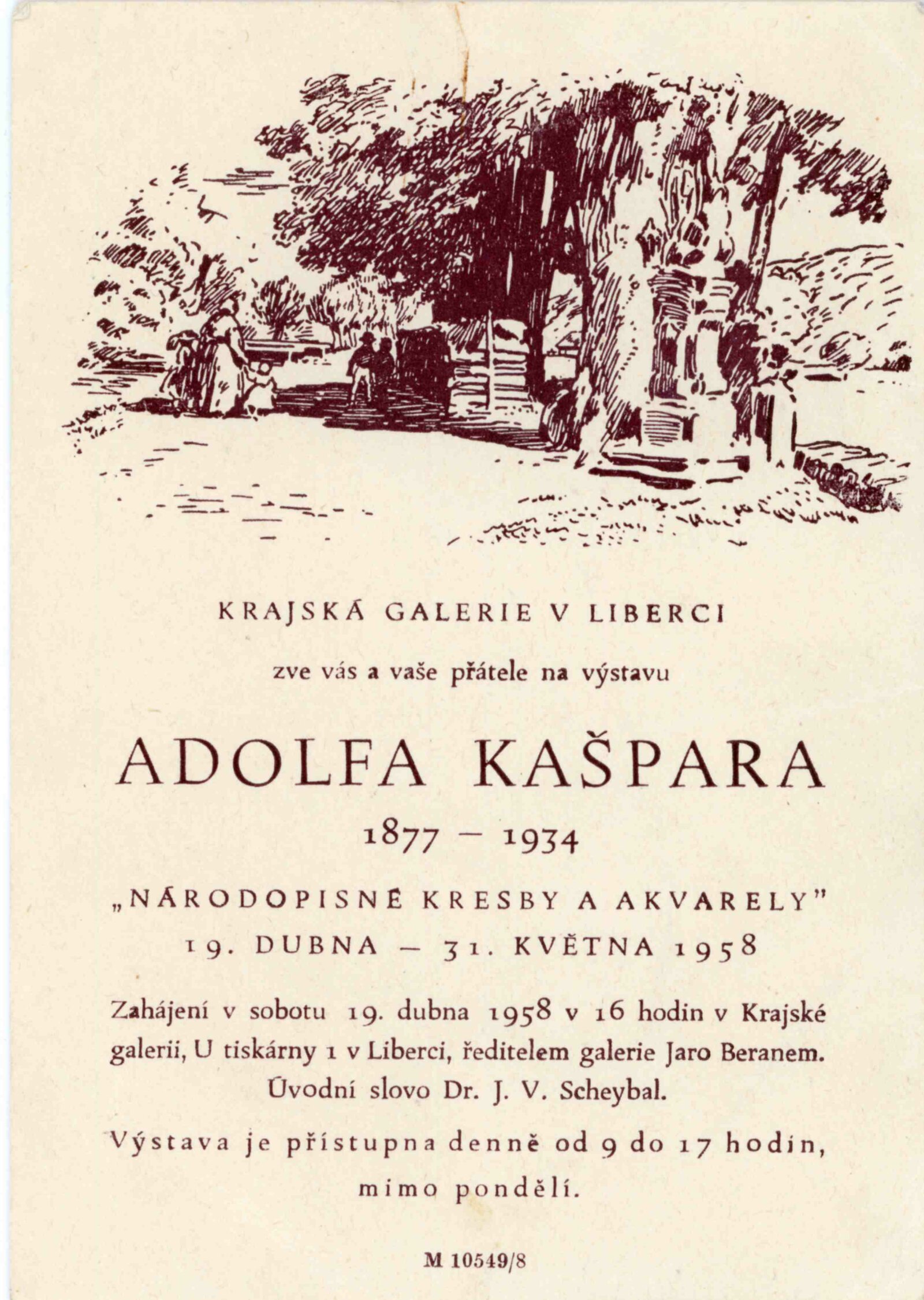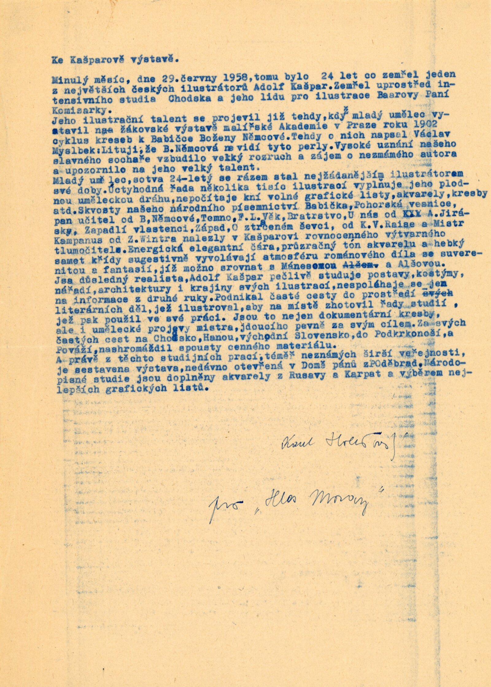 strojopis textu k výstavě (Karel Holešovský), korespondence (dopisy dcery umělce Jitky Horníkové-Kašparové, provozní korespondence), reversy, recenze v tisku, pozvánka z převzaté výstavy (Liberec)