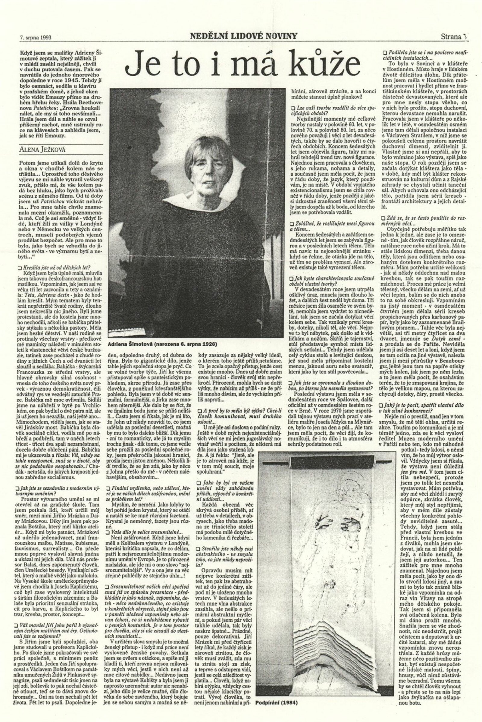 pozvánka, katalog z archivu Igora Zhoře s poznámkami a recenzí v Rovnosti, fotografie z vernisáže, žádost o povolení výstavy, materiály o Adrieně Šimotové, úvod katalog a proslov Jaromíra Zeminy pro připravovanou výstavu v Hostinném v 1980 - neuskutečnila se, katalog k výstavě Adrieny Šimotové v Klubu školství a vědy B. Václavka v Brně (1978) a v Malé galerii VŠ veterinární v Brně (1984), pozvánka Olomouc (1993), výstřižek Lidové noviny 1993 - rozhovor s Adrienou Šimotovou