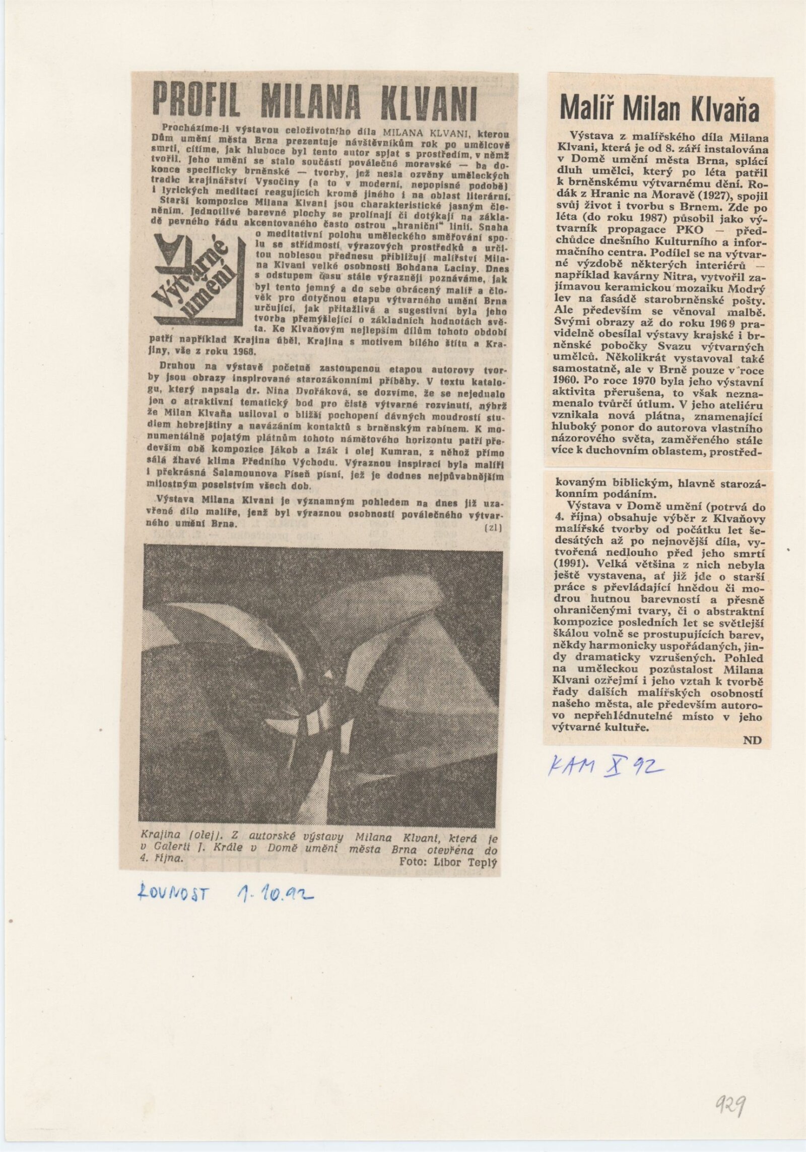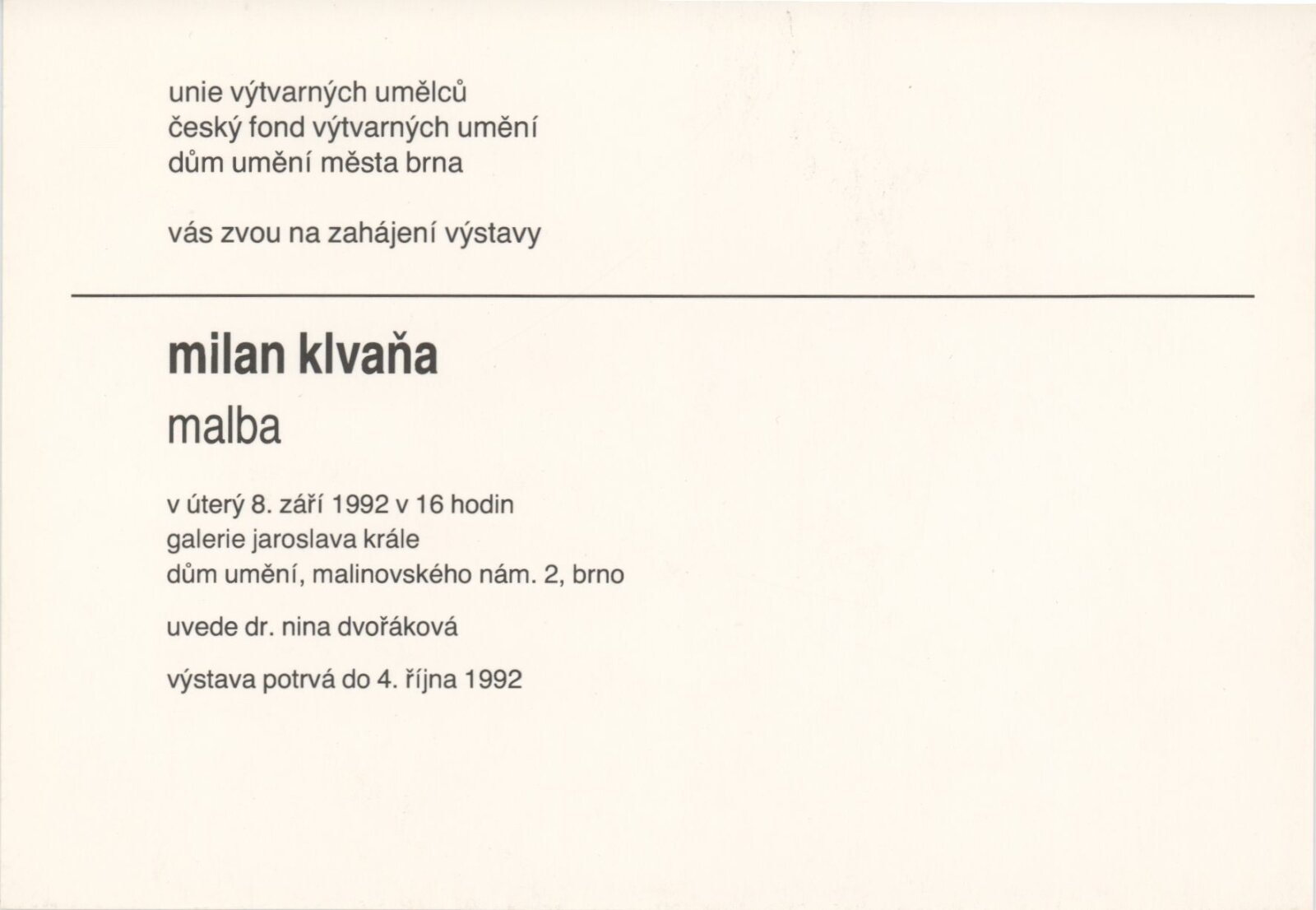Akademický malíř Milan Klvaňa 1927–1991: Dům umění města Brna, 171. výstava v Galerii Jaroslava Krále, 8. 9. – 4. 10. 1992 / Text: Nina Dvořáková. – Brno: UVU, 1992. – 8 s., obr., portrét, životopis, DU 929. – MG