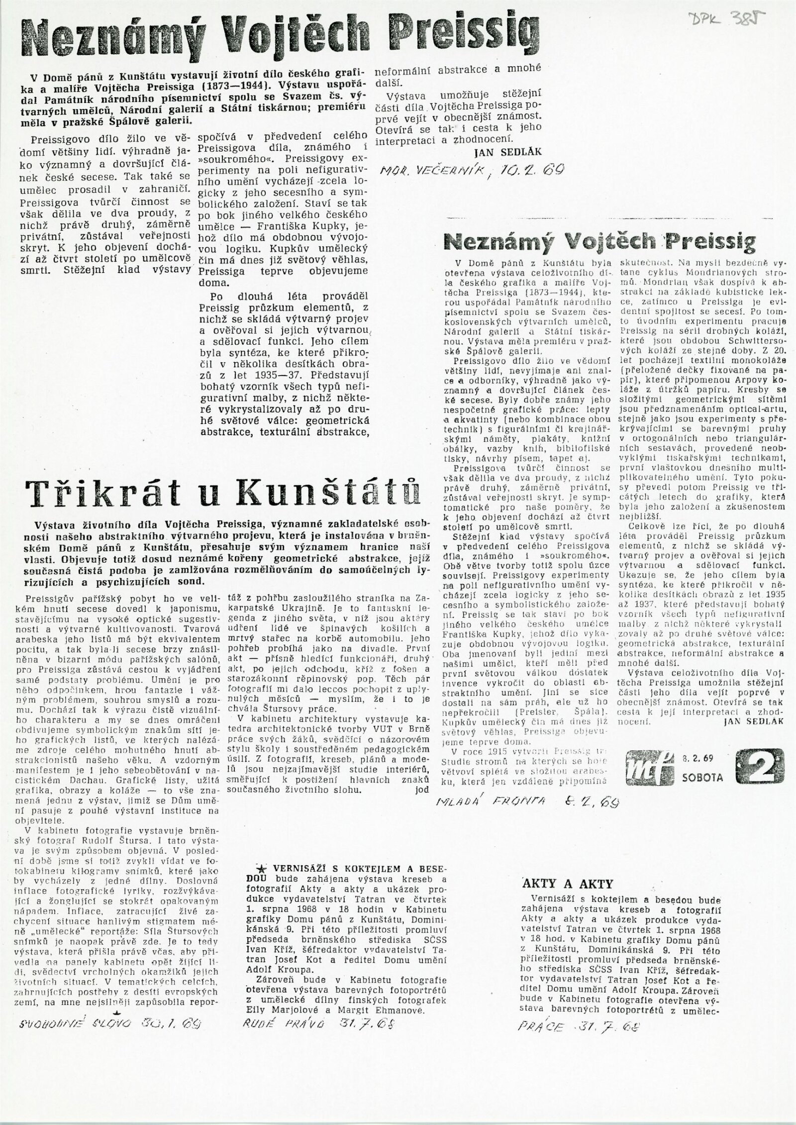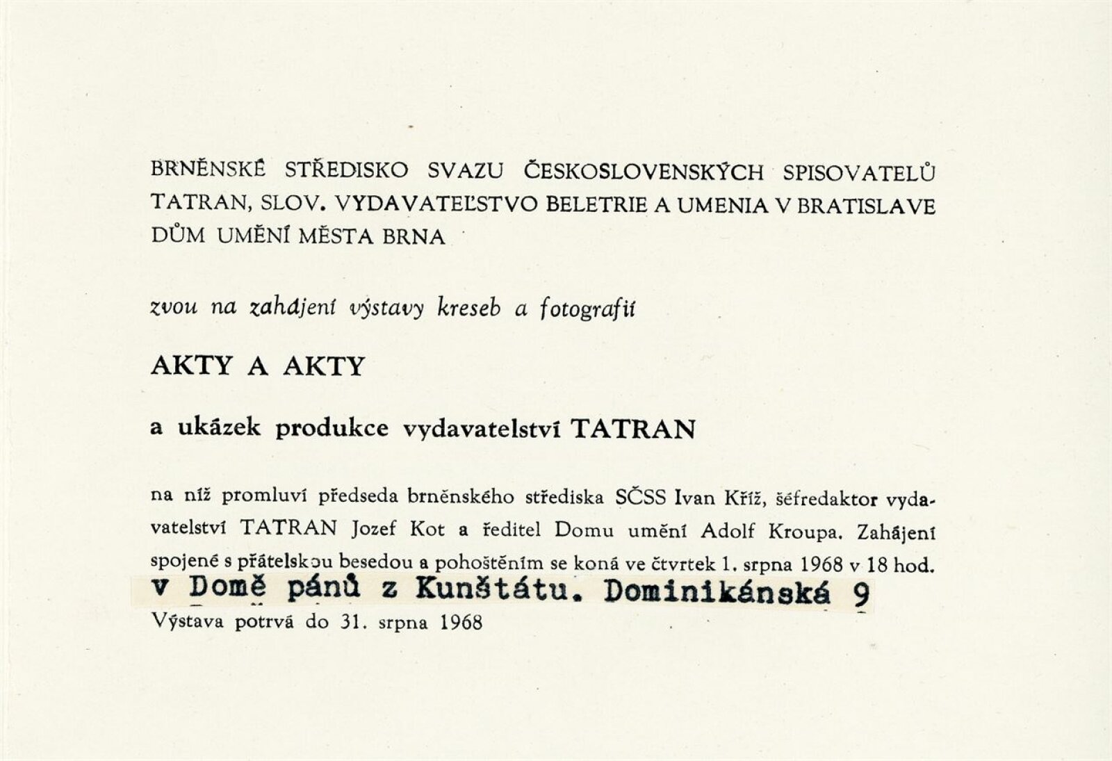 Akty a akty. Výstava kreseb a fotografií. Ukázky produkce vydavatelství Tatran: Dům umění města Brna / Dům pánů z Kunštátu, Kabinet grafiky, 1. 8. – 31. 8. 1968 / Vyšla publikace téhož názvu. Akty a akty / Knihu sestavili a texty napsali: Zdeněk Pilař, Jan Řezáč. – Bratislava: Tatran, 1968. – 4 s., 125 obr., DPK 385. – MZK