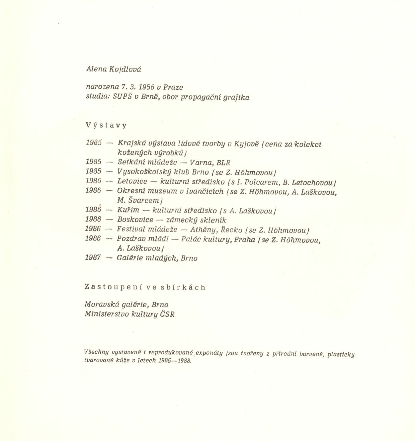 Alena Kojdlová. Možnosti kůže: Galerie Stará radnice, přízemí, 14. 3. – 16. 4. 1989 / Text: Karel Holešovský. – Brno: DUmB, 1989. – [13] s., obr., životní data, výstavy, zastoupení ve sbírkách, GSR 43. – MZK; MG; MMB