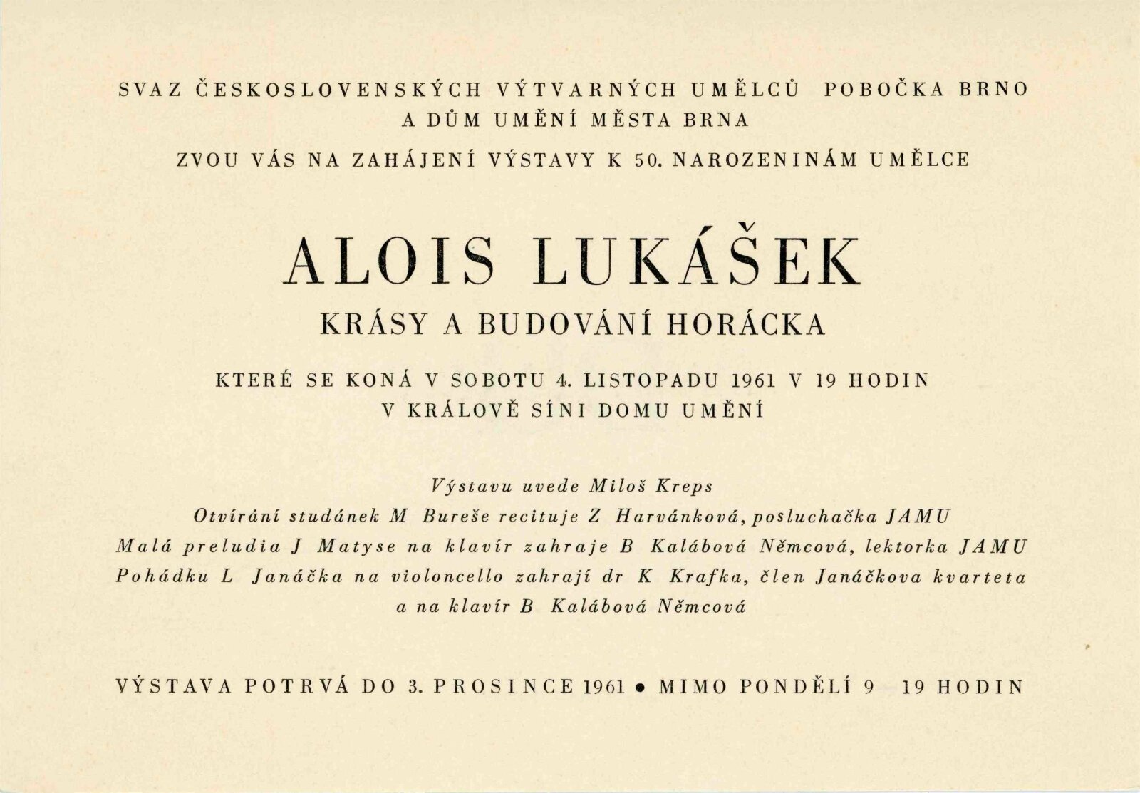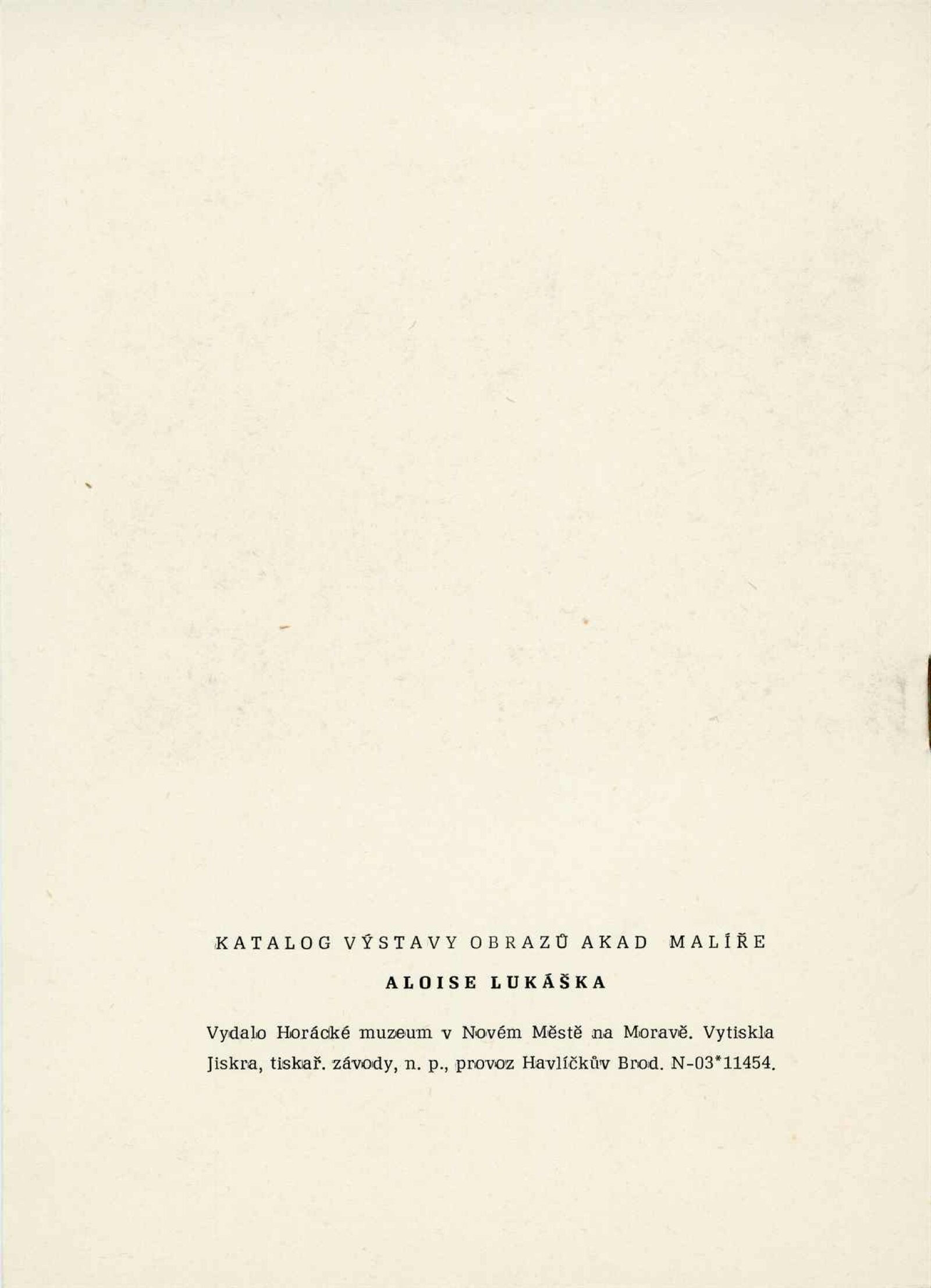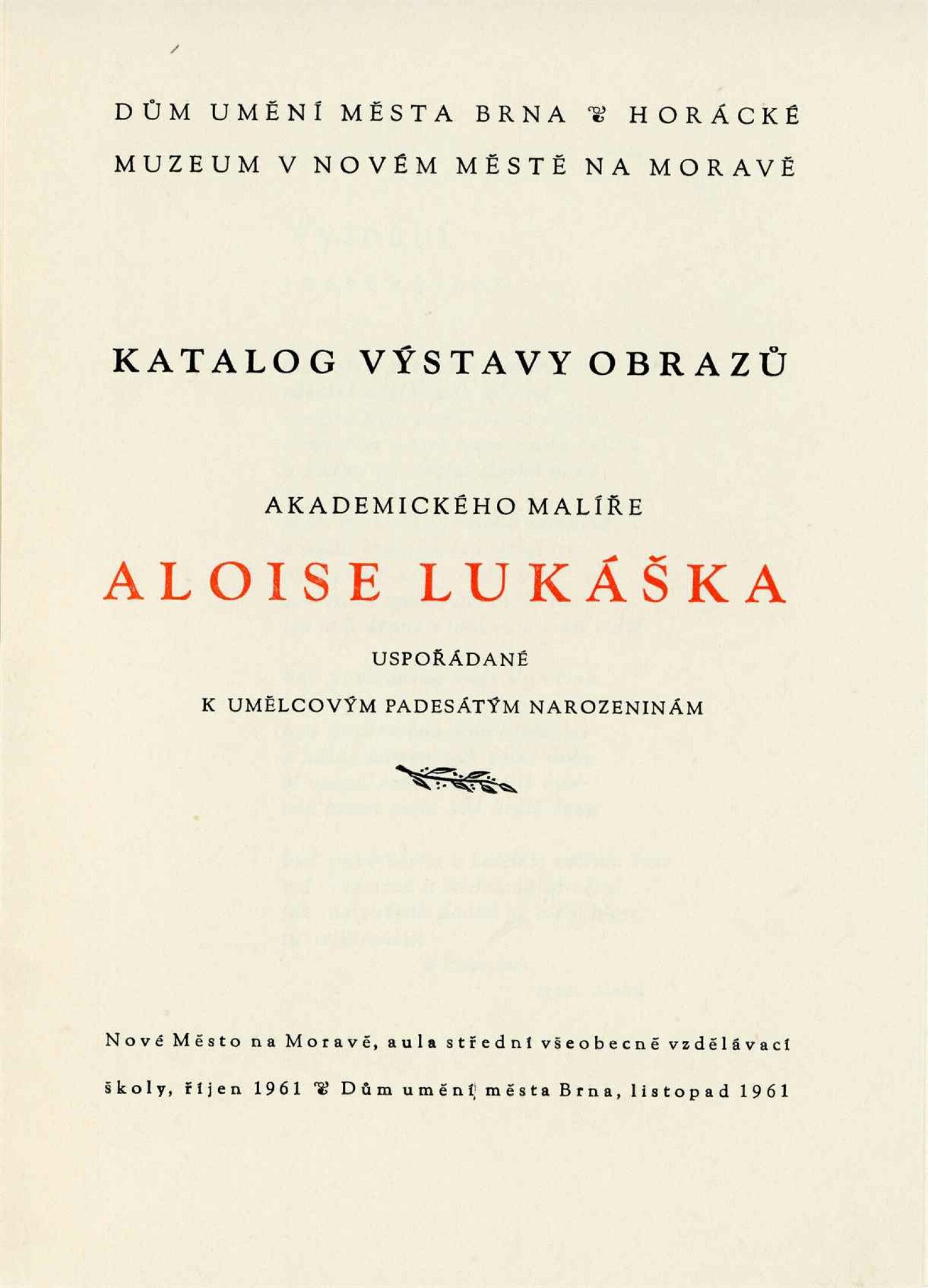 Alois Lukášek k umělcovým padesátým narozeninám: Dům umění města Brna, Malá galerie, 4. 10. – 3. 12. 1961 / Text: Miloš Kreps. – Nové Město na Moravě: Horácké muzeum, 1961. – 10 s., obr., seznam obrazů 1 s., DU 405. – MG