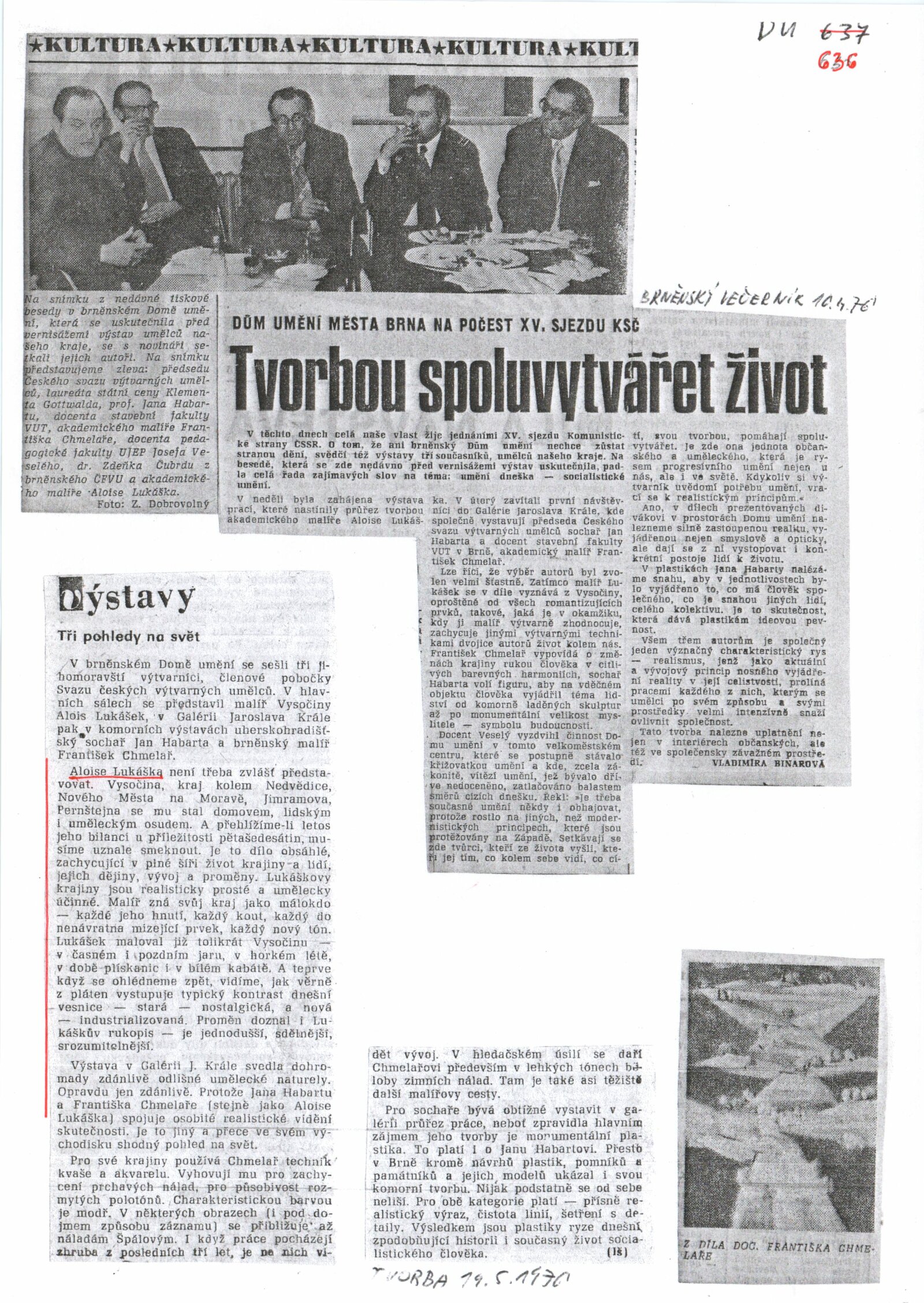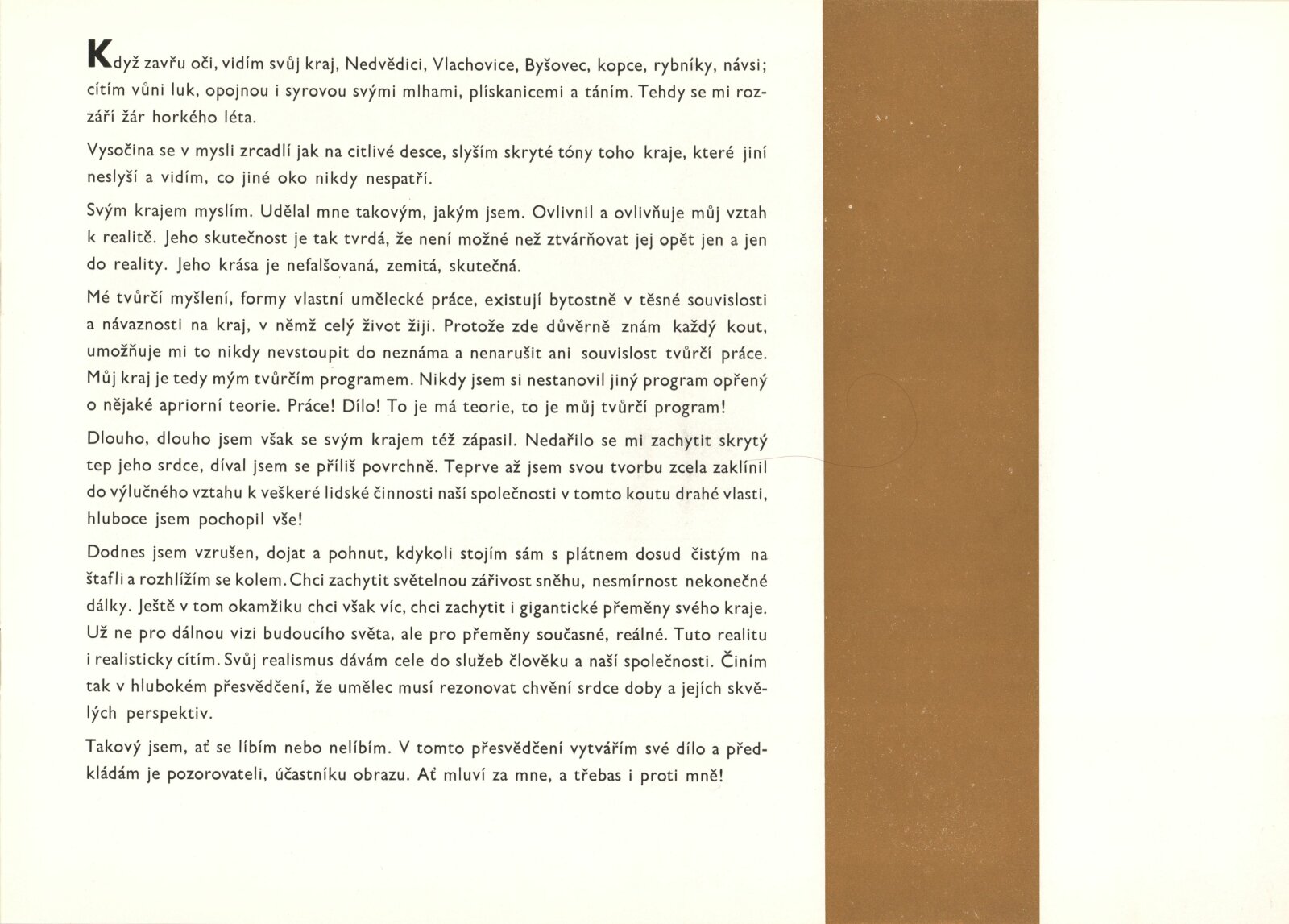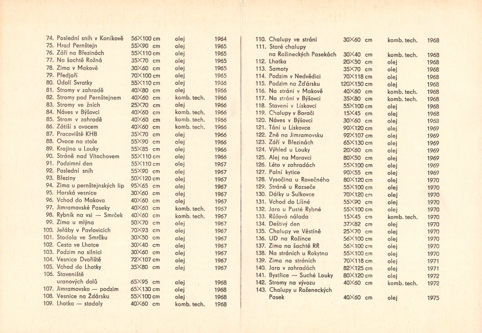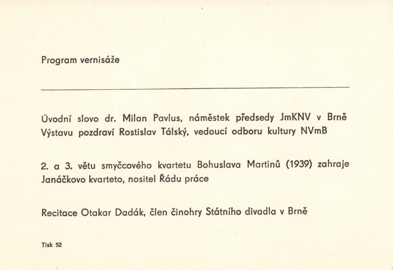 pozvánka, katalogy, seznam vystavených děl, fotografie vernisáže a výstavy, prezenční listina, zápůjční listy, zápis o jednání k výstavě, smlouva, žádost umělce o výstavu v DU, žádost o povolení výstavy, recenze v tisku, katalogy předchozích výstav (DU Brno 1959, 1961, DU Zlín – Galerie Vysočiny Jihlava 1981–1982)