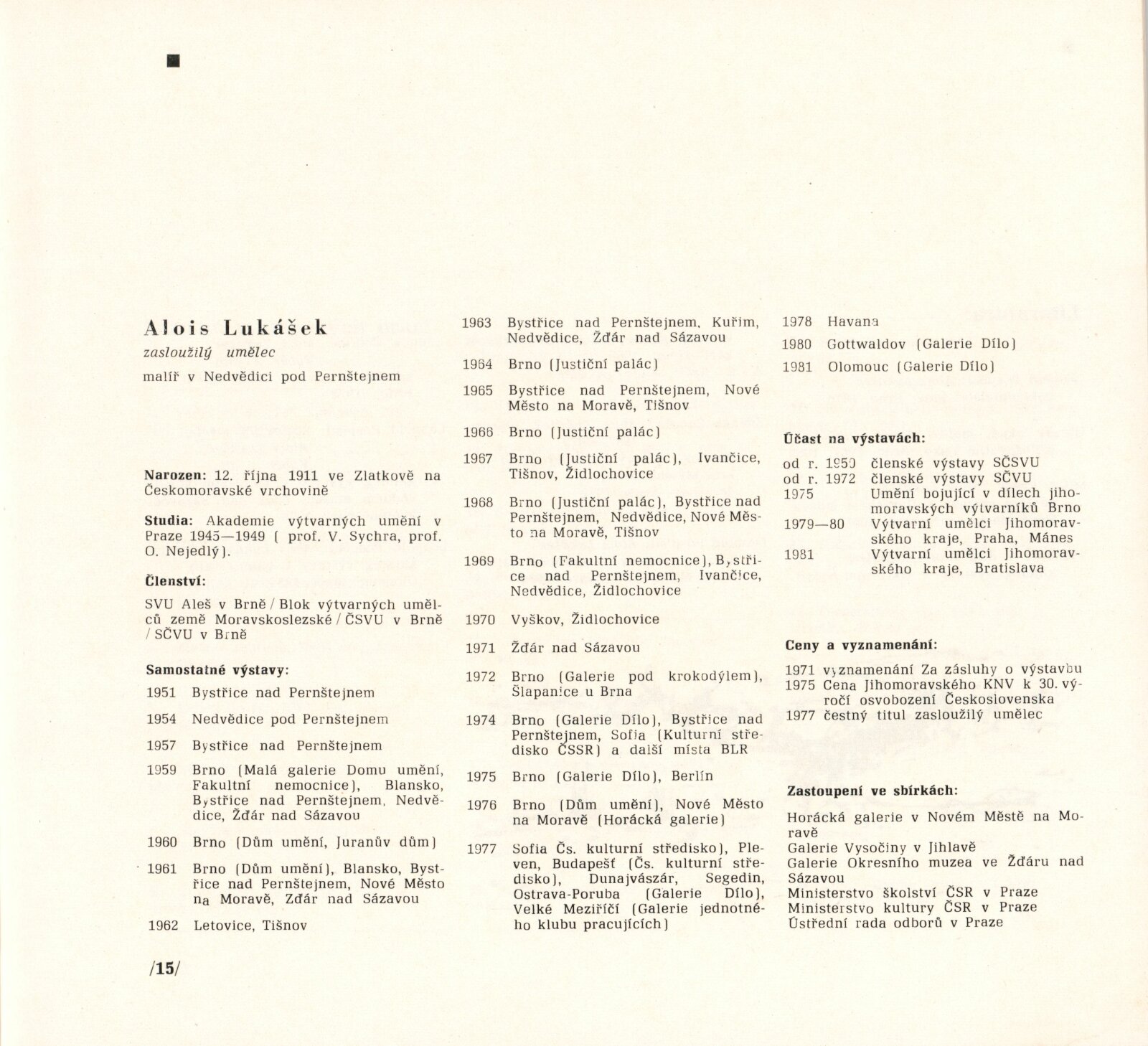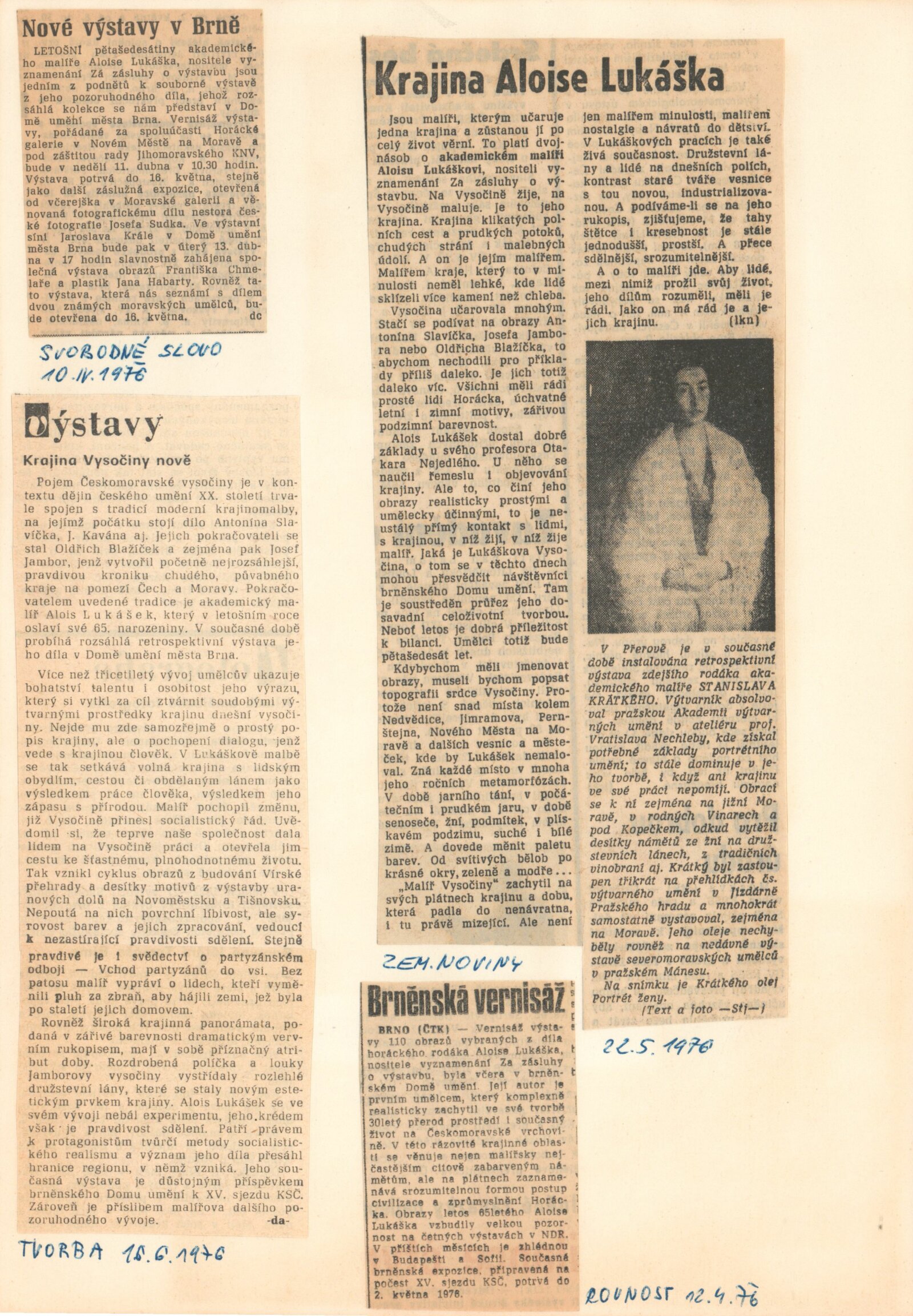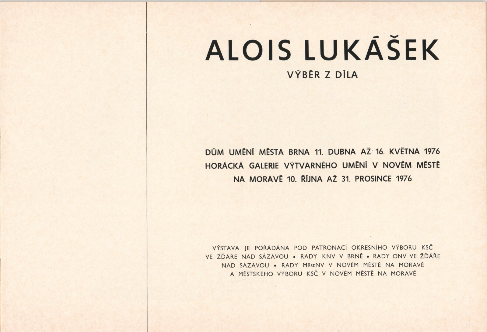 Alois Lukášek. Výběr z díla: Dům umění města Brna, 11. 4. – 16. 5. 1976 / Texty: Rudolf Hegenbart, Zdeněk Čubrda. – Nové Město na Moravě: Horácká galerie výtvarného umění, 1976. – 40 s., obr., katalog 1 l., portrét, životní data, výstavy, současně vydán zkrácený katalog s textem autora / Alois Lukášek / Brno: Blok pro Dům umění města Brna, 1976. – 12 s., obr., DU 636. – Kubíček 7884; MZK; MG; MMB