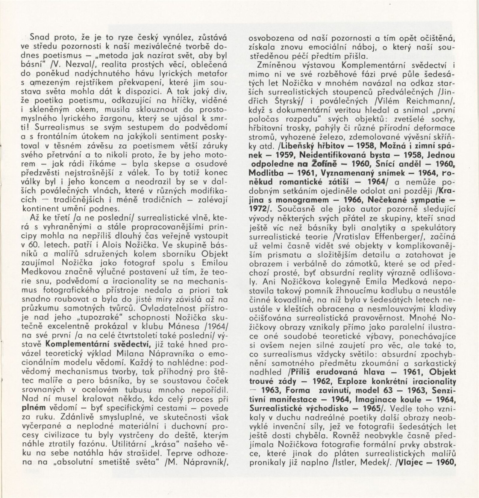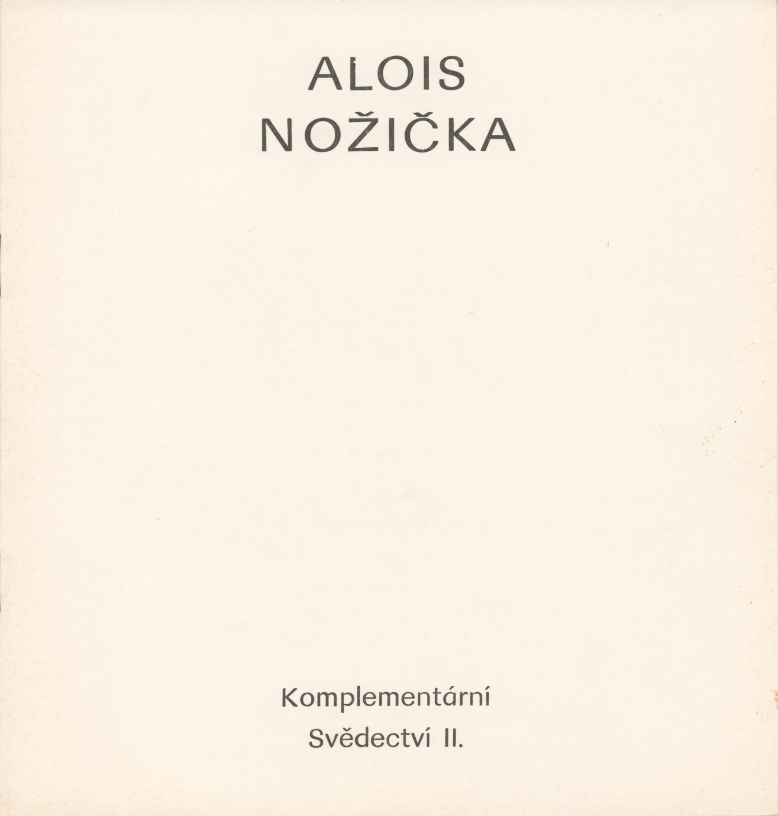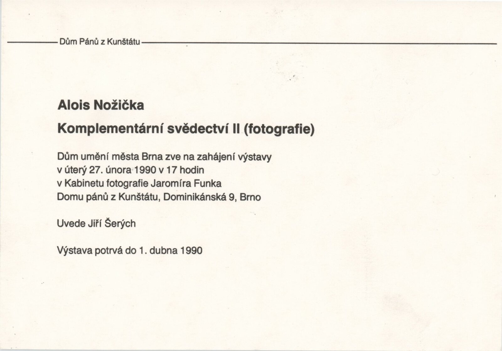 Alois Nožička. Fotografie a koláže. Komplementární svědectví II. 1959–1989: Dům umění města Brna / Dům pánů z Kunštátu, Kabinet fotografie Jaromíra Funka, 27. 2. – 1. 4. 1990 / Text: Jiří Šerých. – Brno: DUmB, 1990. – [9] s., obr., životní data, DPK 933. – MZK; MG