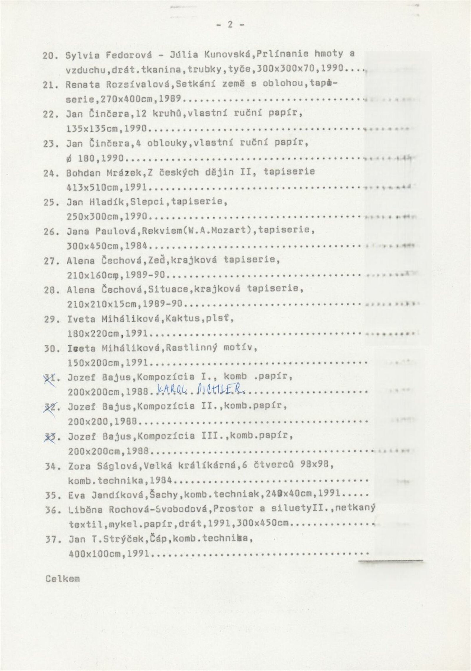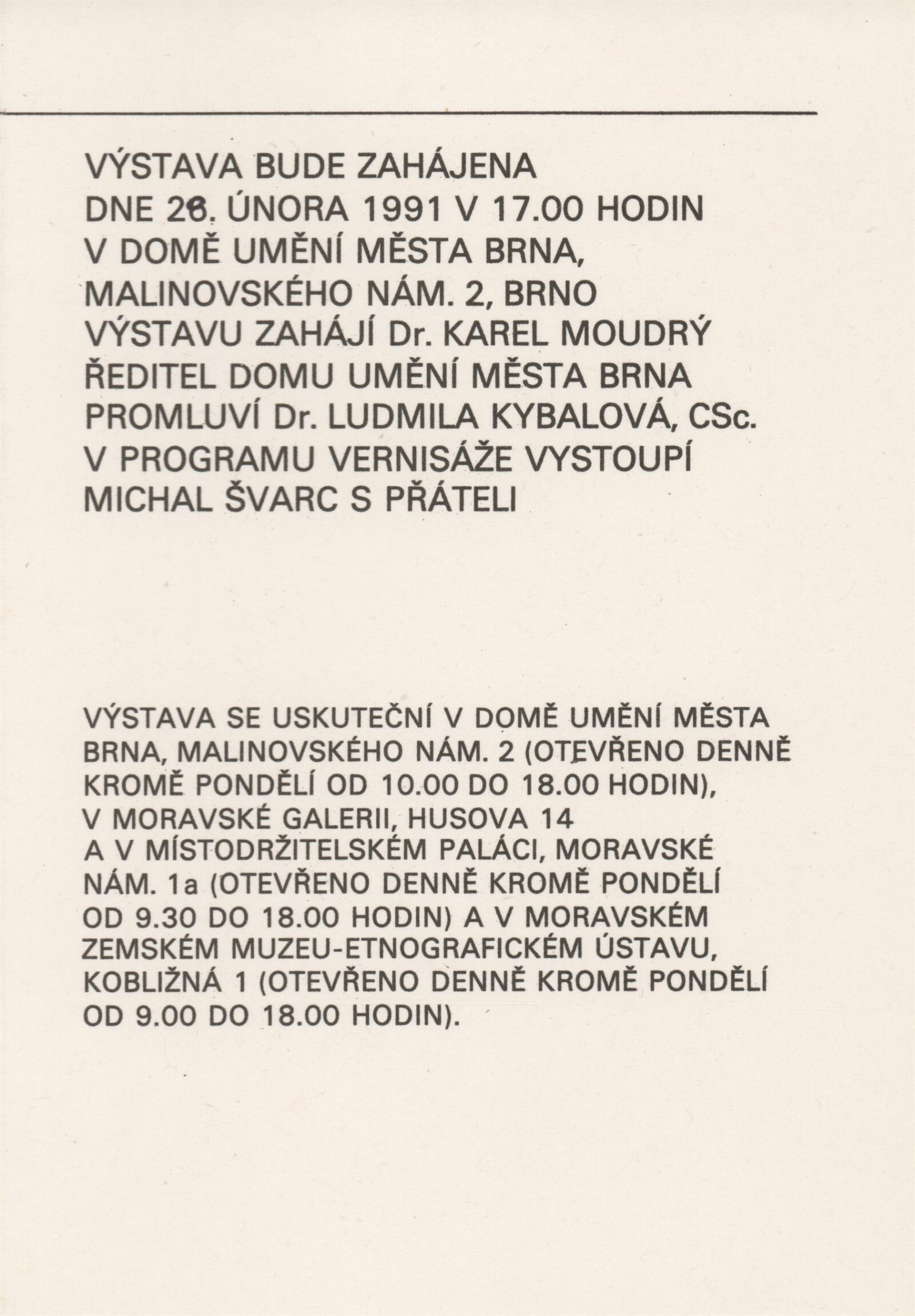 Alternativy české a slovenské tapiserie: Dům umění města Brna, [hala], Moravská galerie v Brně, Místodržitelský palác, Etnografický ústav, 28. 2. – 31. 3. 1991 / Text: Ludmila Kybalová. – Brno: Unie výtvarných umělců. 1991. – [40] s., obr. / Antonín Kybal (1901–1971). Tapiserie: soupis realizovaných tapiserií [1] s., životní data vystavujících, výstava Kybalových tapiserií byla v Etnografickém ústavu, DU 897. – MG