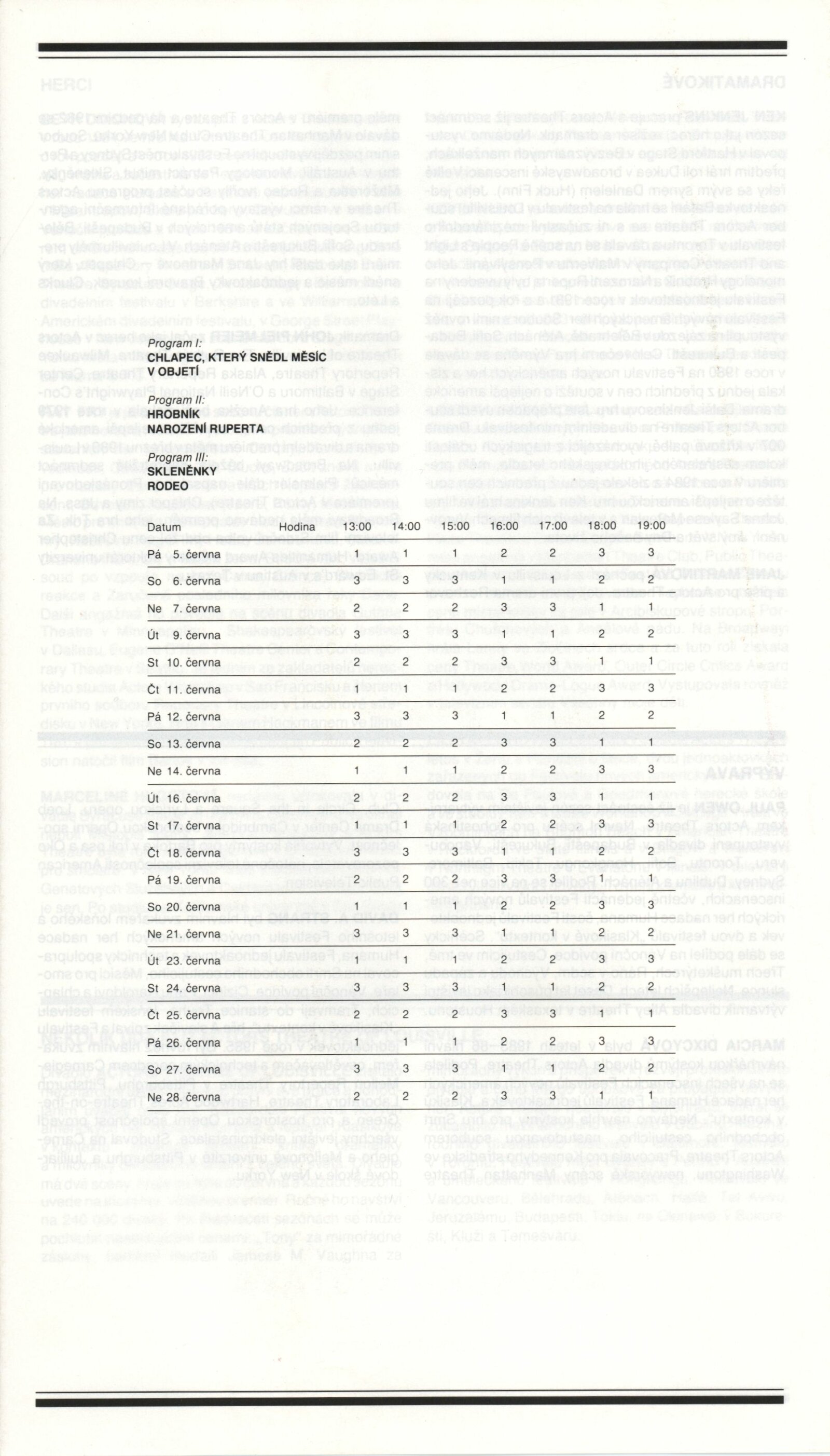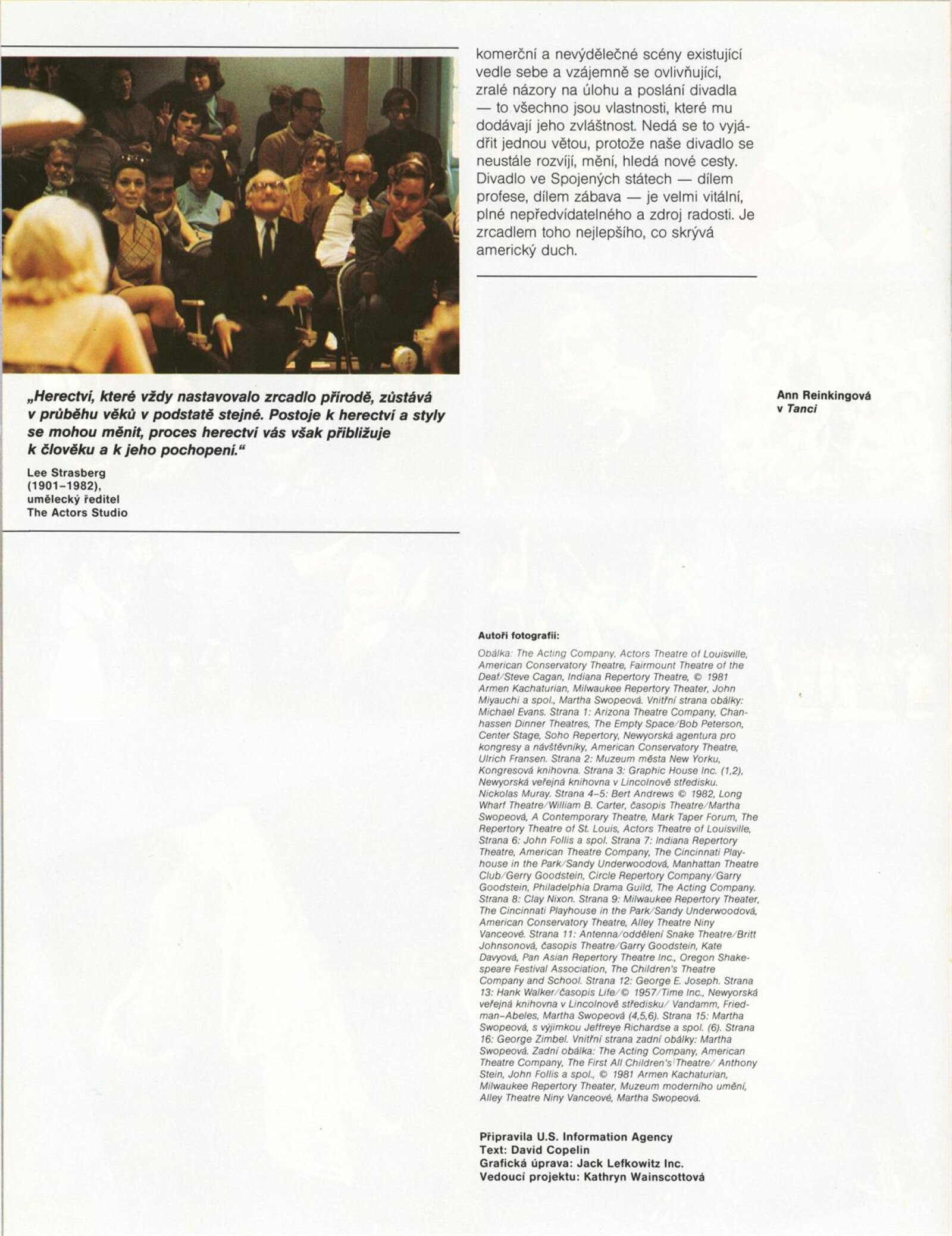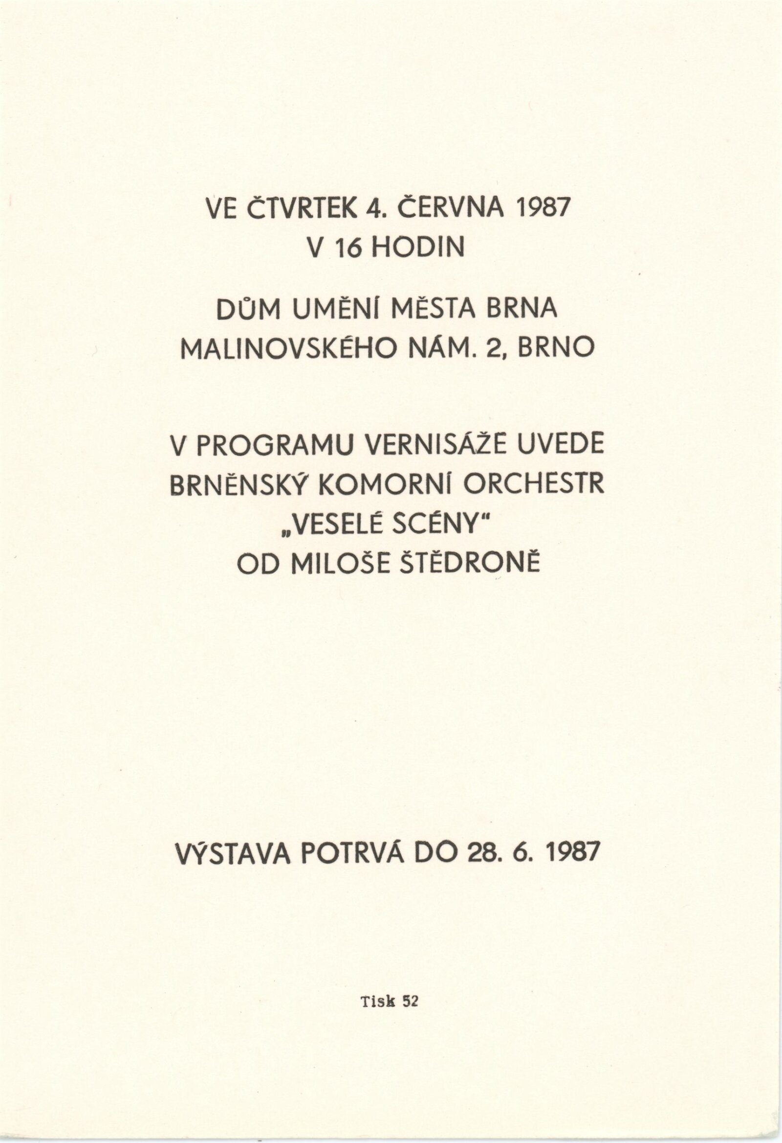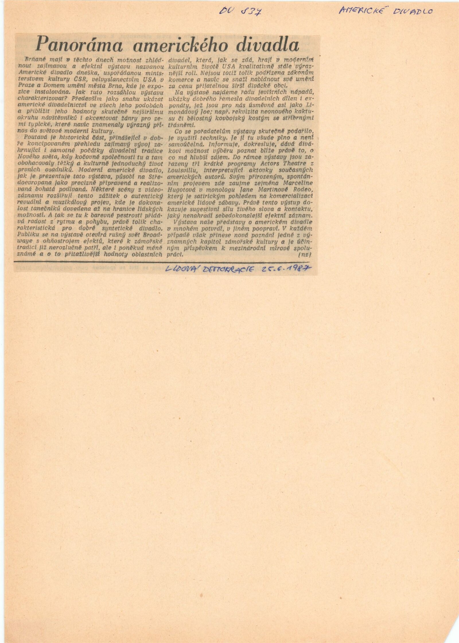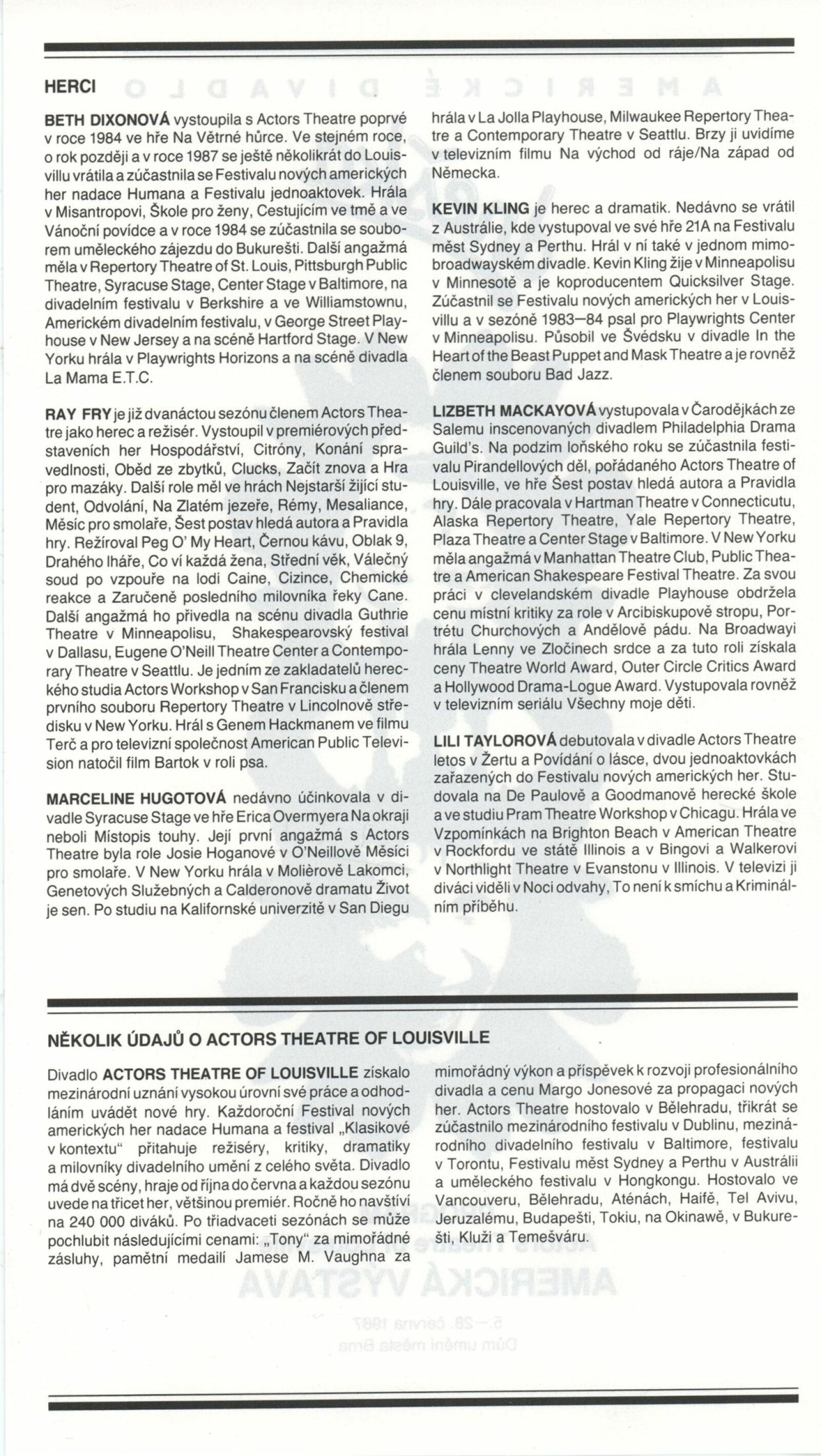 Americké divadlo dneška: Dům umění města Brna, 4. 6. – 28. 6. 1987 / Převzatý katalog. Americké divadlo dneška / Text: David Copelin. – B.m., U. S. Information Agency, [1987 ?]. – [20] s., obr. / K doprovodnému programu vydán program. “Actors Theater of Louisville” Americká výstava: Dům umění města Brna, 5. 6. – 28. 6. 1987 / Brno: DUmB, 1987. – skládačka (6 s.), DU 837. – MG